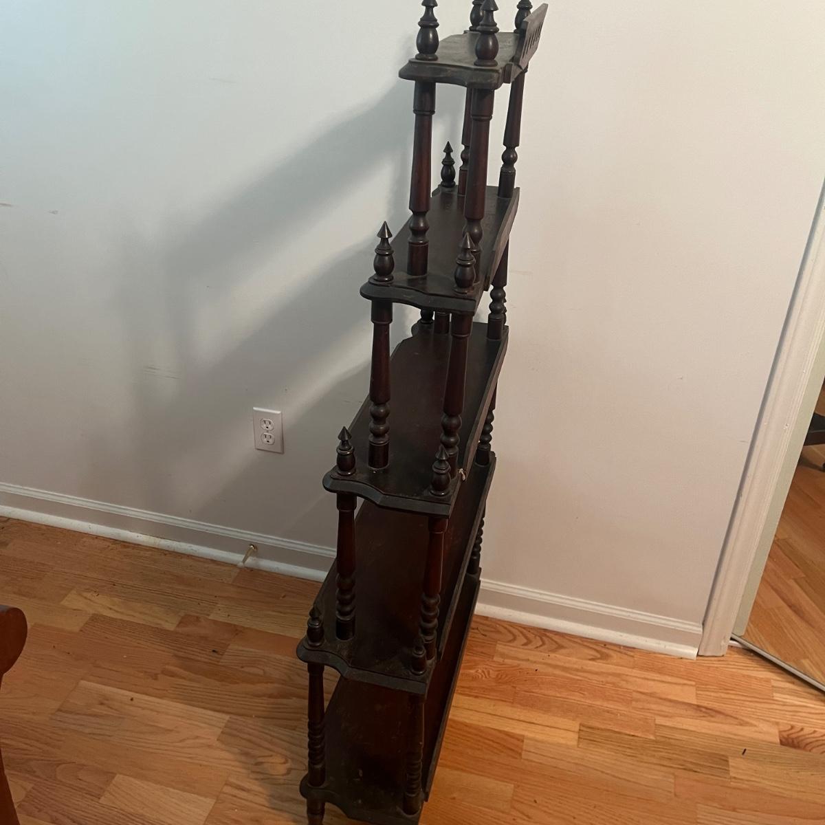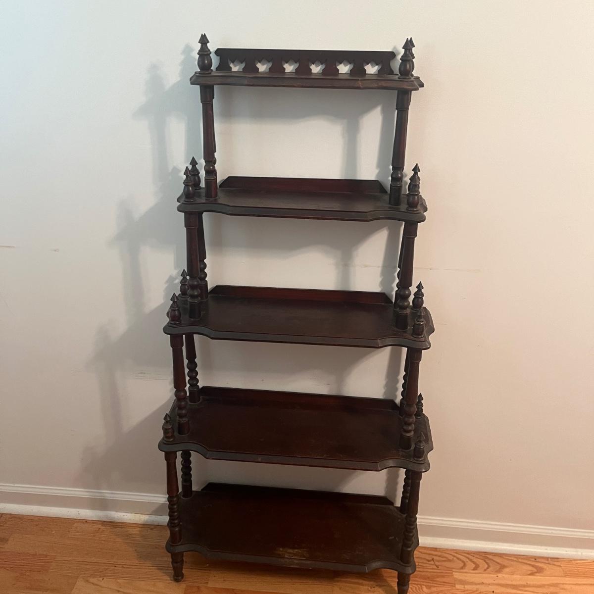 Lot includes a vintage Victorian style wooden five tier graduated etagere shelf that is mahogany colored. It measures 27” x 9” x 55”H. Shelf has scratches and nicks and is missing one spindle top and has a crack on top piece. Please see pictures.