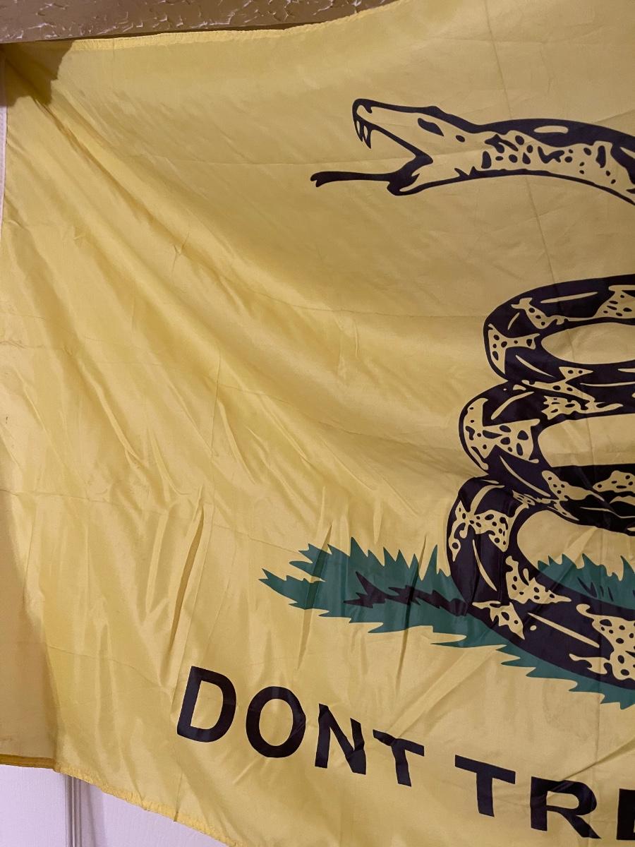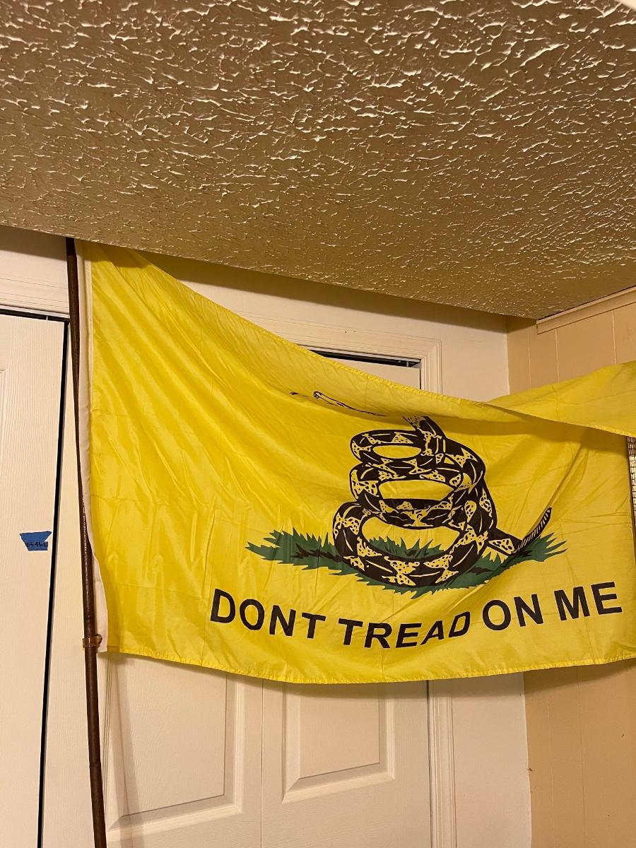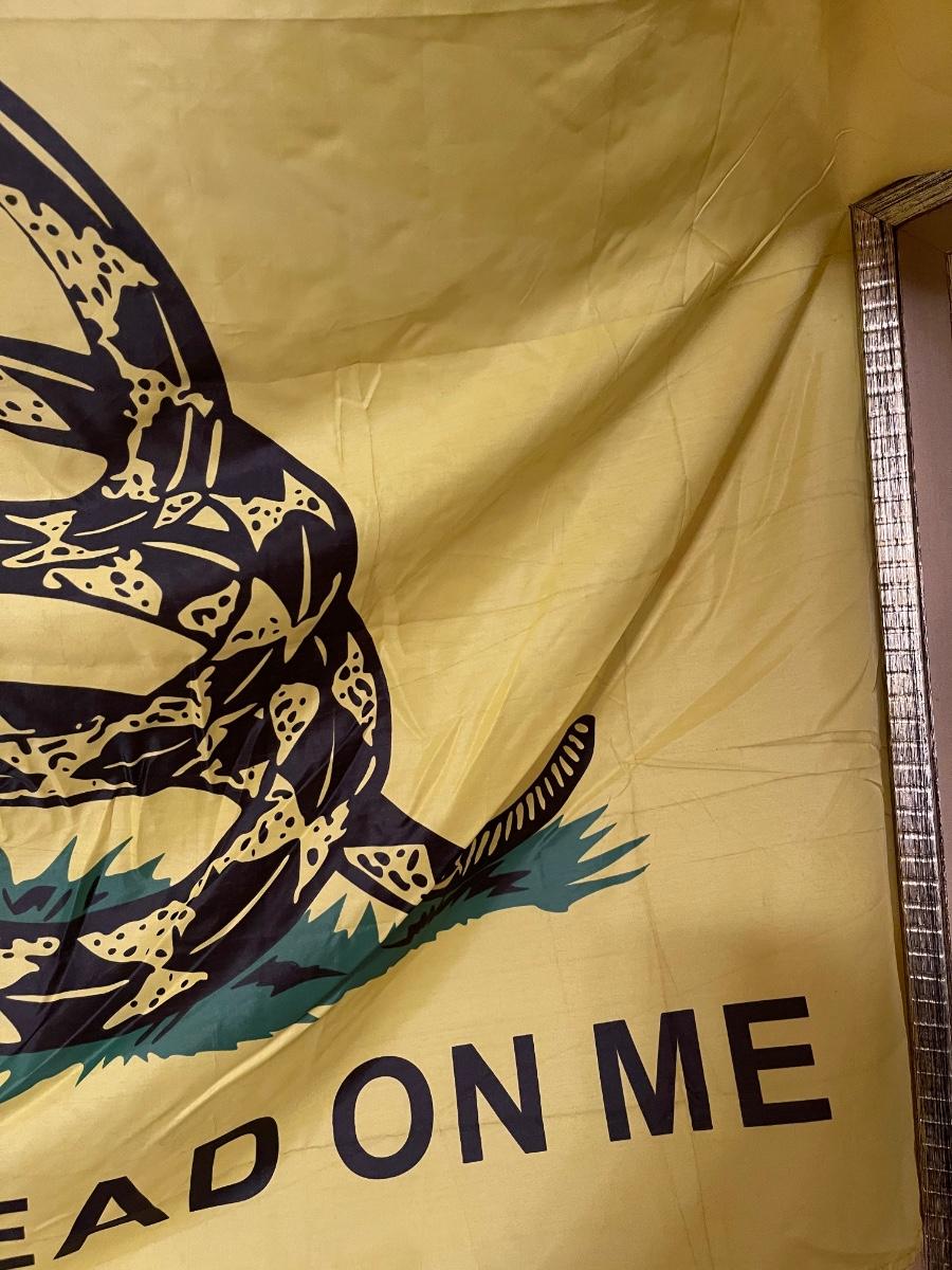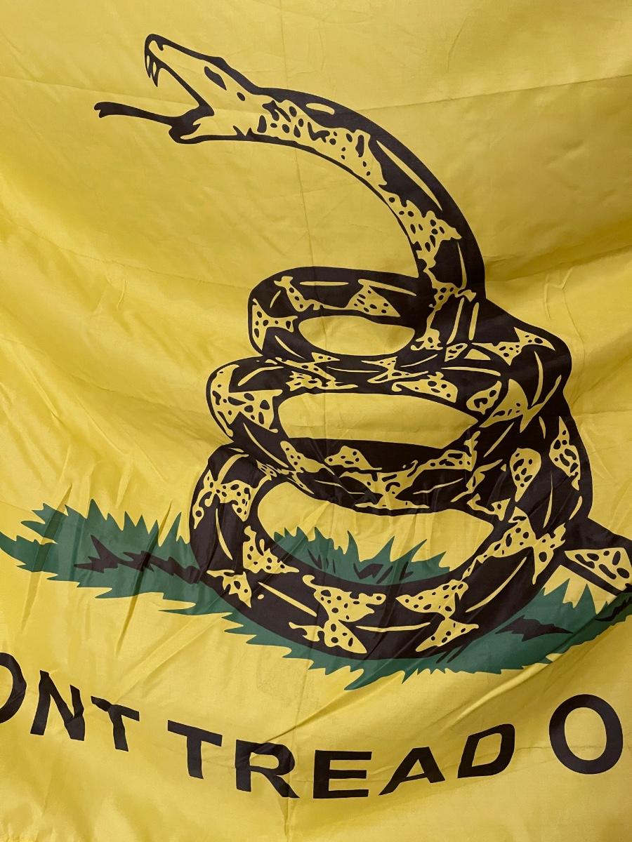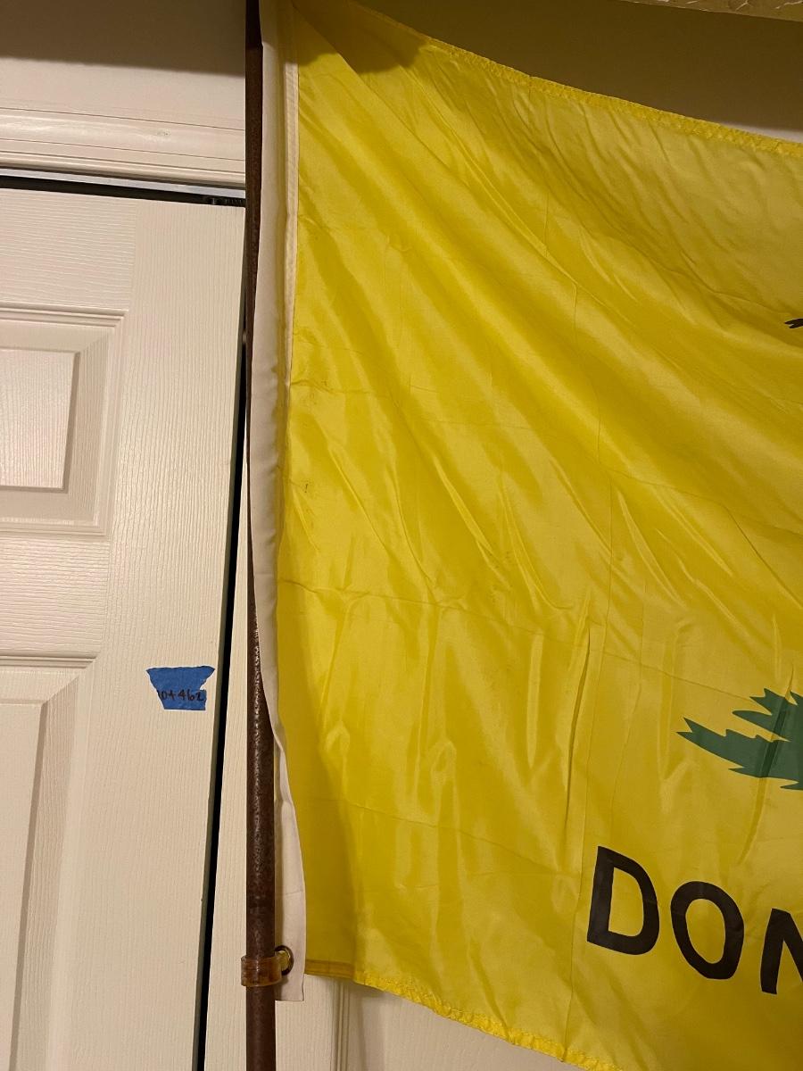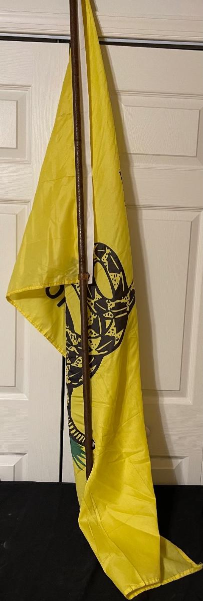 Huge vintage "Don't Tread on Me" flag on wooden pole