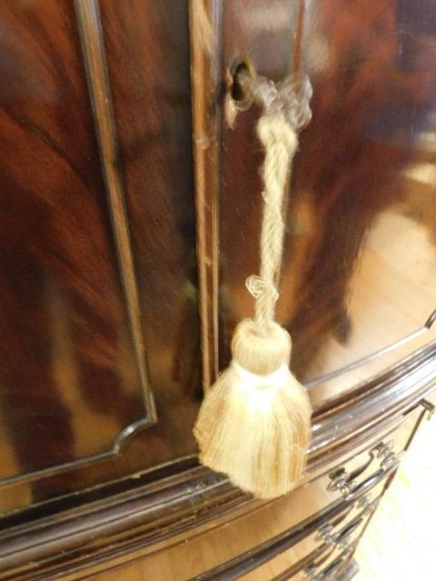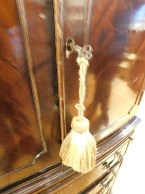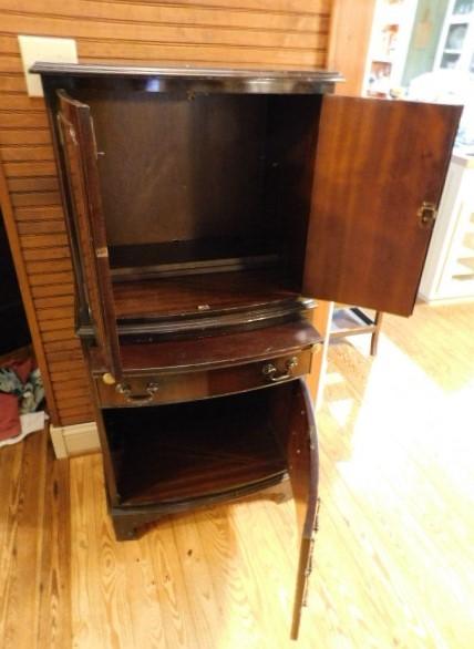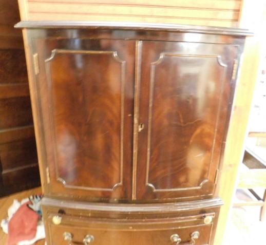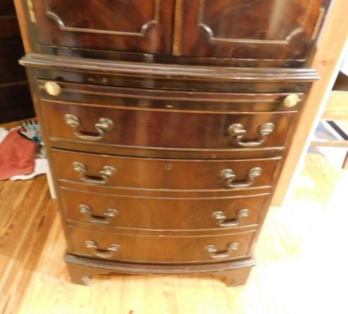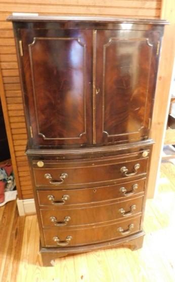 Vintage Flame Mahogany Chest 24"x16"x21" has some wear and scuffs to the finish. Has key for top doors