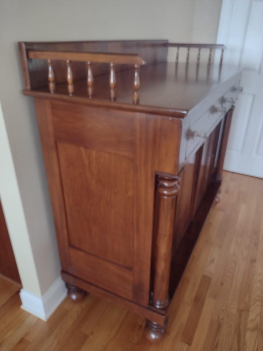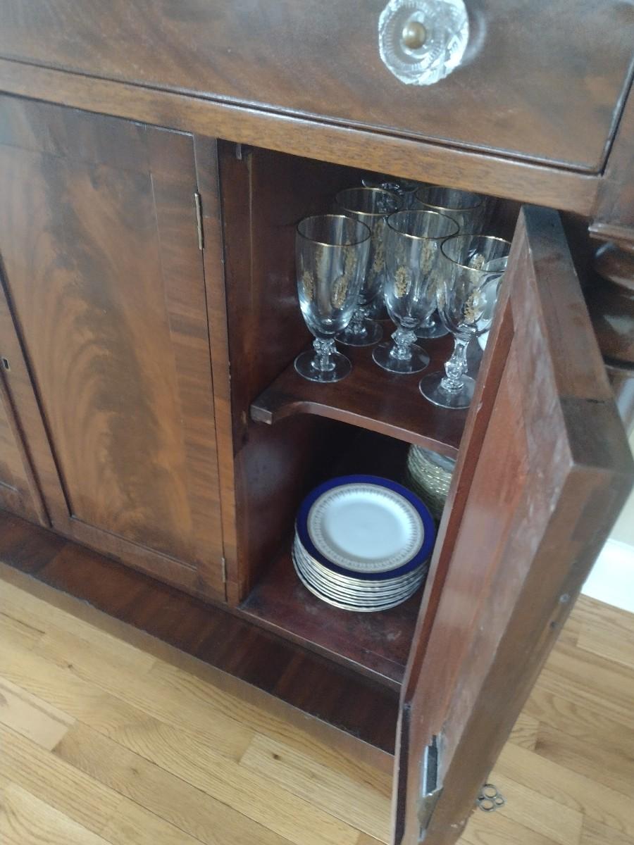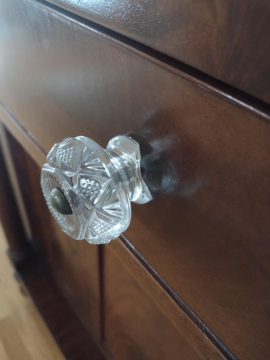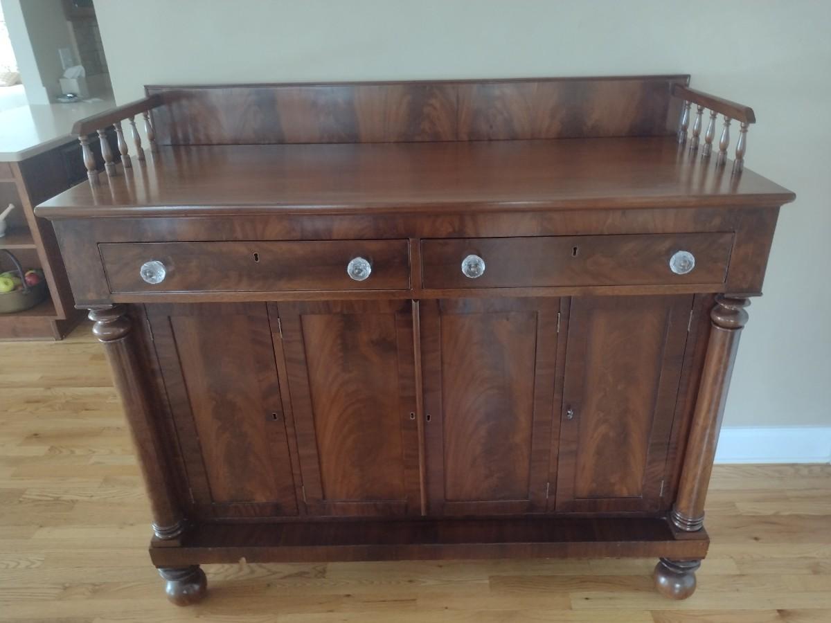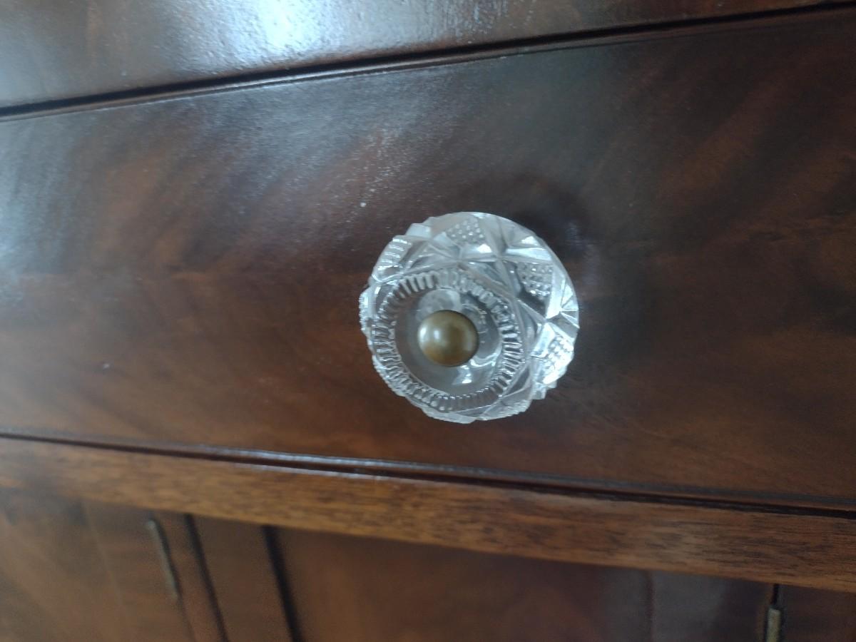 Vintage Flame Mahogany Credenza. Two of the glass knobs have chips as shown