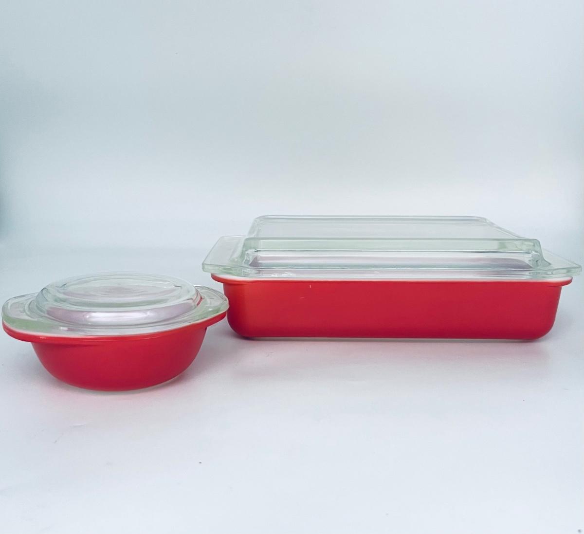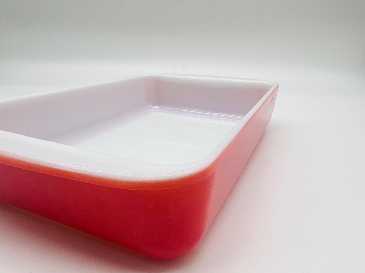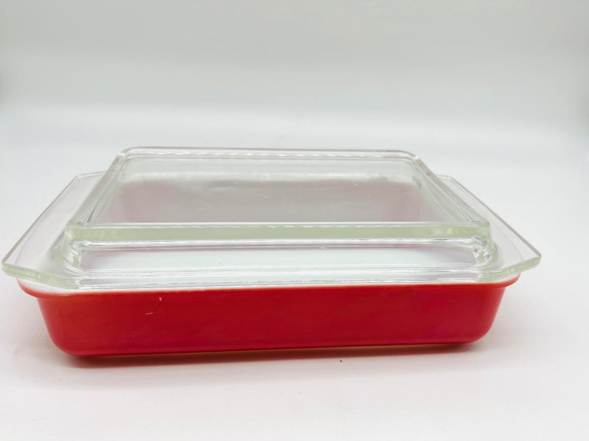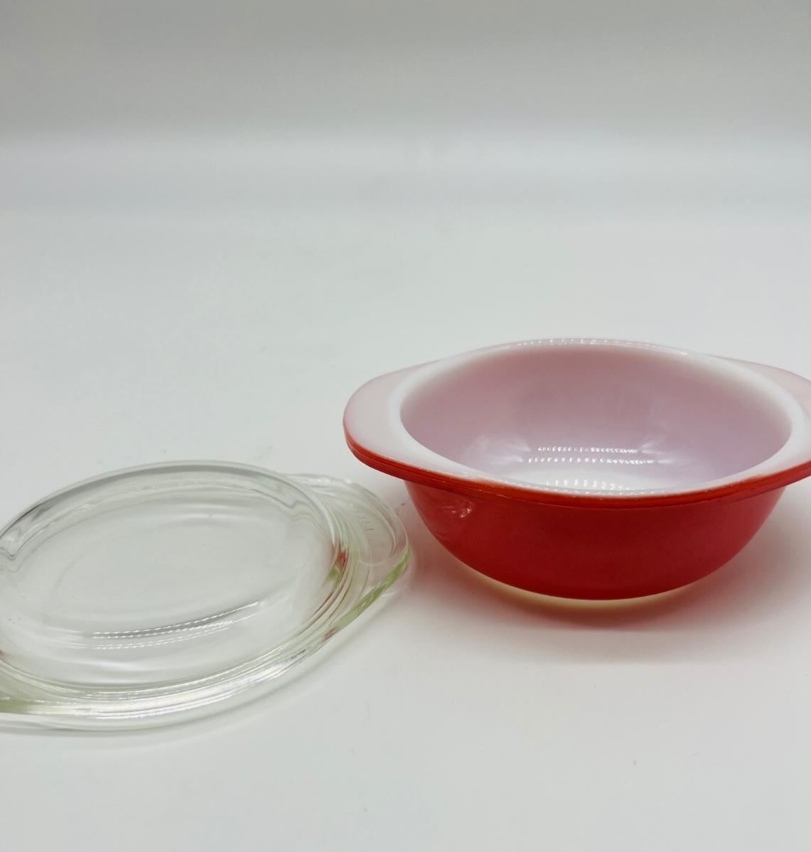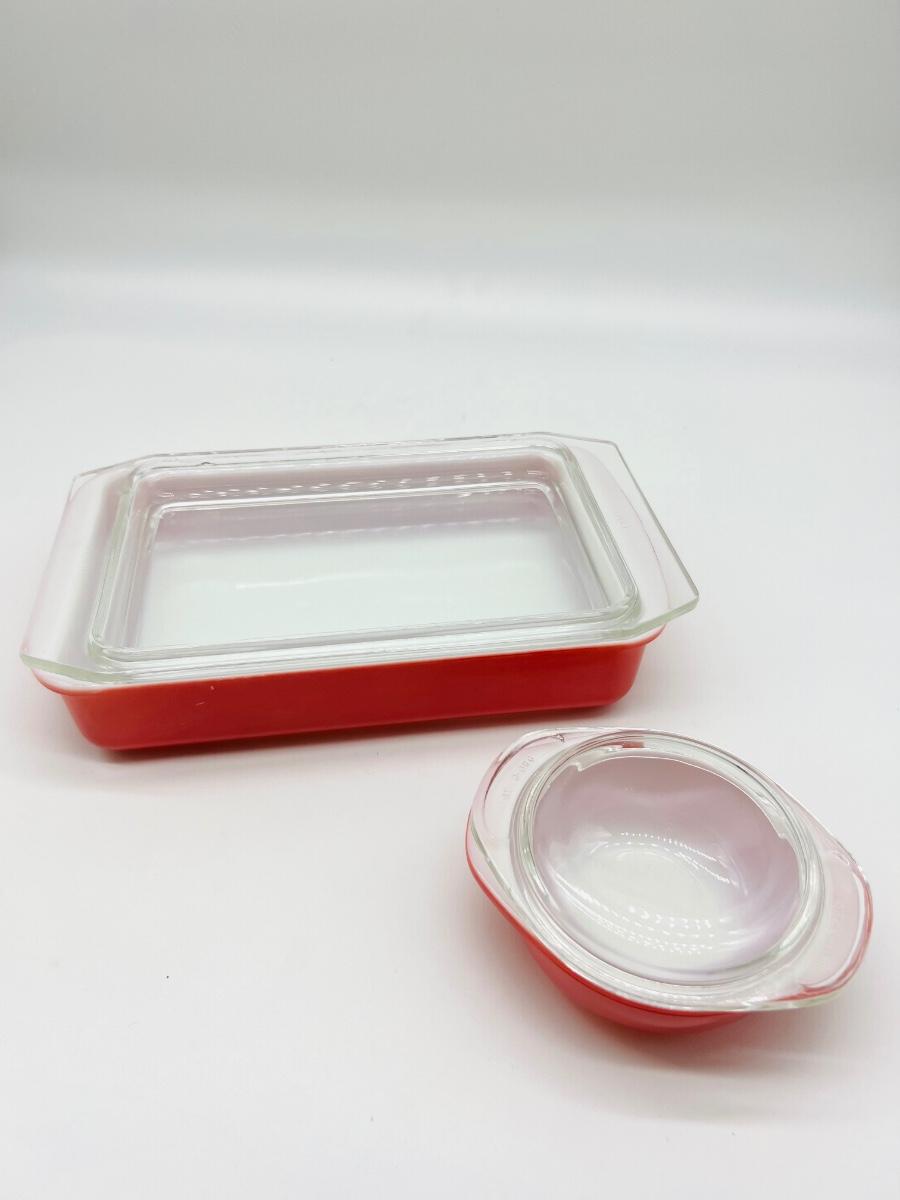 Vintage Flamingo Pink Pyrex lot. Includes a Vintage Pyrex Flamingo Pink 231 Rectangle Lasagna Casserole Baking Dish 1 1/2 quart with lid. Inside of lid has a chip, see picture. One 080 Individual 8oz Casserole Dish with Lid