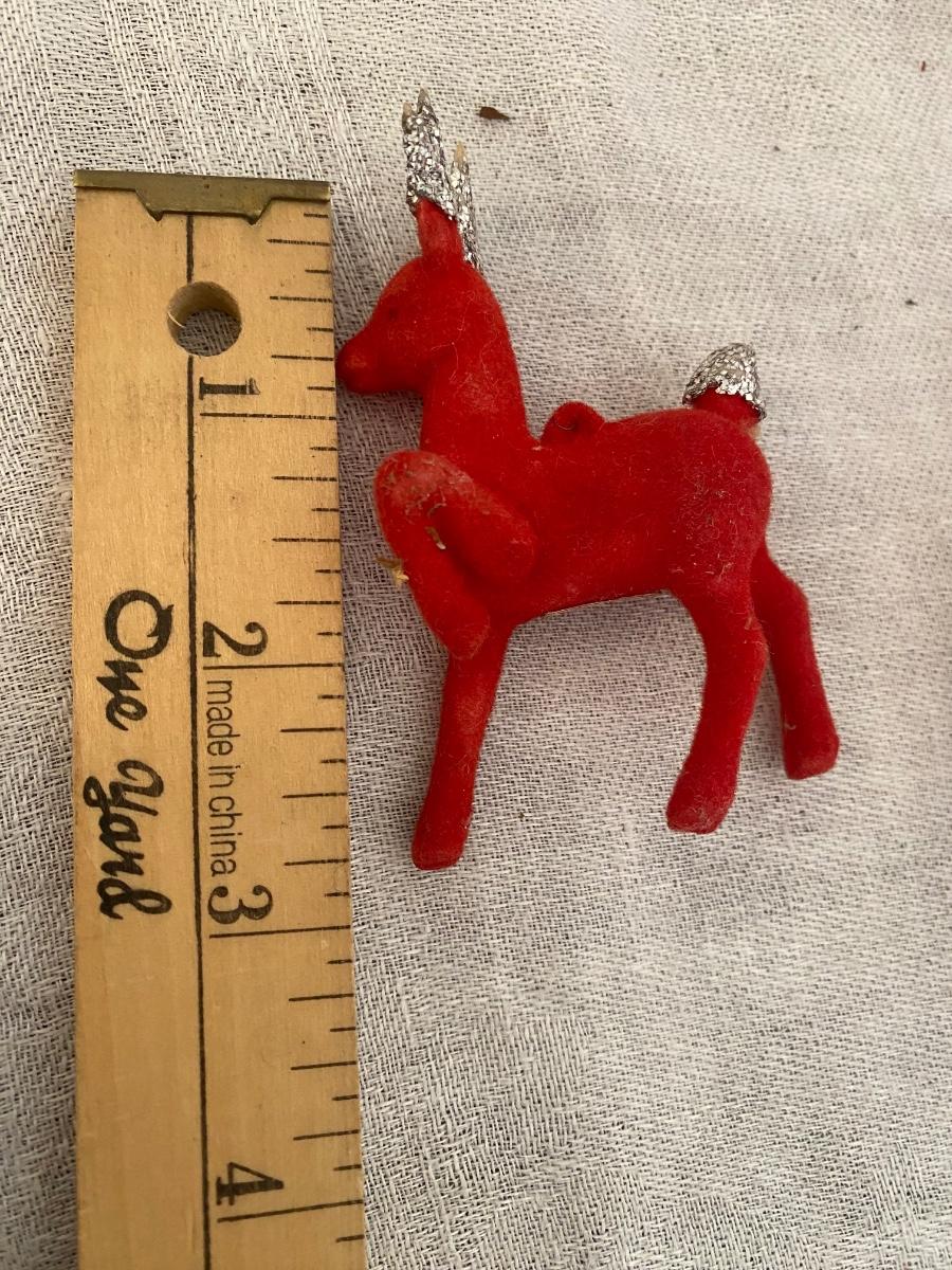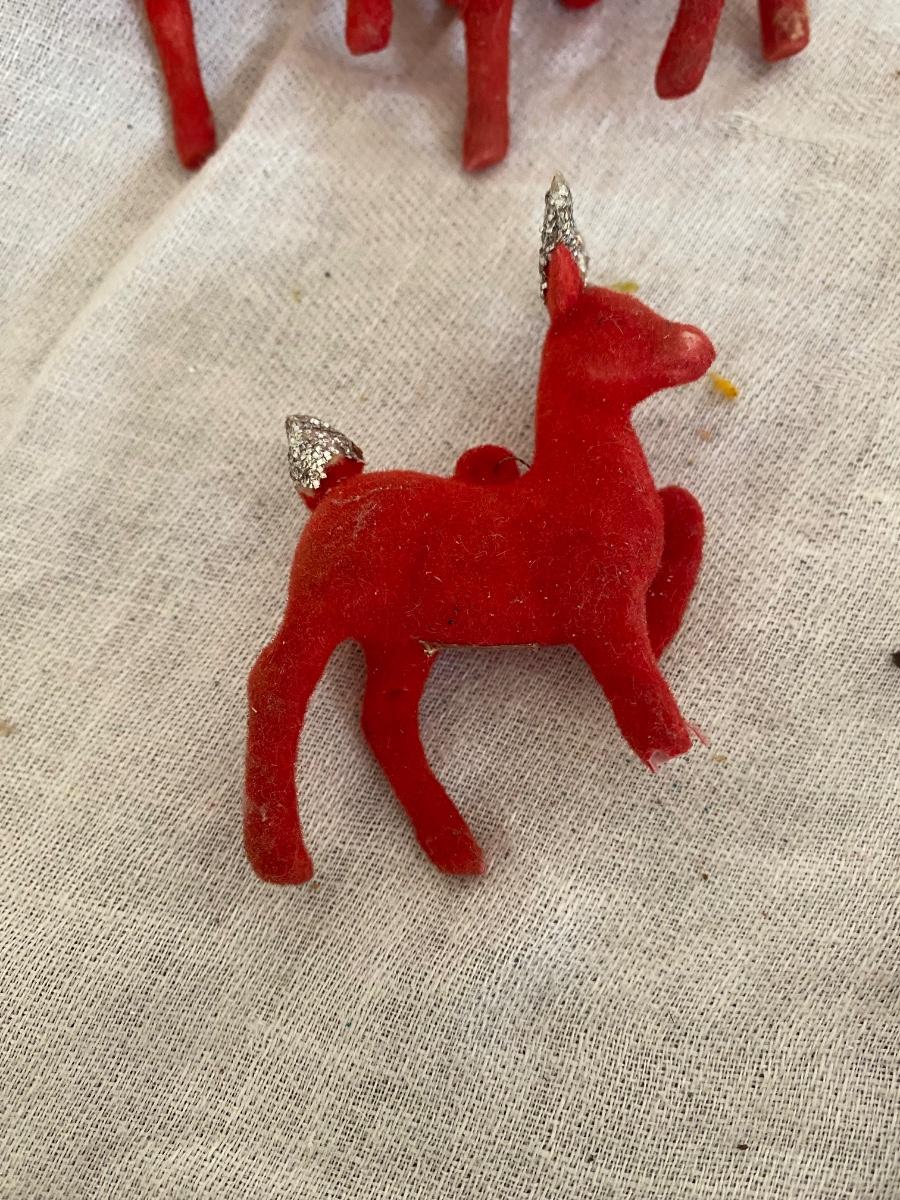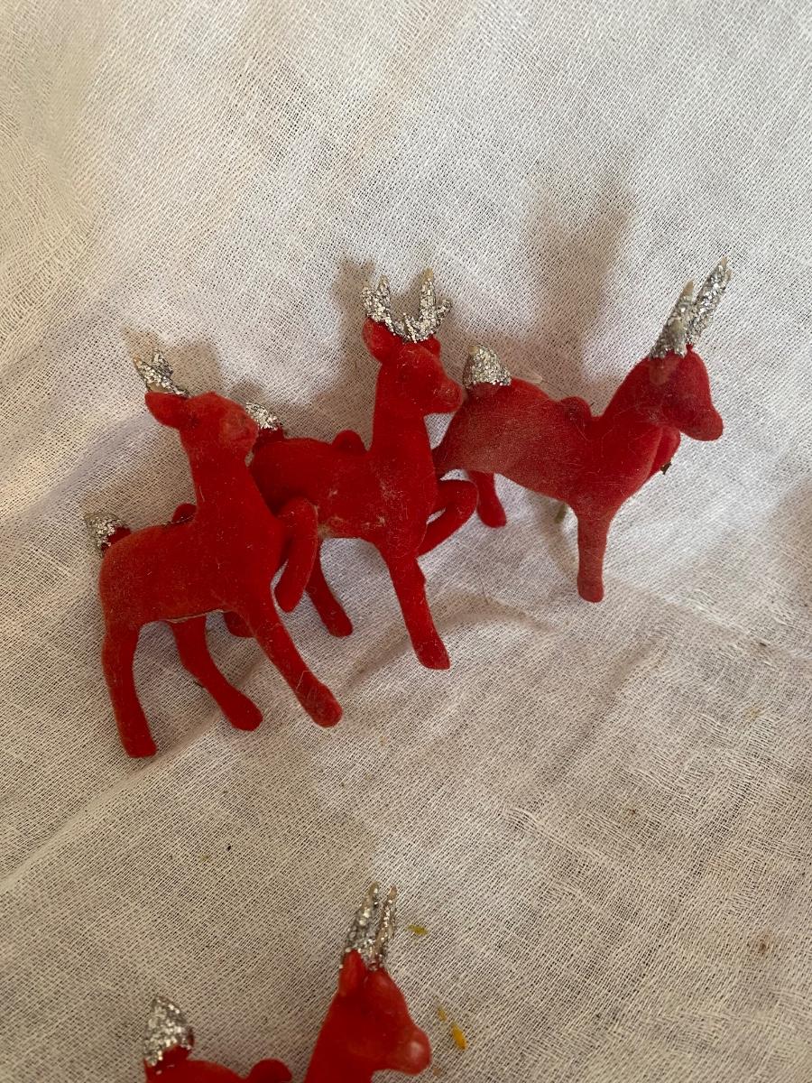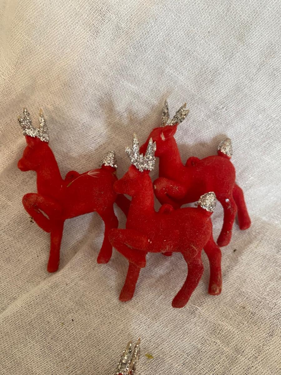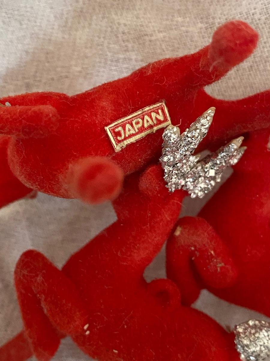 Made in Japan , 3 flocked reindeeer, will throw in the 4th who has been injured in a biking accident. glitter ears and tails. 2" tall.