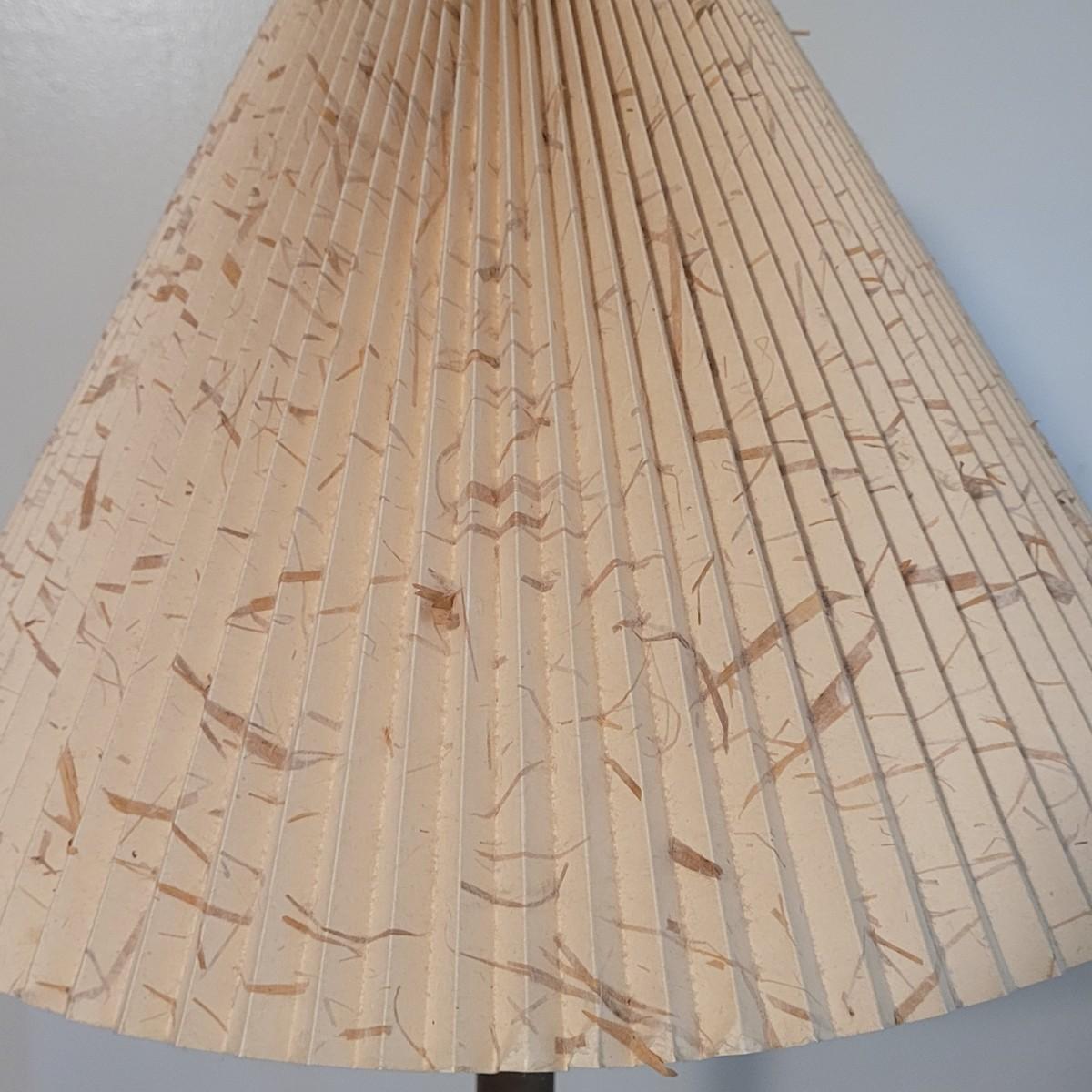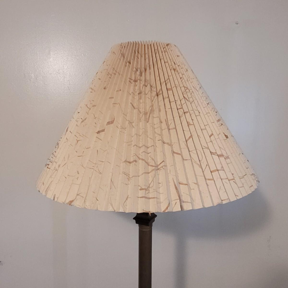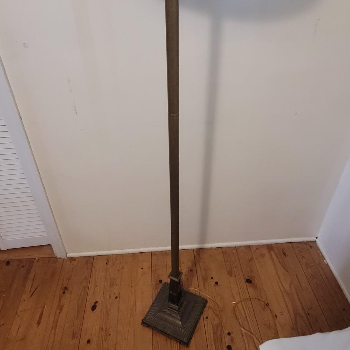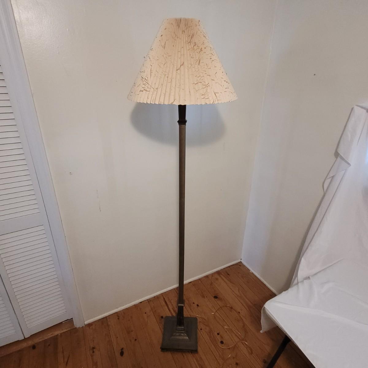 Vintage metal floor lamp appearing to be made from brass. Base is made from solid metal. Lamp shade attaches to bulb and has a papyrus style shade. One way switch. Powers on when plugged in. Item measures 10"x 10" x 75"H.