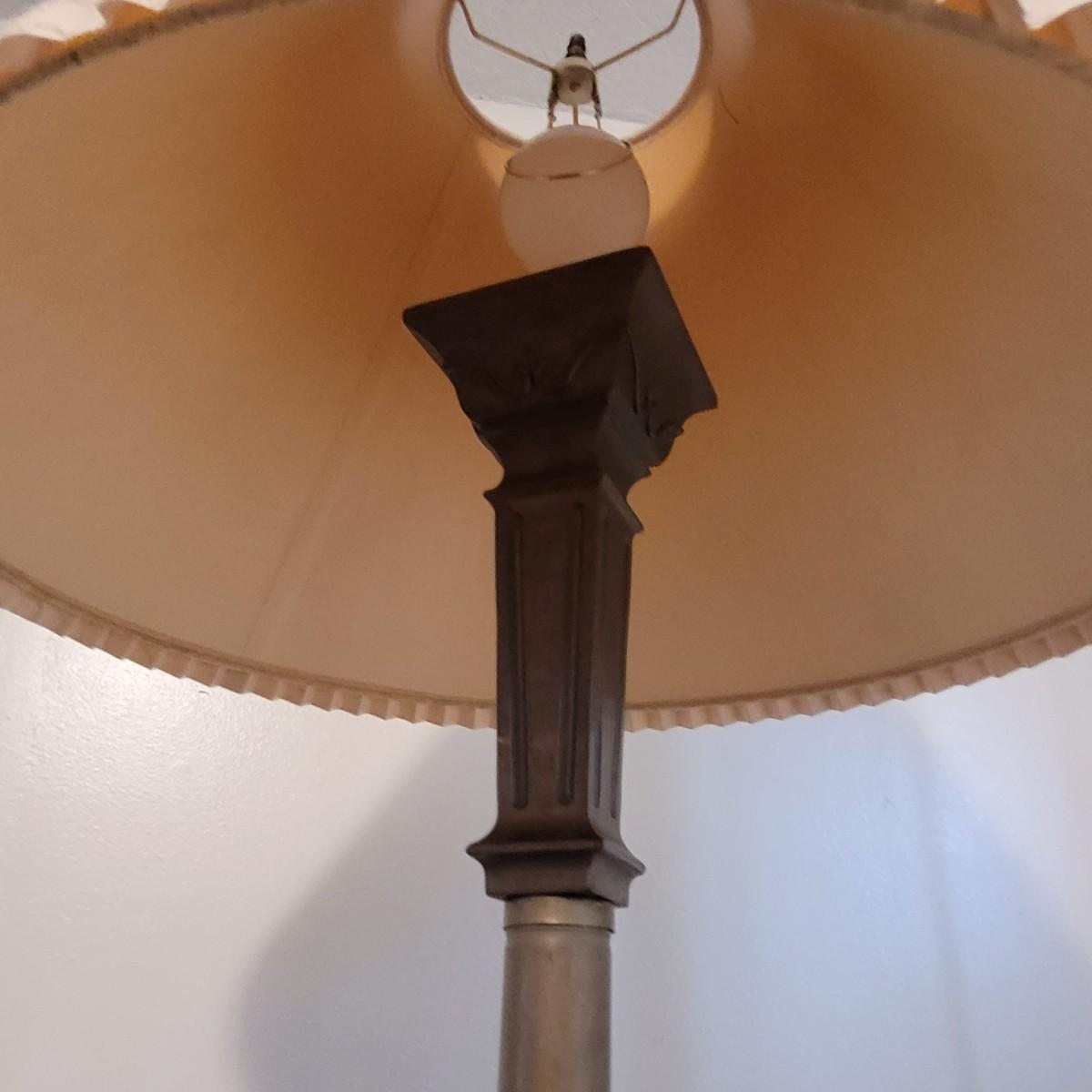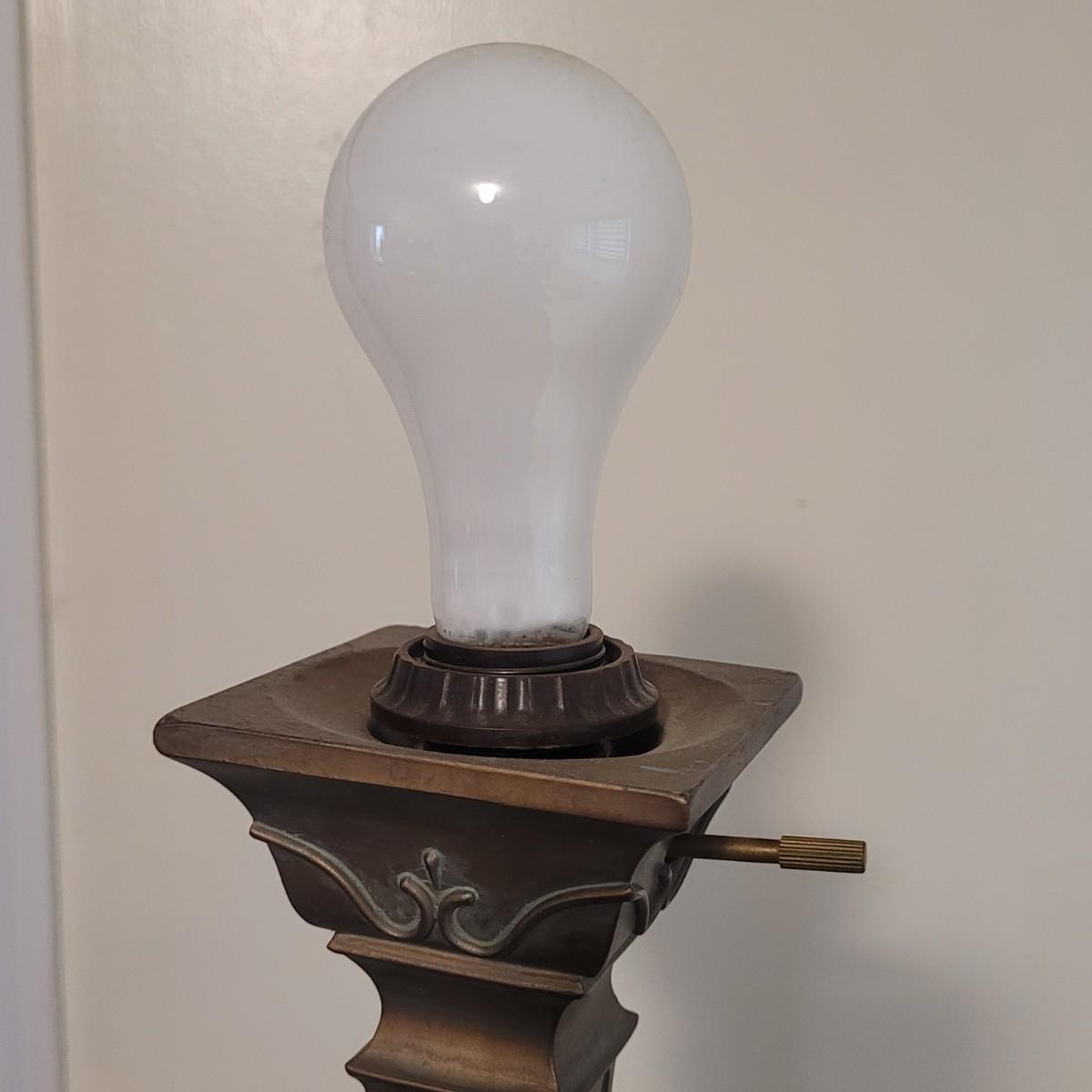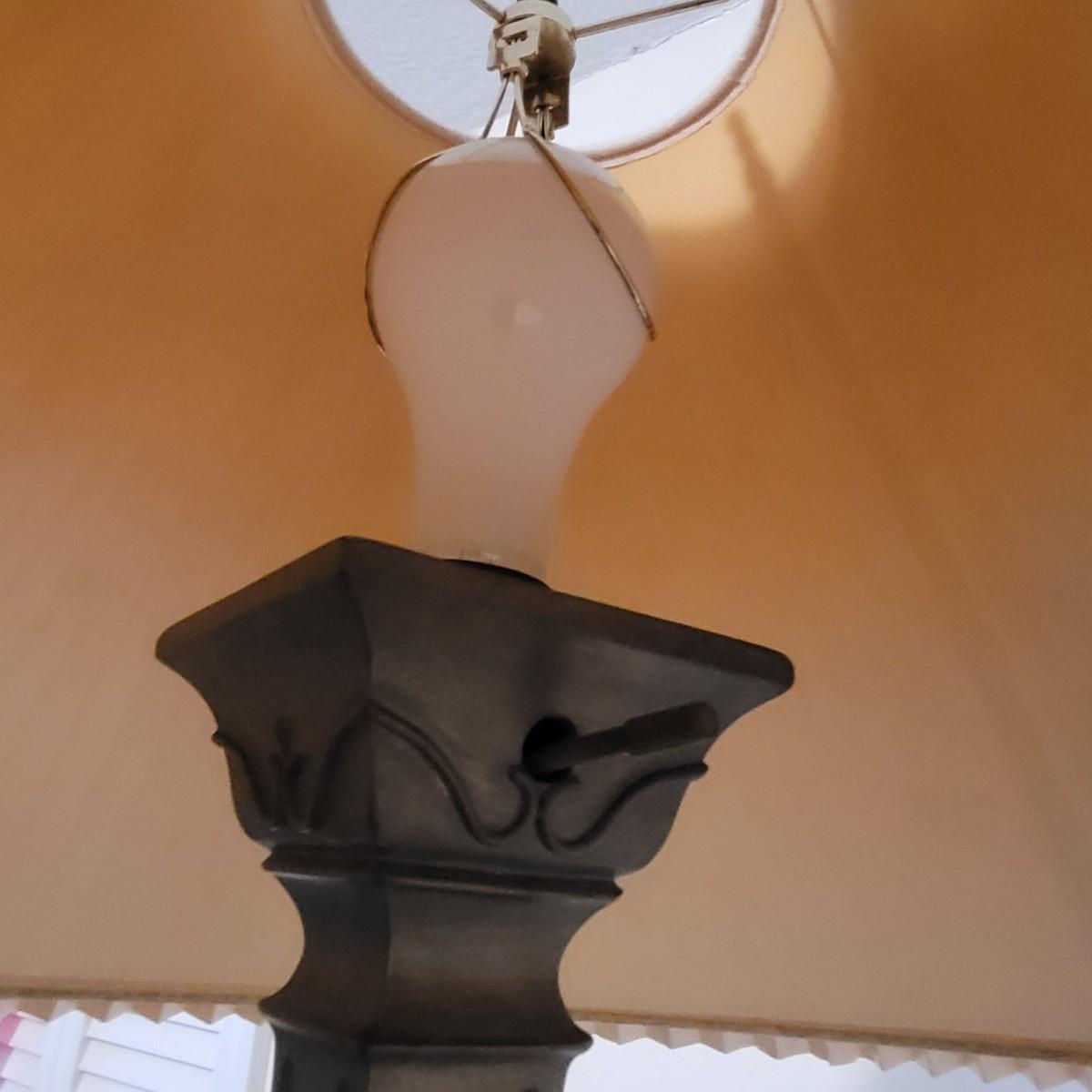 Vintage metal floor lamp appearing to be made from brass. Base is made from solid metal. Lamp shade attaches to bulb and has a papyrus style shade. One way switch. Powers on when plugged in. Item measures 10"x 10" x 75"H.