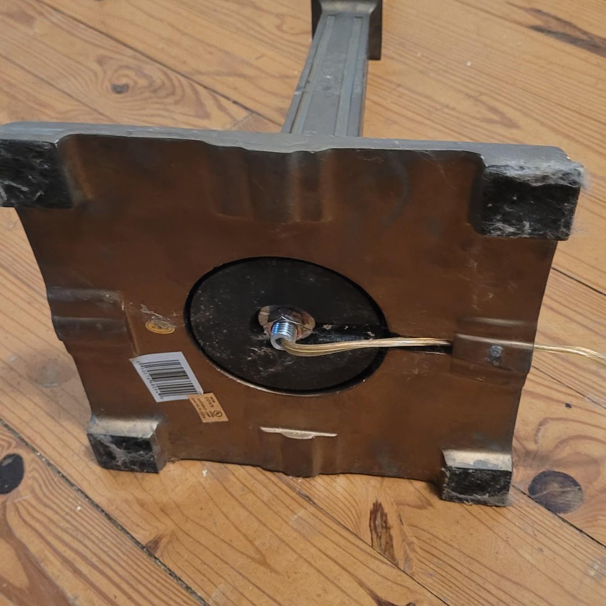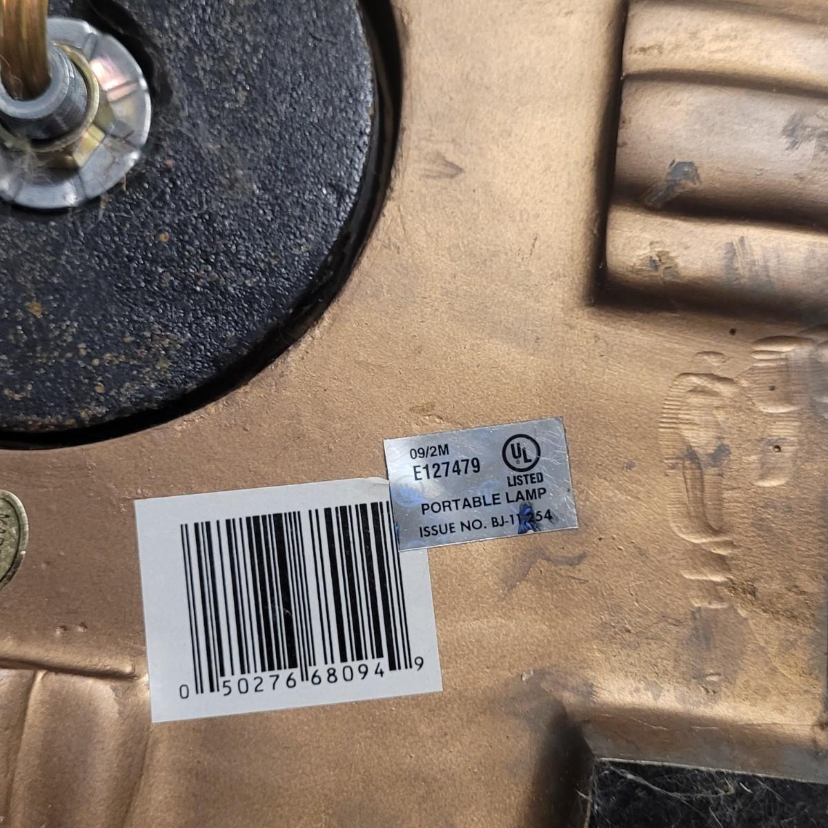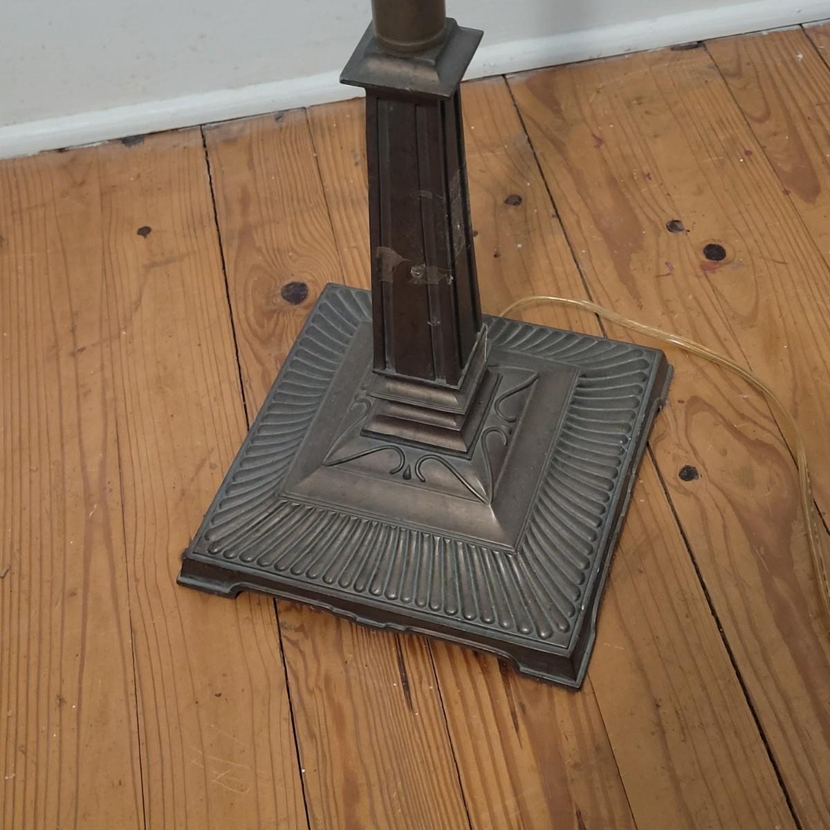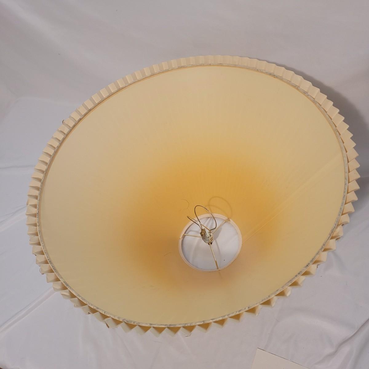 Vintage metal floor lamp appearing to be made from brass. Base is made from solid metal. Lamp shade attaches to bulb and has a papyrus style shade. One way switch. Powers on when plugged in. Item measures 10"x 10" x 75"H.