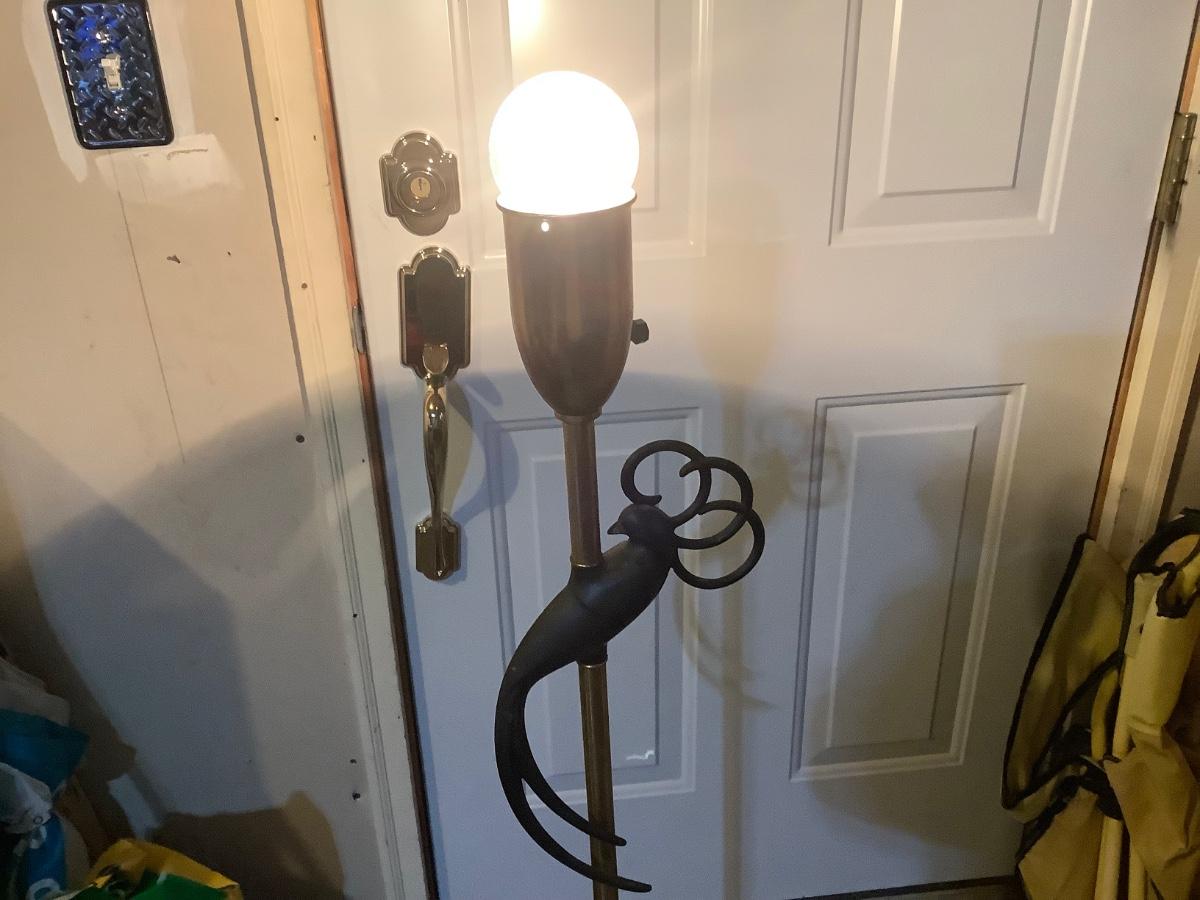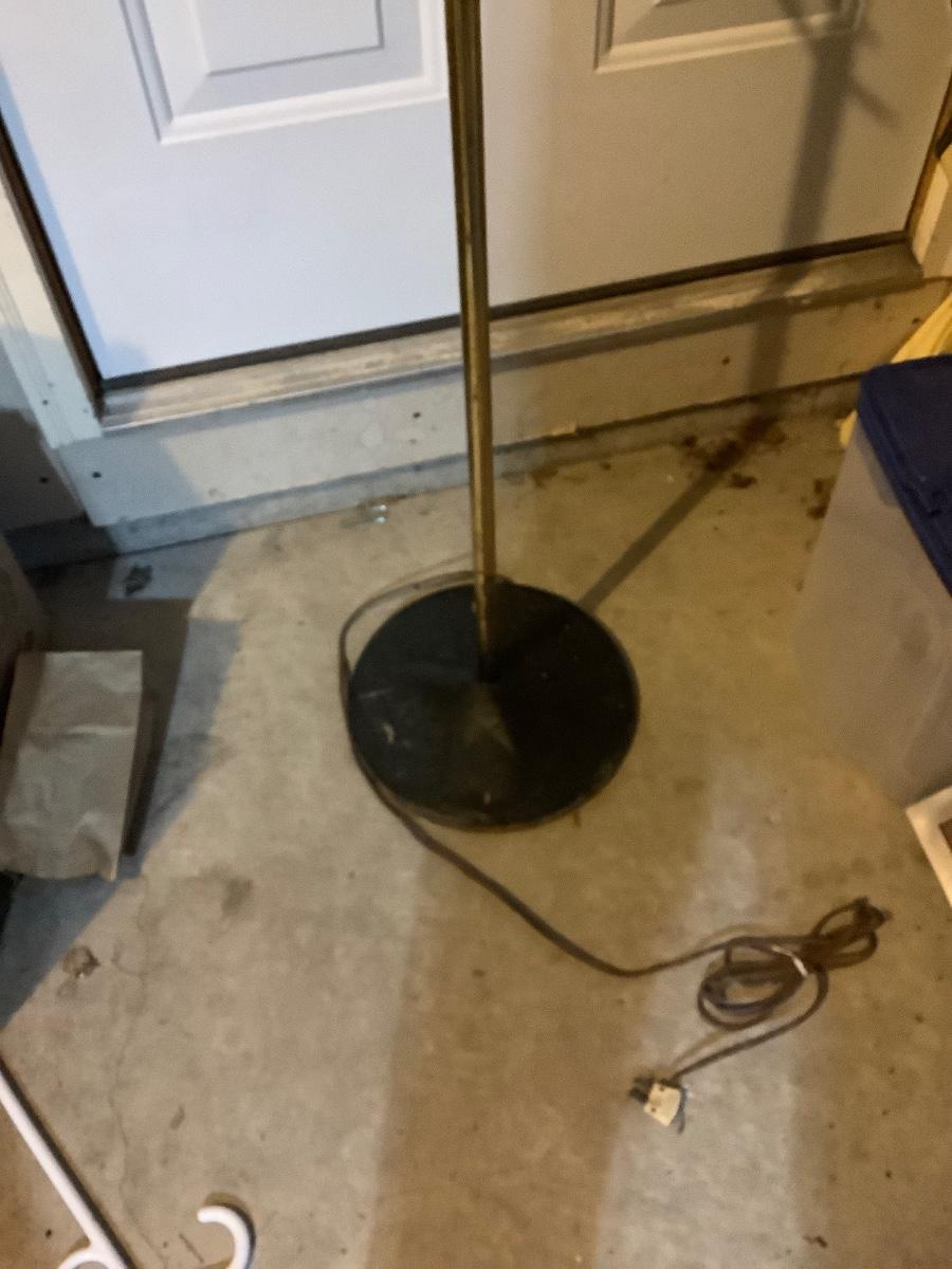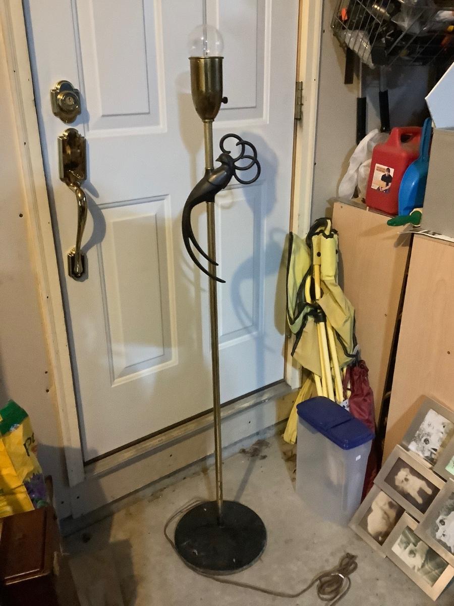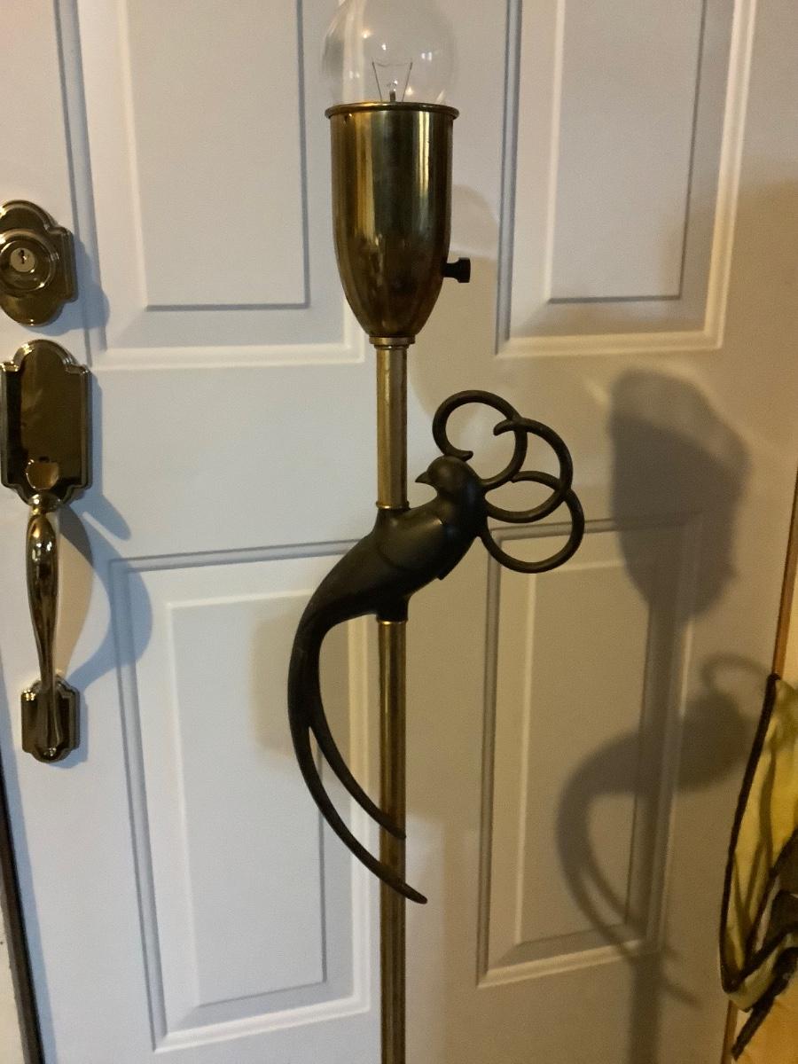 This is a great floor lamp that is brass with an Art Nuevo bird that is black and a bass painted black. It works.