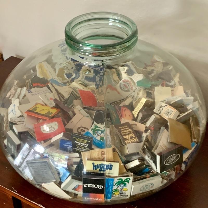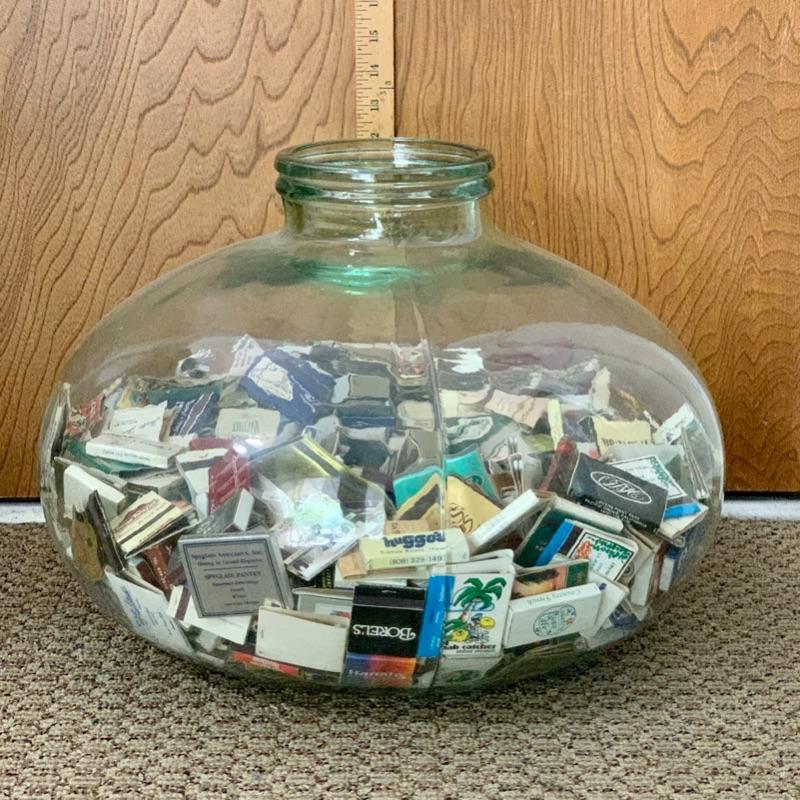 Large, vintage, clear glass floor vase and vintage match collection. Measures 18" in diameter and 12" tall.