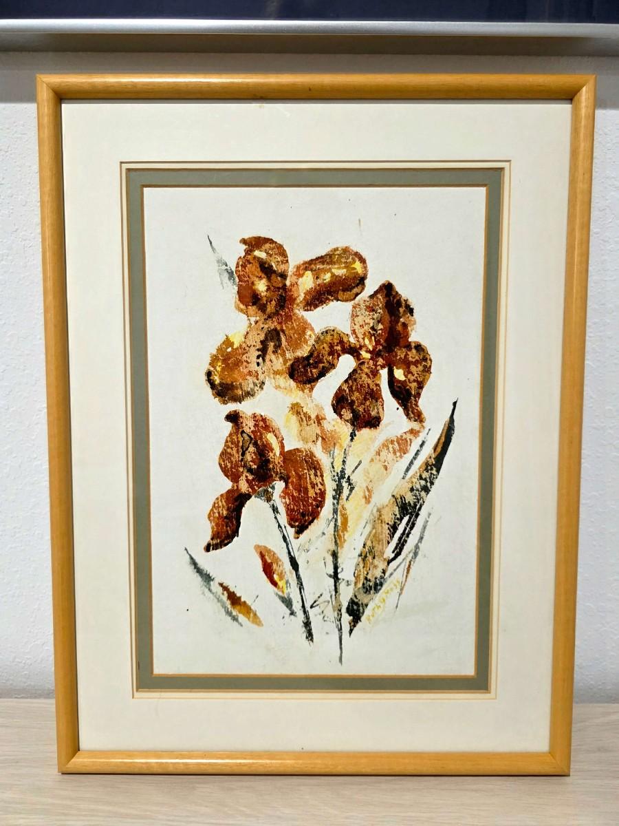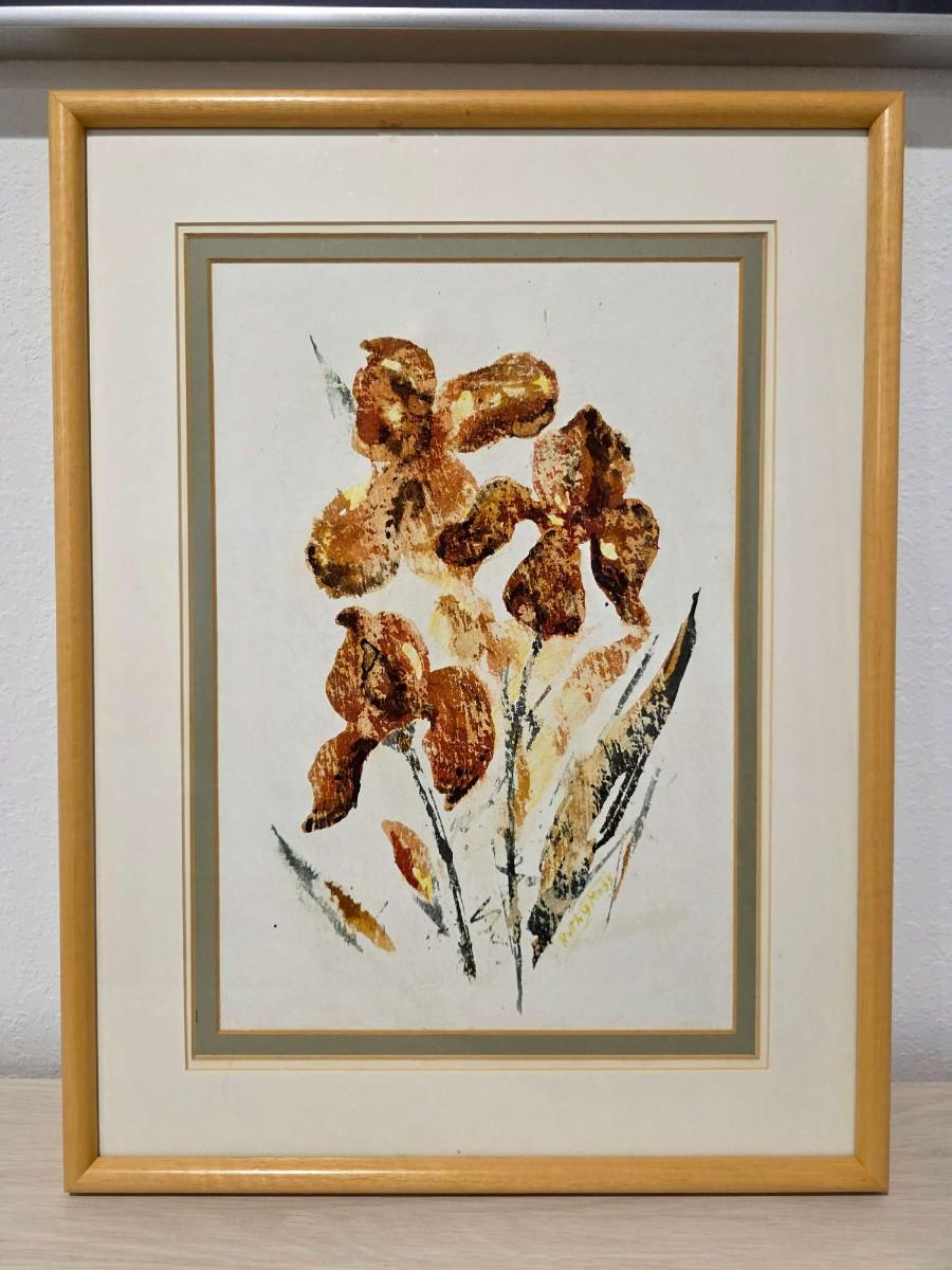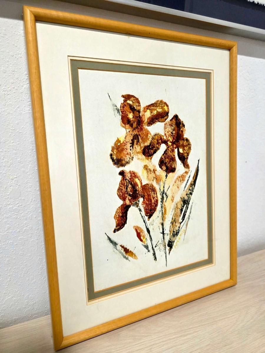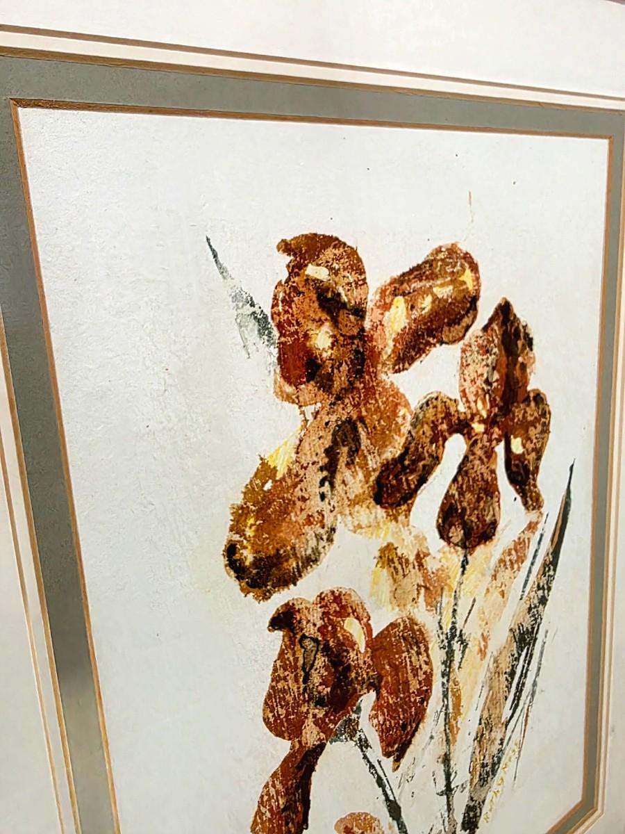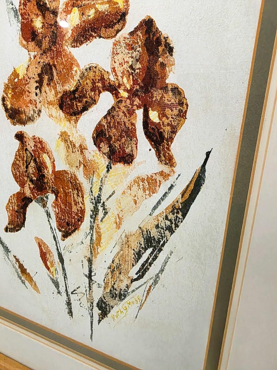 This is another original vintage floral piece by Colorado artist, Ruth Moss in soothing hues of brown, gold, yellow, and green. Unsigned. Framed and matted. Frame measures 20"W x 15"H.