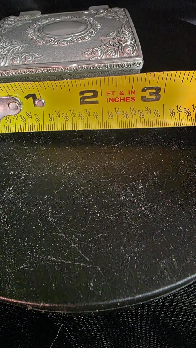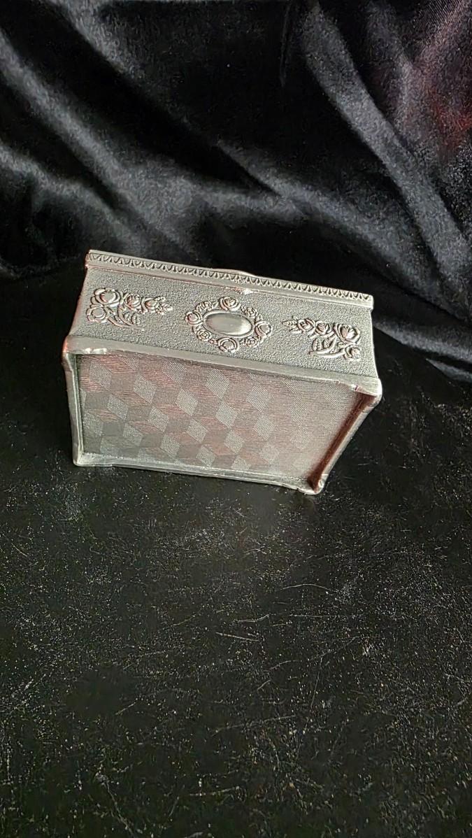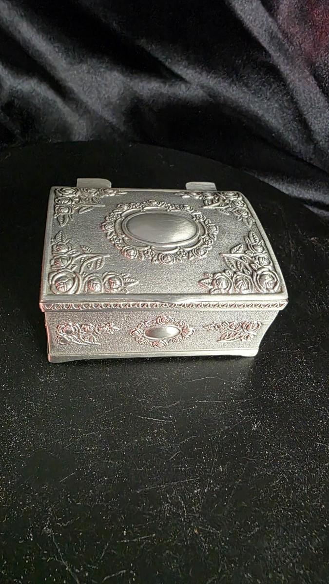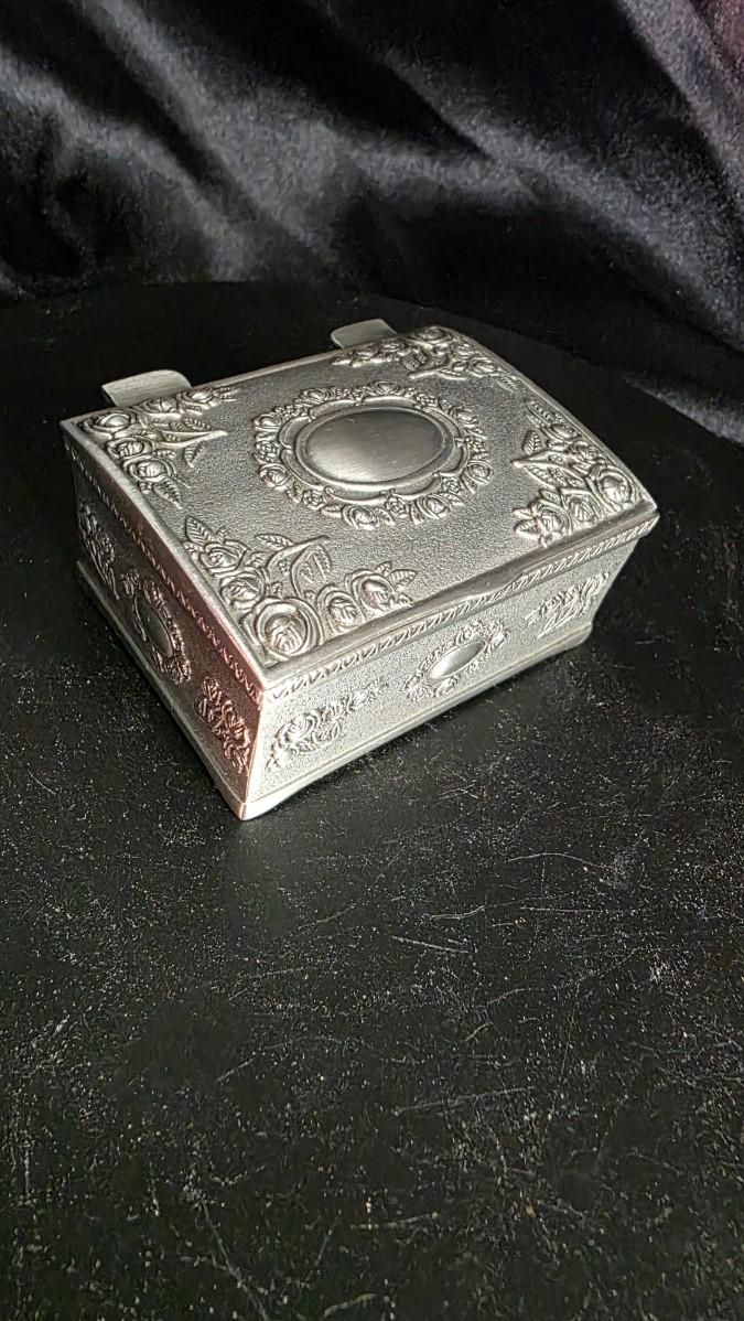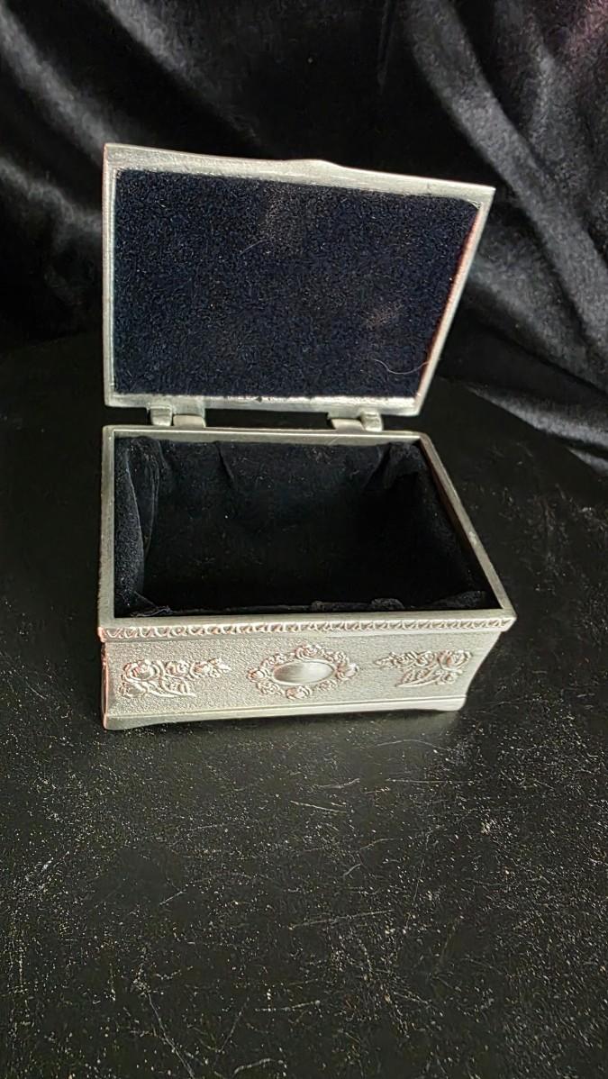 This vintage-style metal jewelry box captures the elegance of a bygone era, sculpted in delicate floral detail and finished in a soft antique silver tone reminiscent of heirloom pewter. Measuring approximately 2.75 inches wide, 2 inches deep, and 1 inch tall, this petite treasure chest is as functional as it is beautiful.