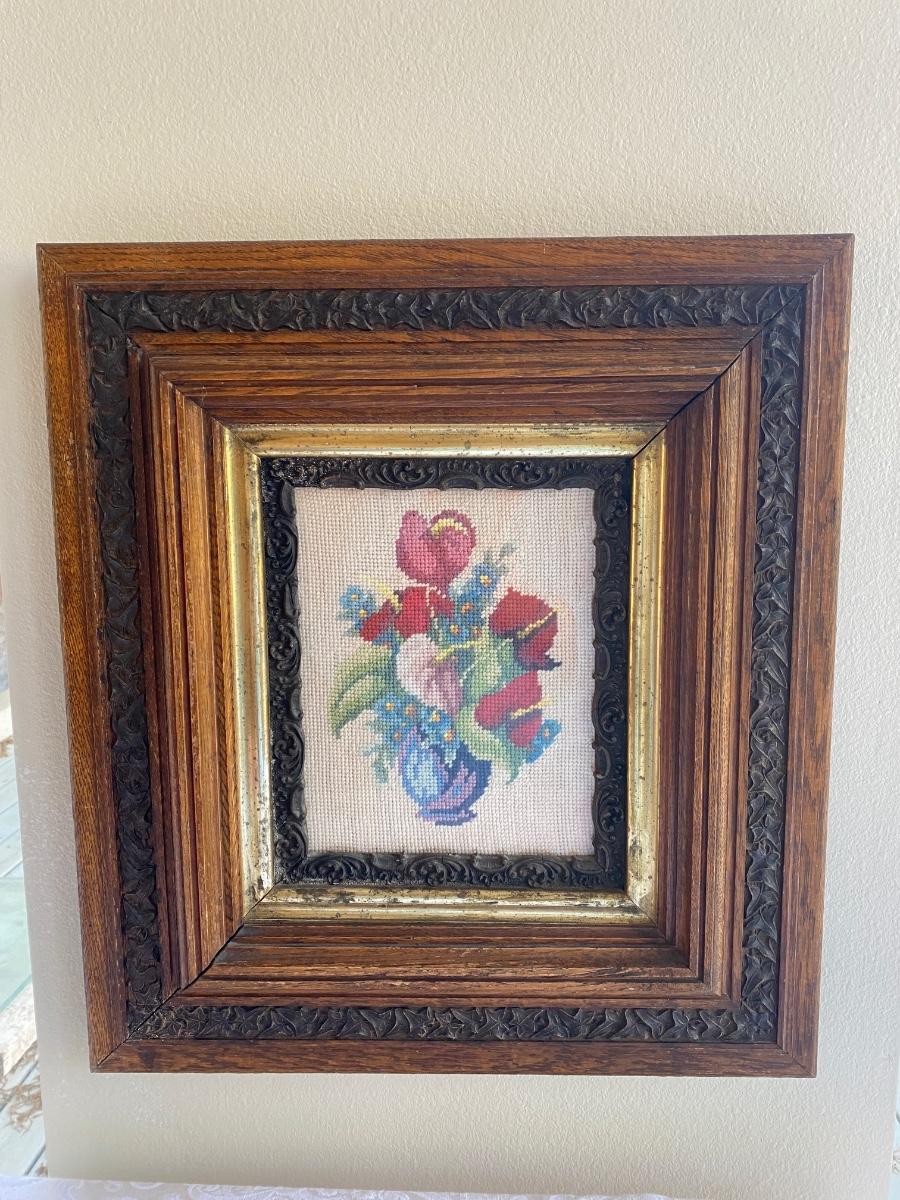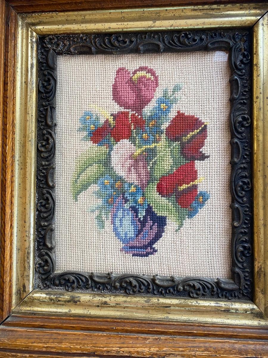 Vintage floral needlepoint in beautiful frame. Approx 21-1/4h x 19w. VG condition