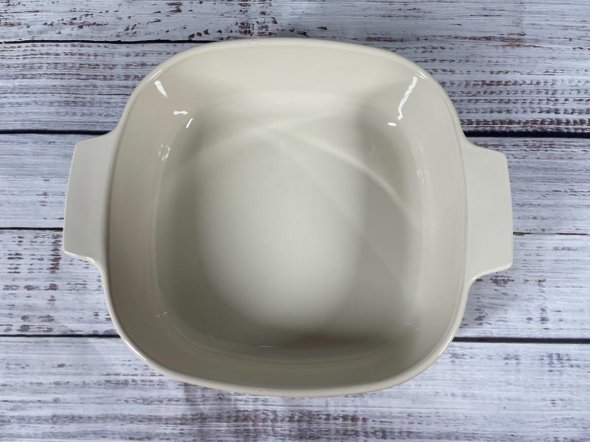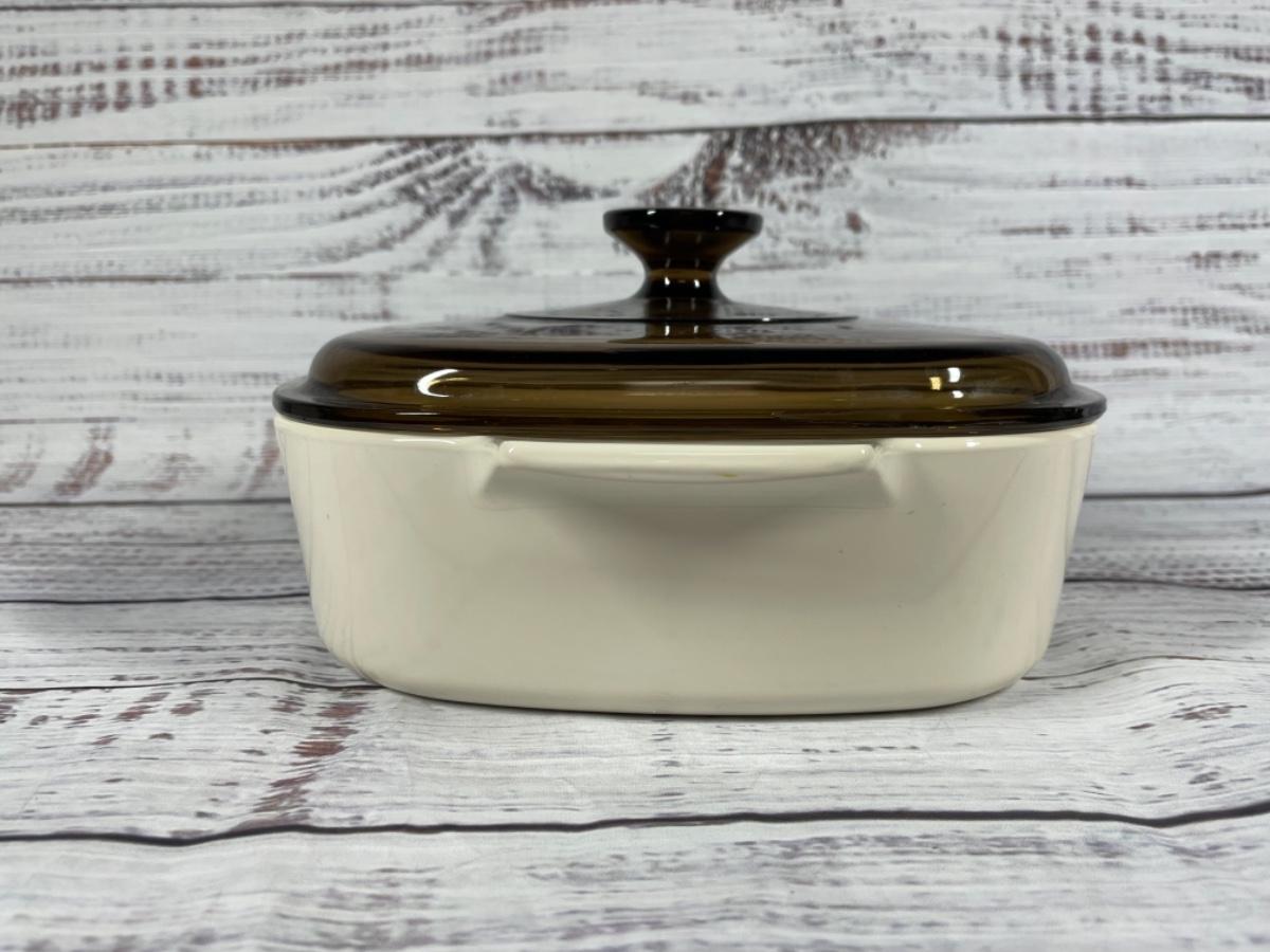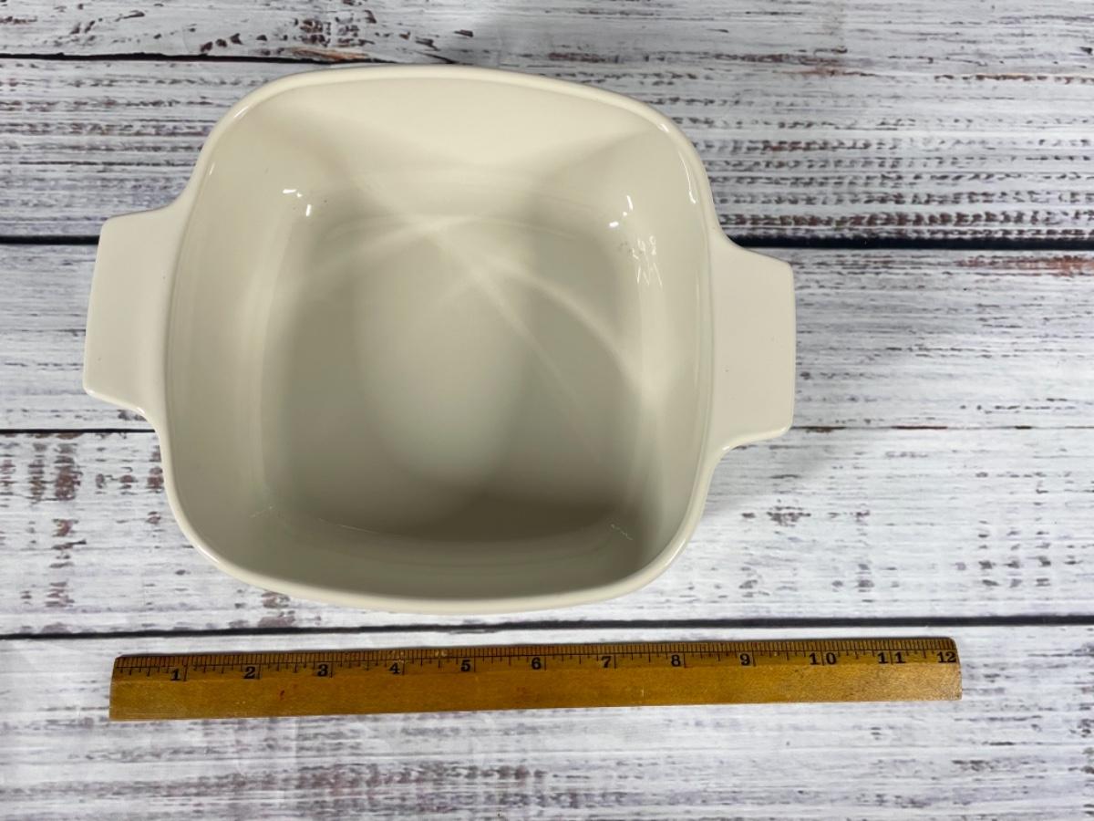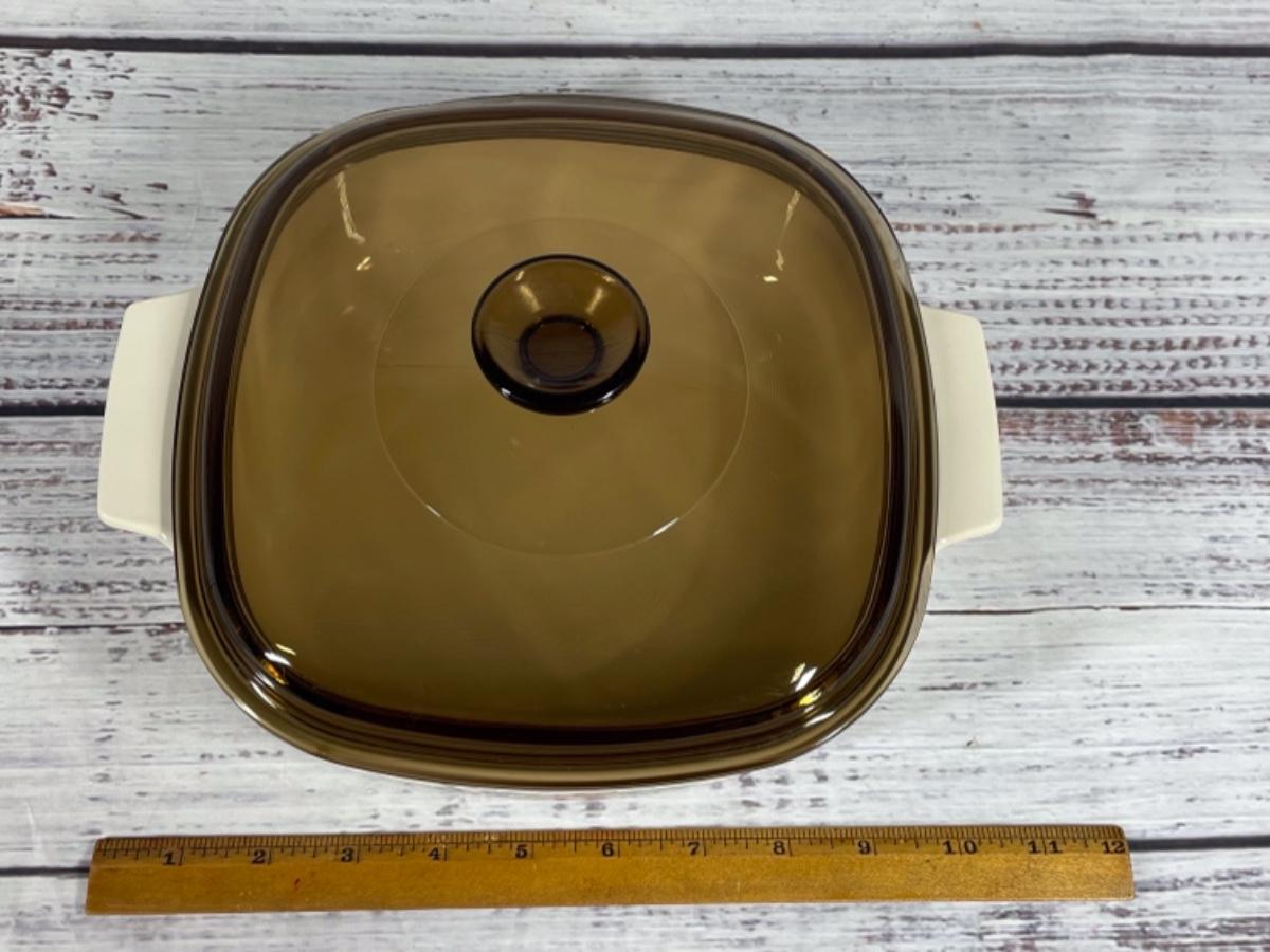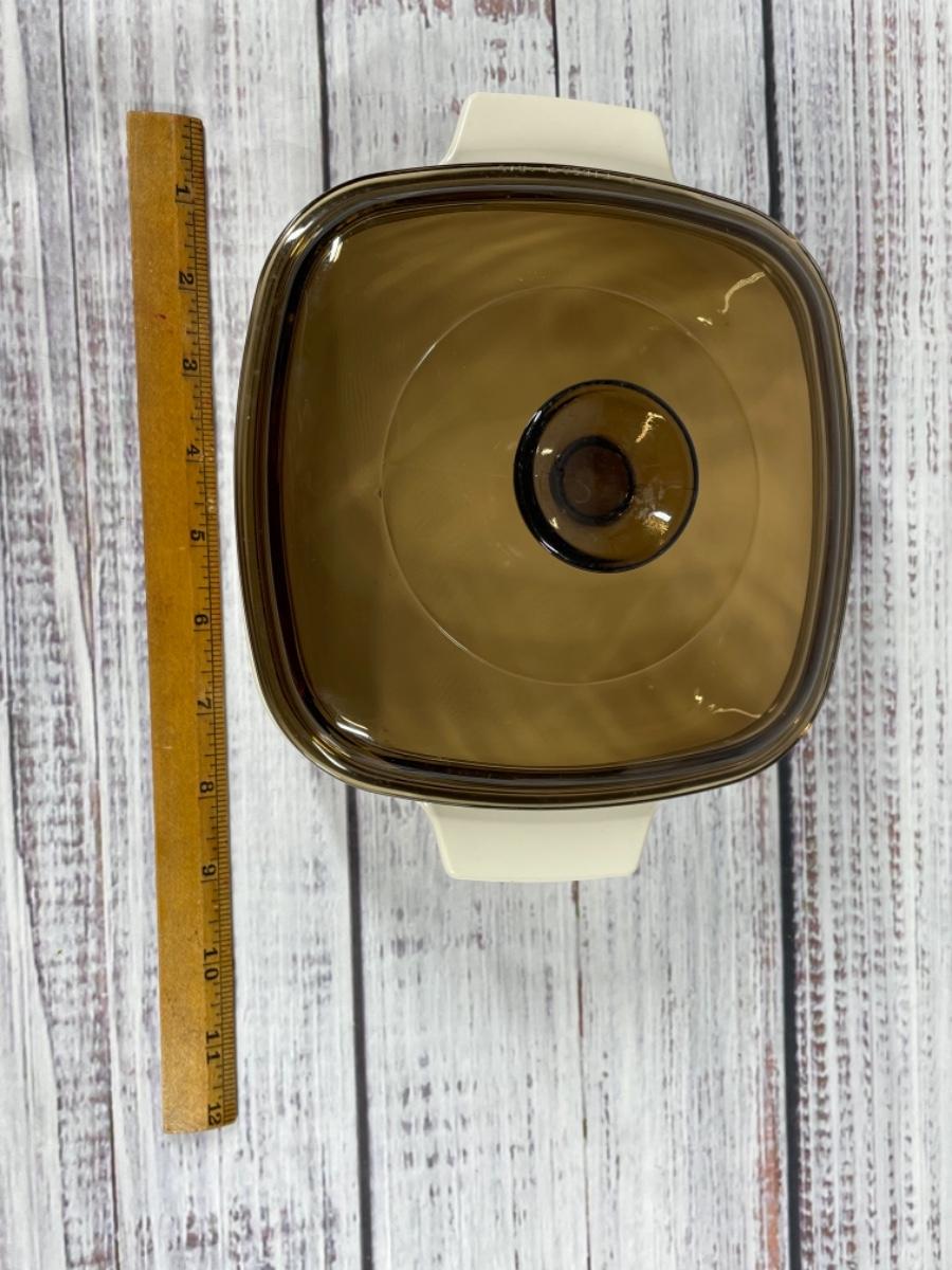 One of the cookware is missing a lid. All are in good condition but have some scratches on the lid and on the bottom. The biggest bowl is about 10” wide and the smallest is about 9” wide.