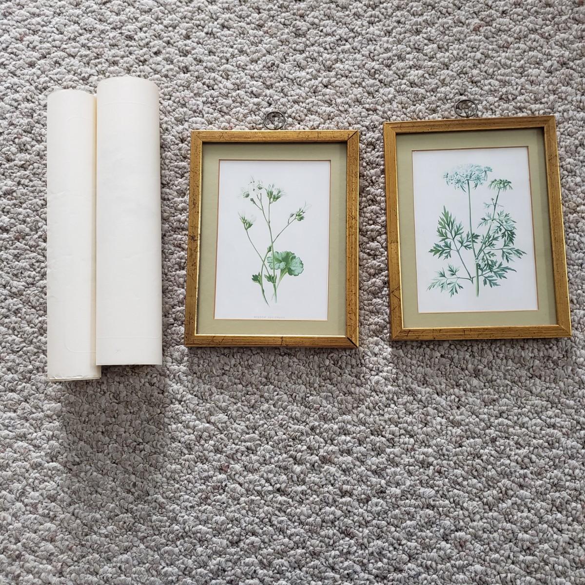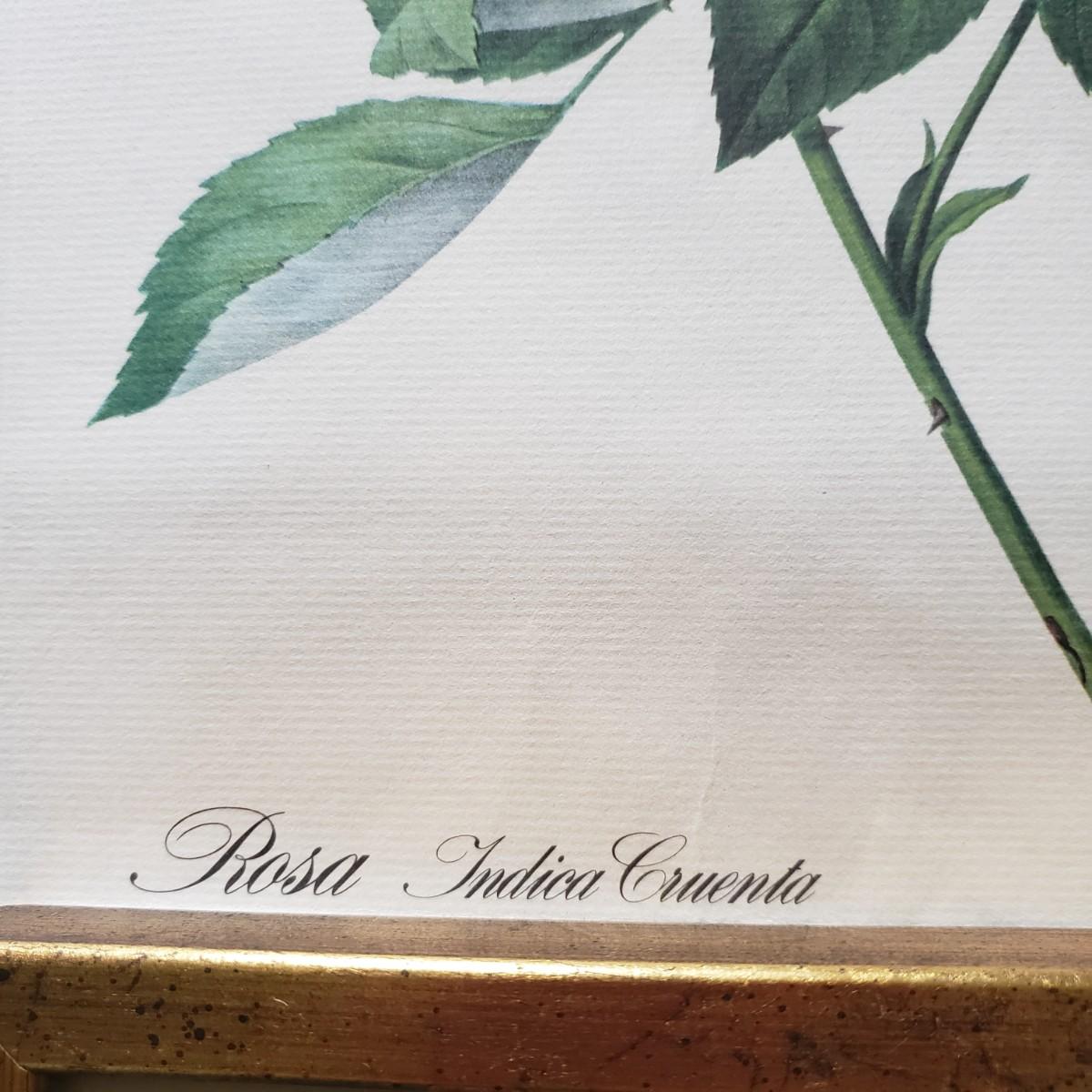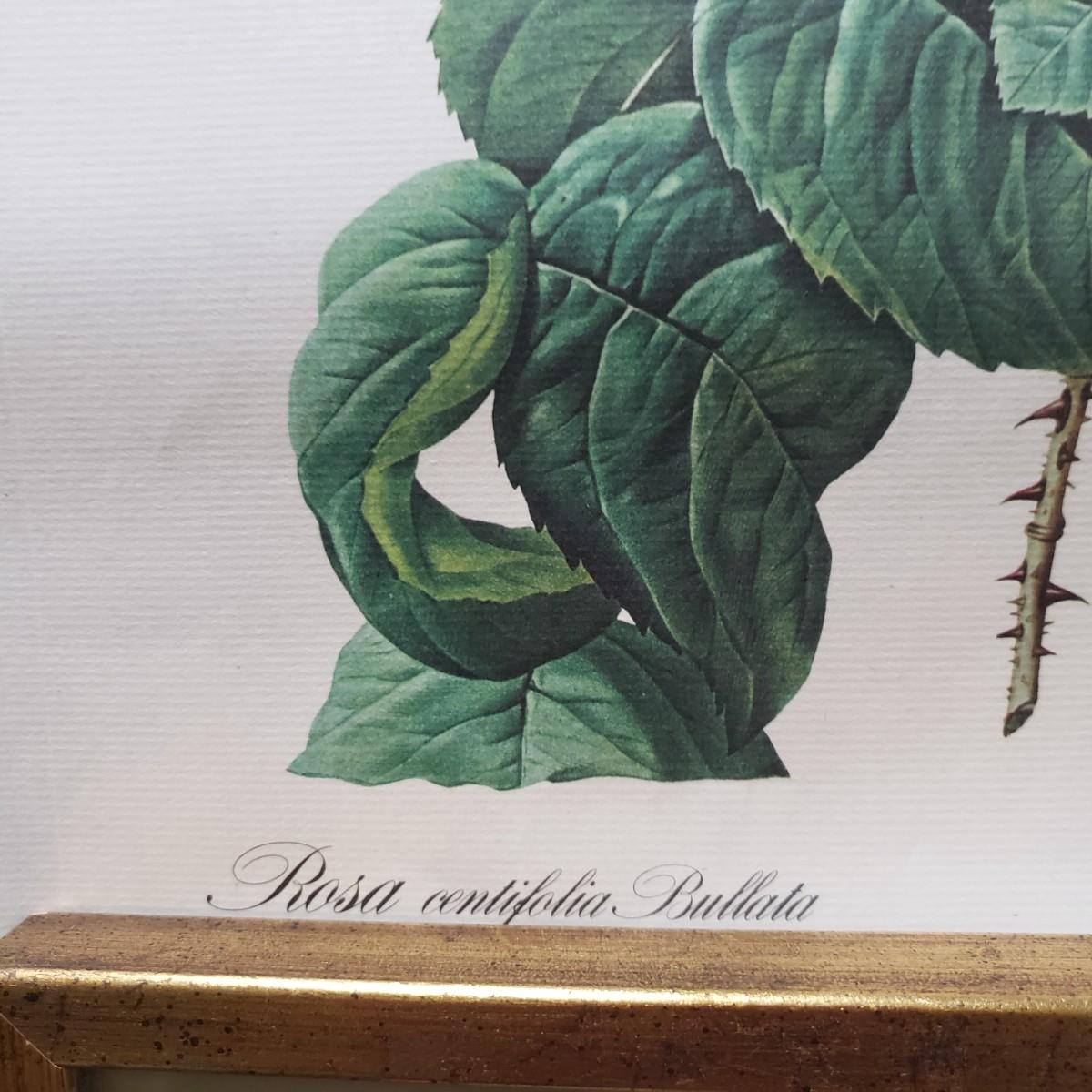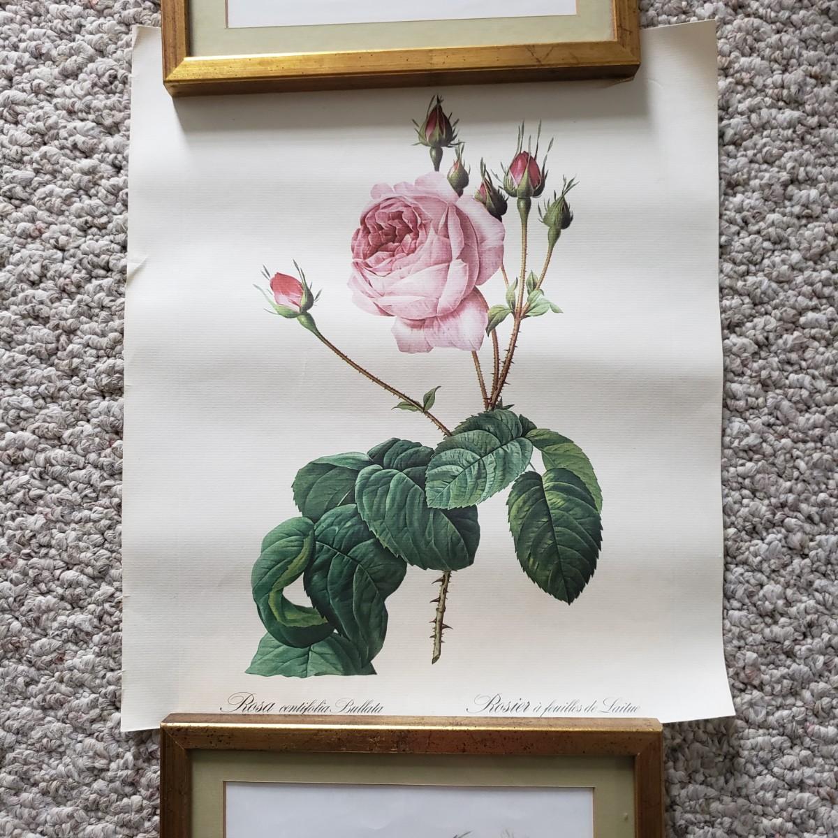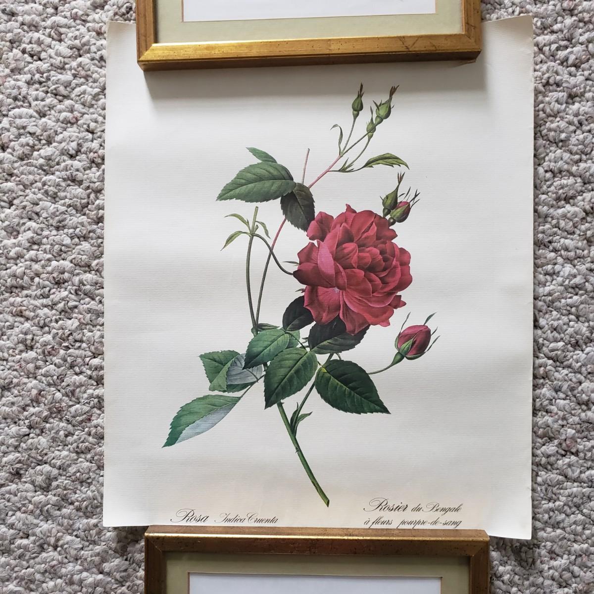 There are four prints in this lot. Two are framed and two are not. The wooden gold frames with glass measure 9" x 7"H. The two rose prints measure 12" x 11"H. The first pictured rose print has writing on the back, see picture.