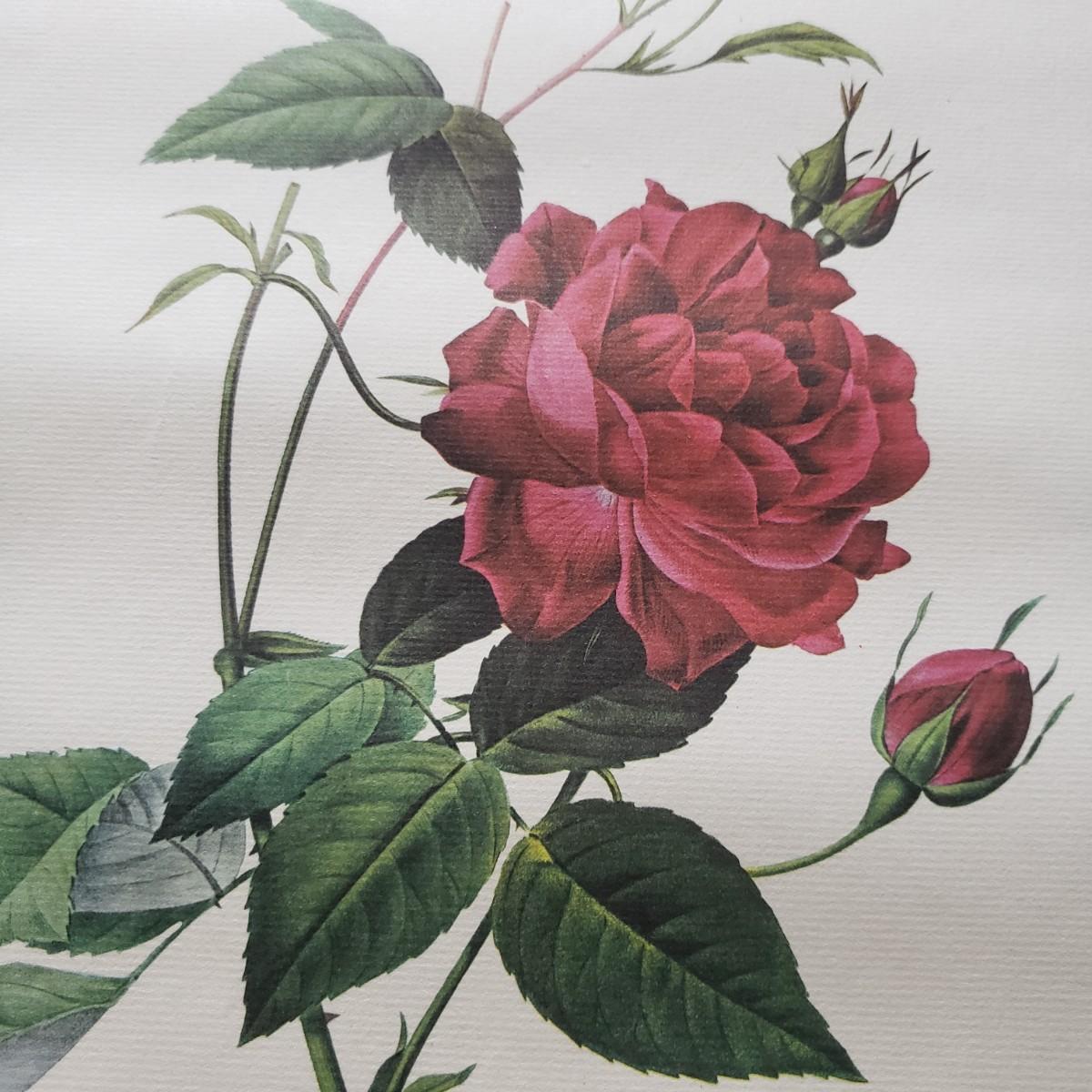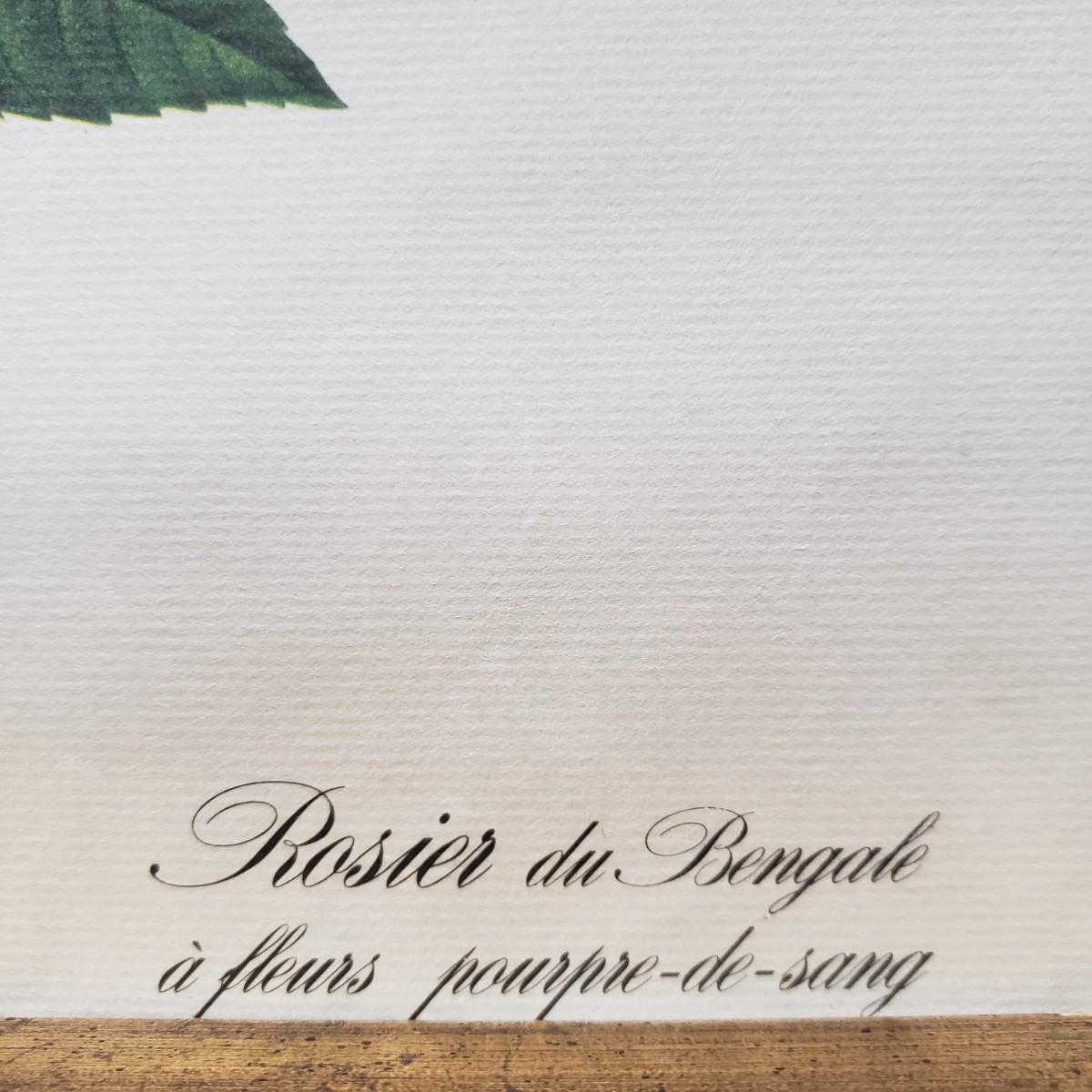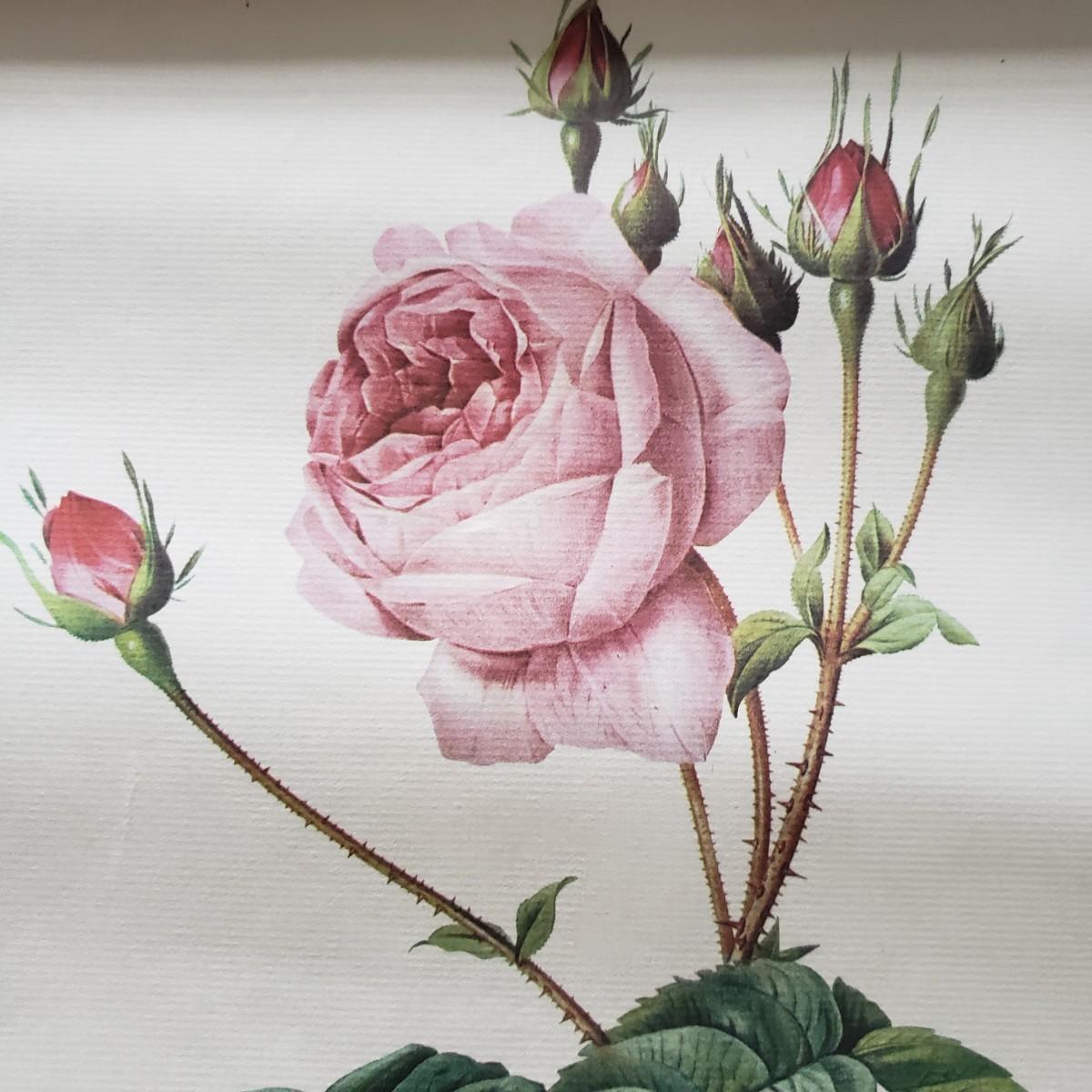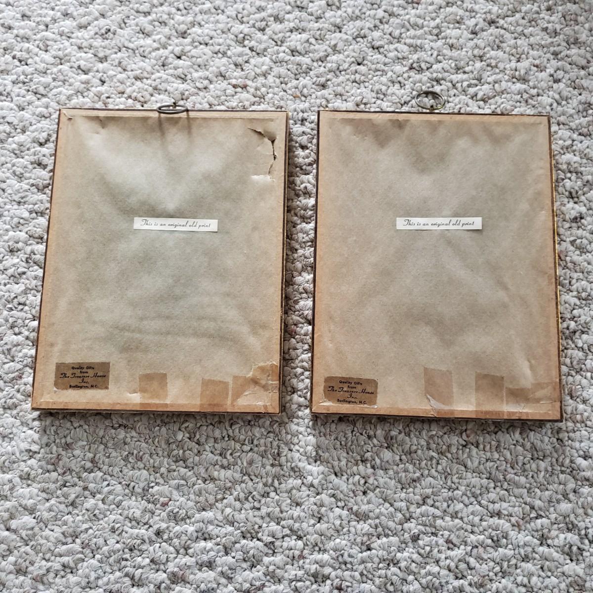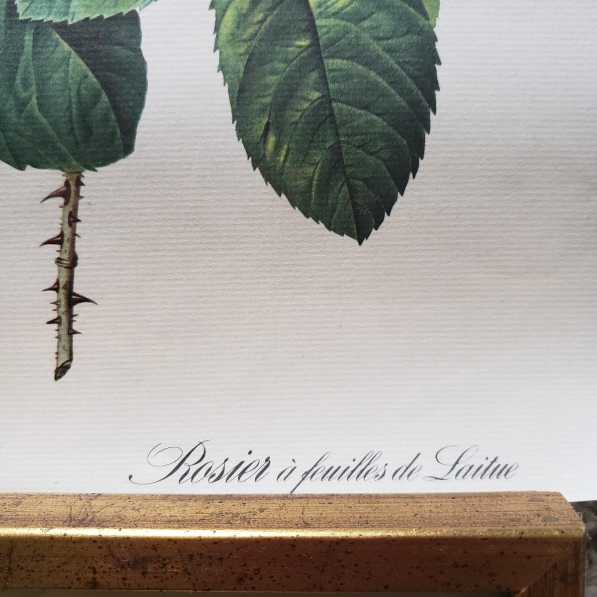 There are four prints in this lot. Two are framed and two are not. The wooden gold frames with glass measure 9" x 7"H. The two rose prints measure 12" x 11"H. The first pictured rose print has writing on the back, see picture.