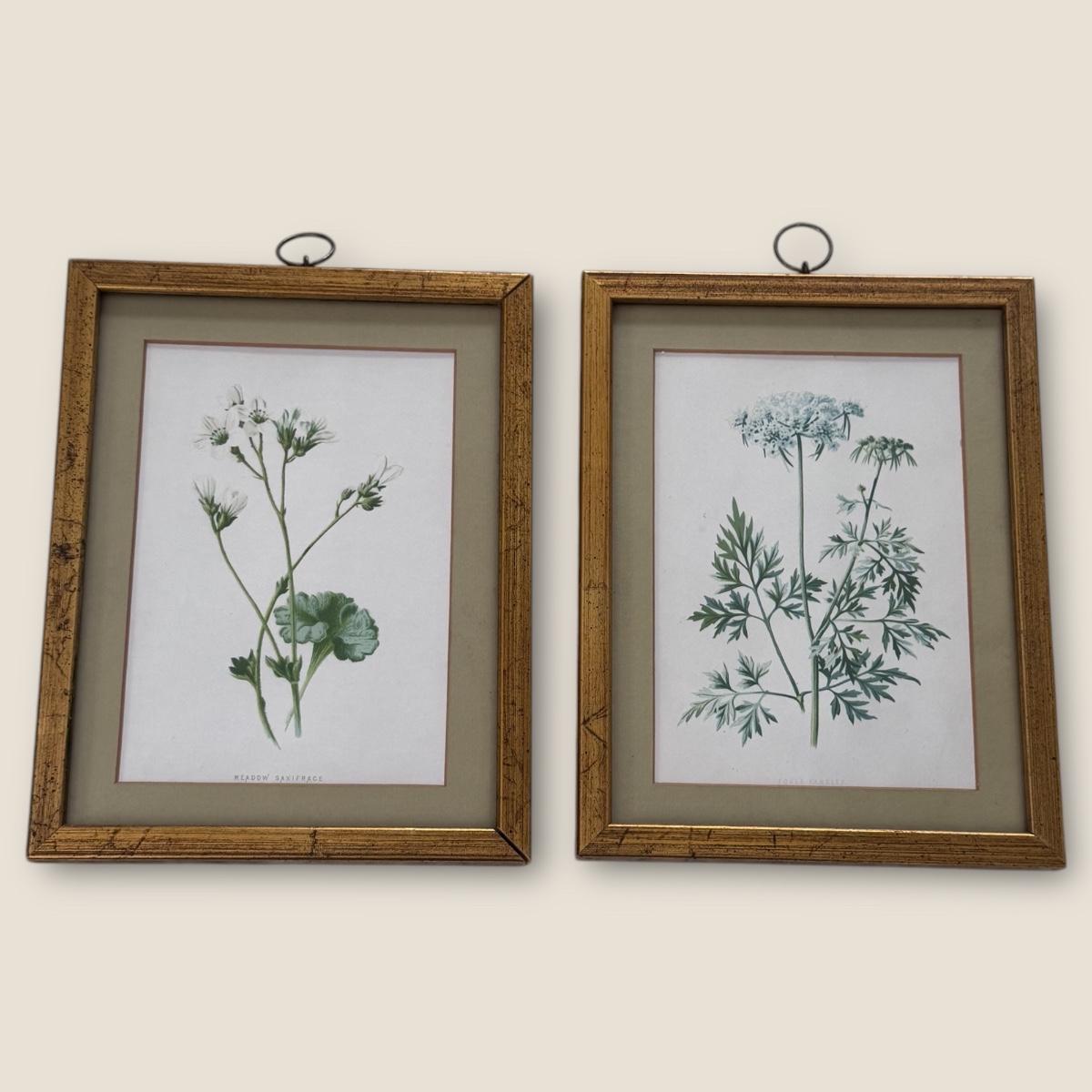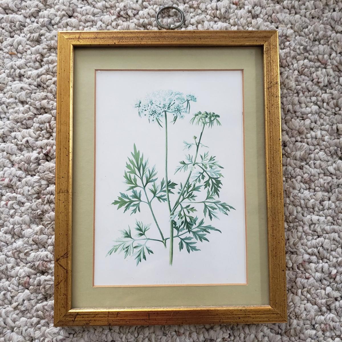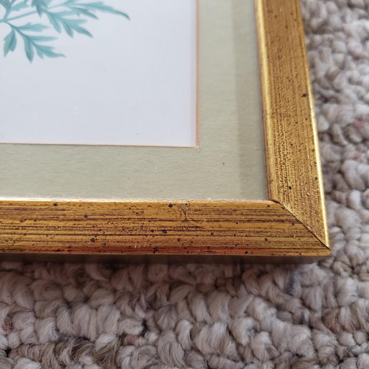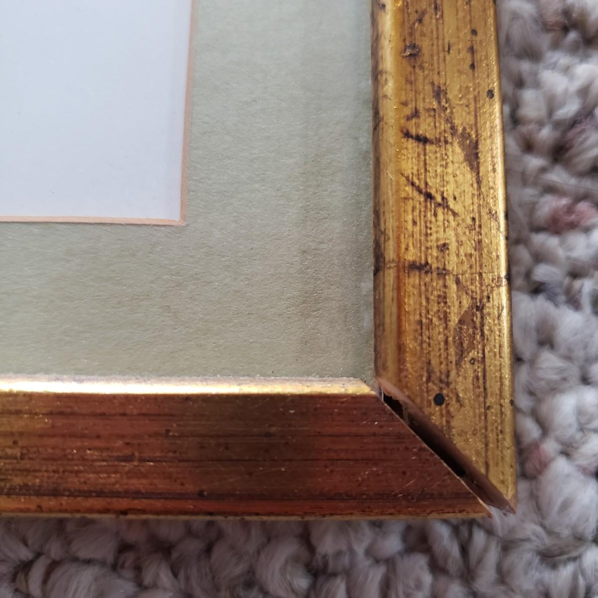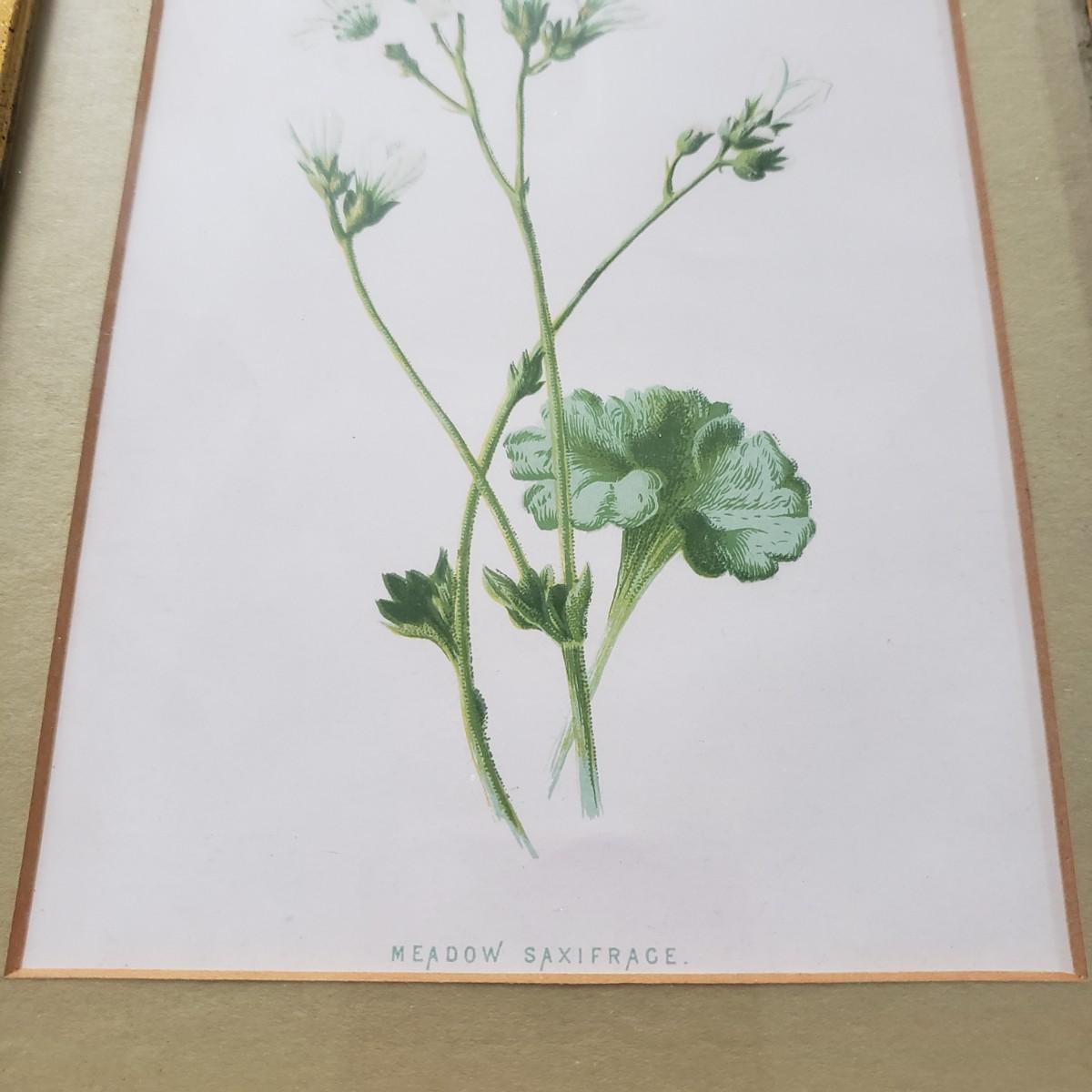 There are four prints in this lot. Two are framed and two are not. The wooden gold frames with glass measure 9" x 7"H. The two rose prints measure 12" x 11"H. The first pictured rose print has writing on the back, see picture.