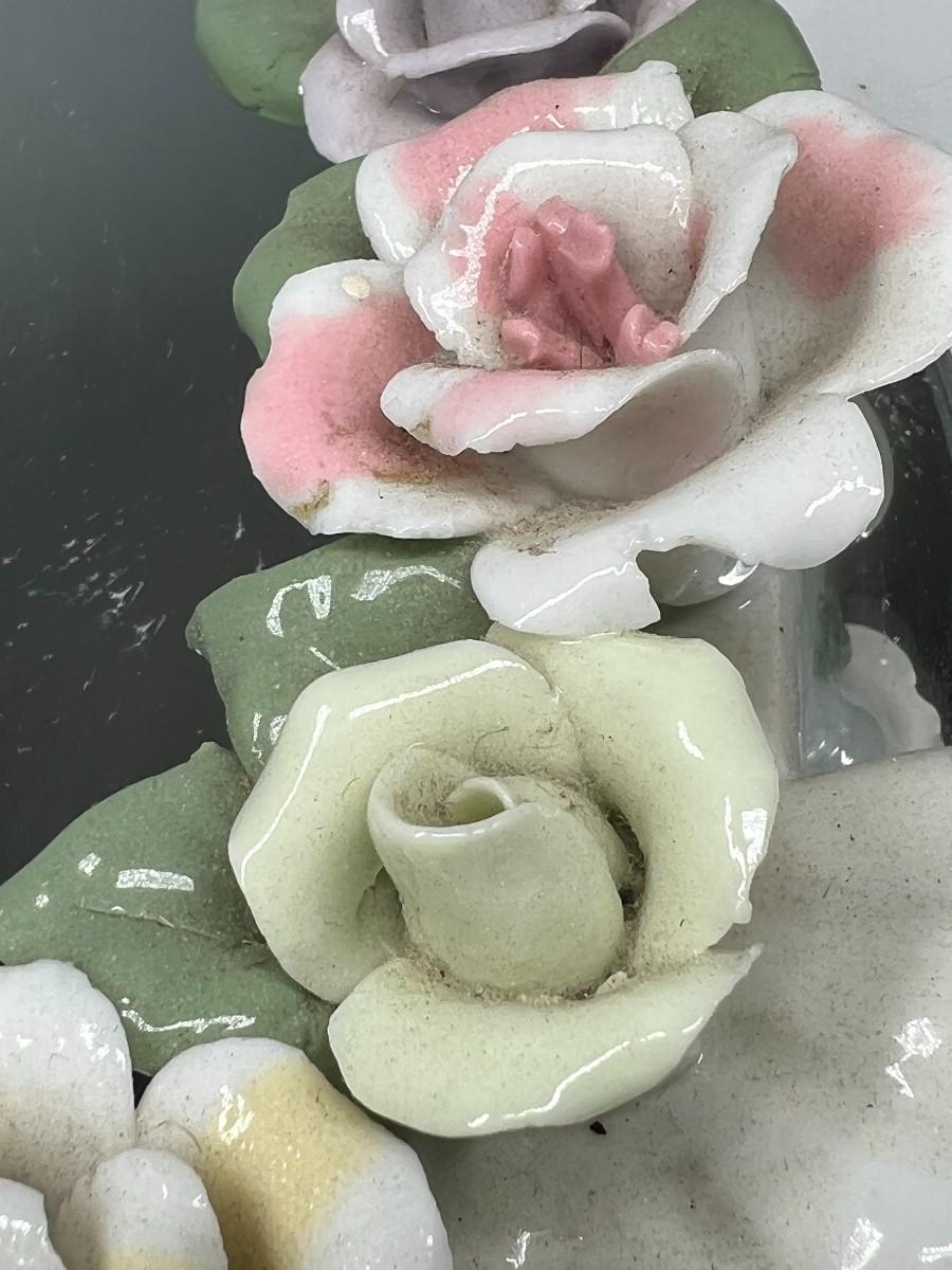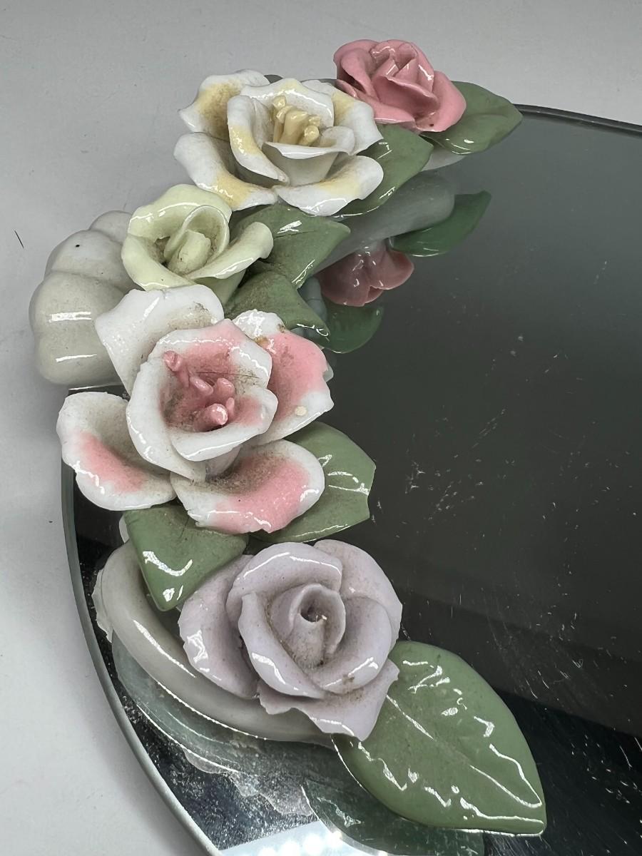 Vintage Floral Rose Edged Vanity Table Mirror Tray. In vintage condition. There are some chips along petal edges and scratches to mirror but will still display nicely for use. About 12" size.