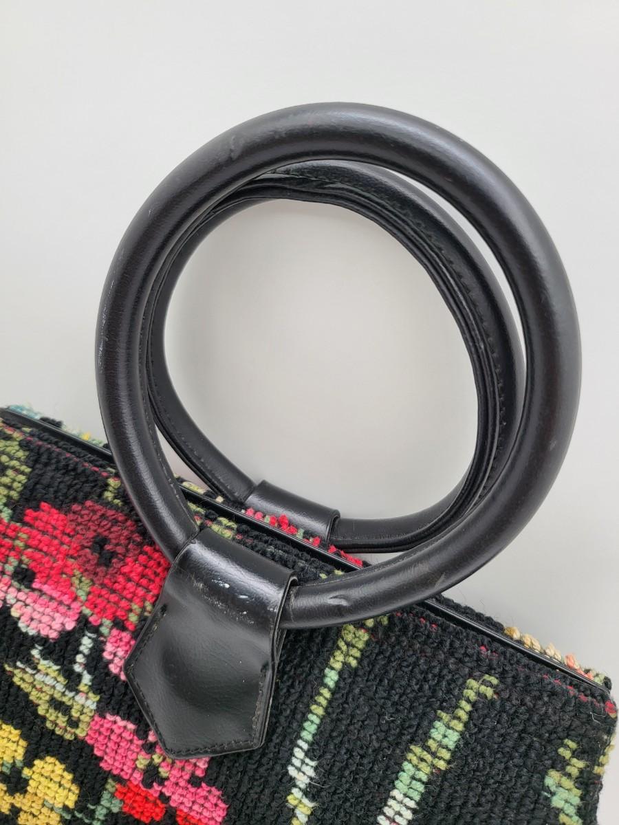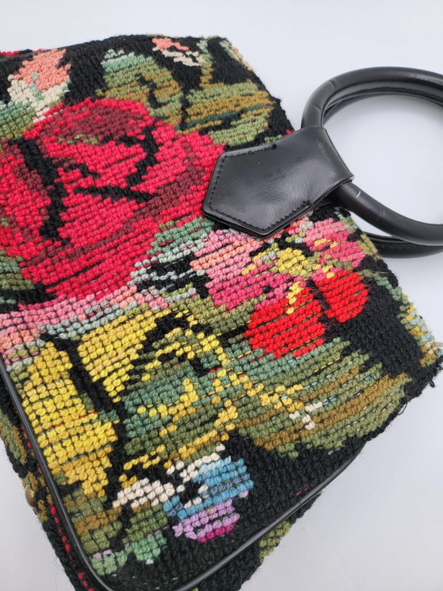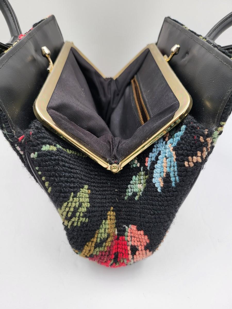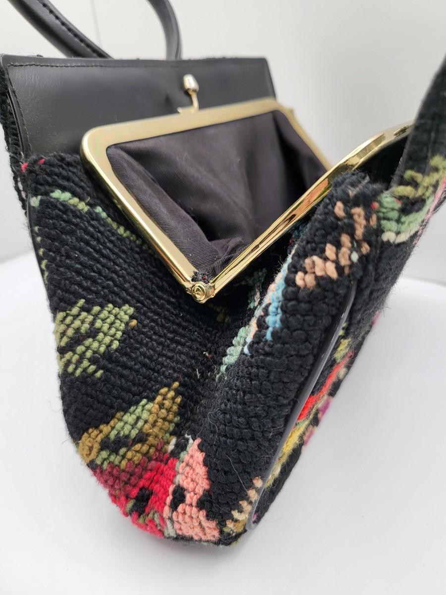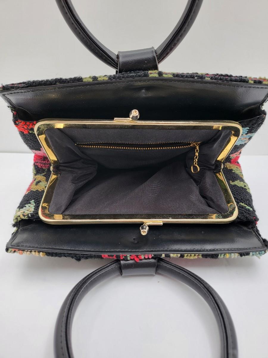 Round, 4" double hand strap. Colorful floral tapestry with black background. Measures 10" long x 7" tall x 2.5" deep. Center kiss clasp compartment and two open compartments on either side.