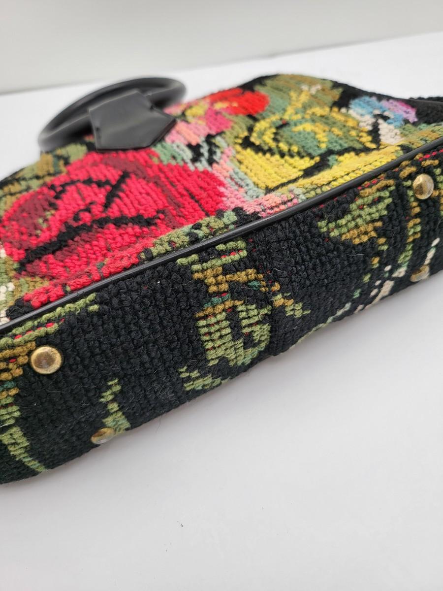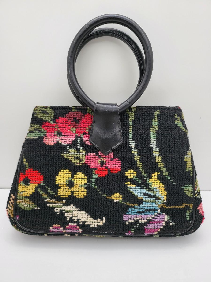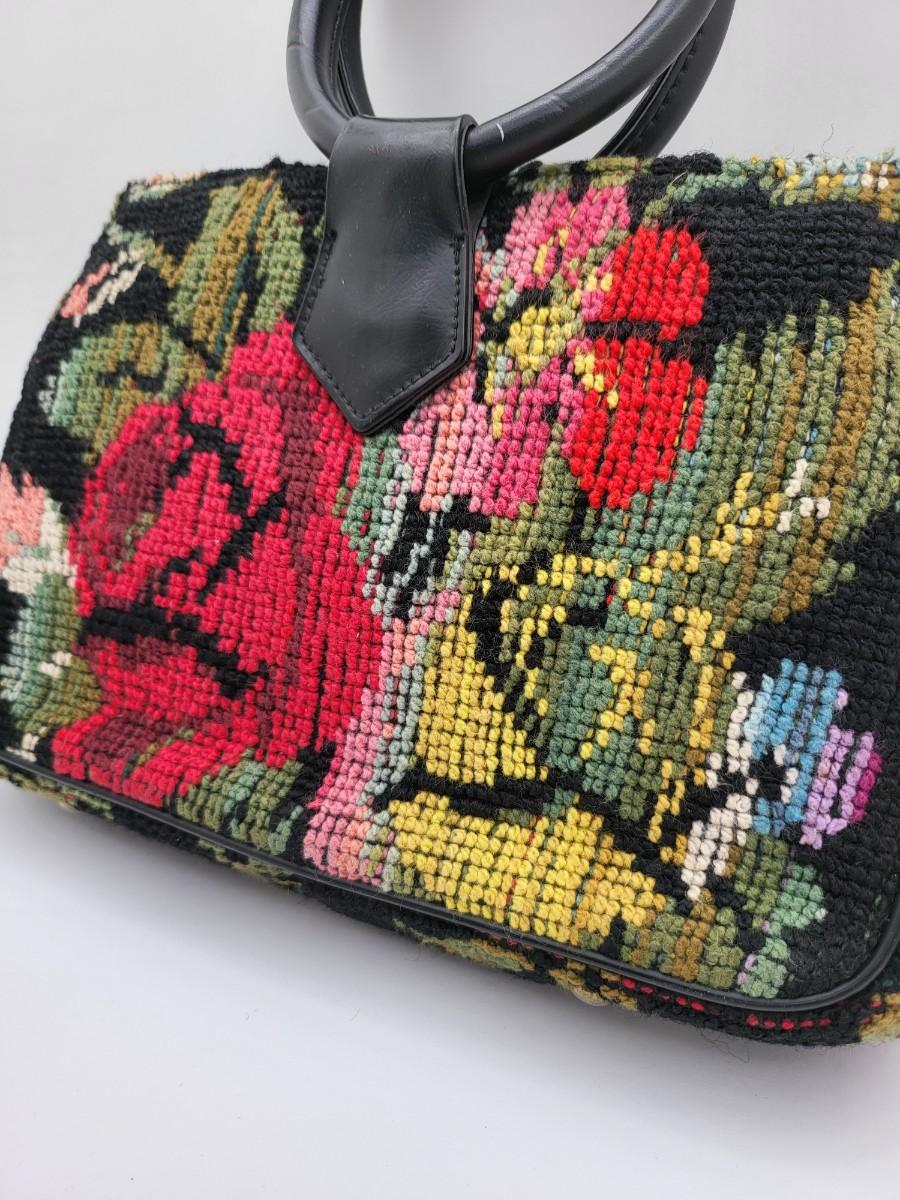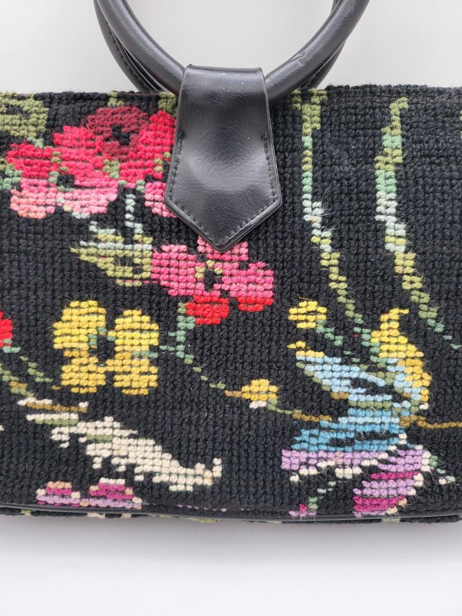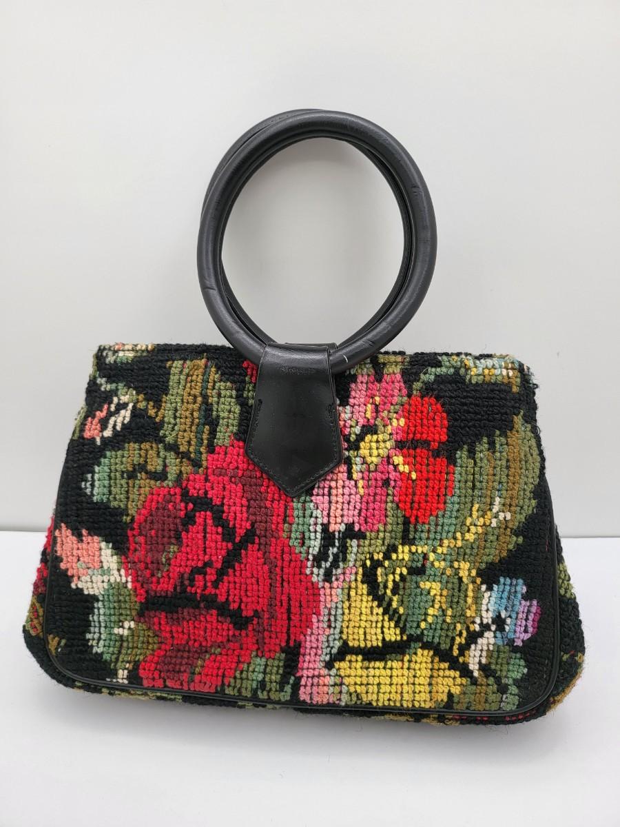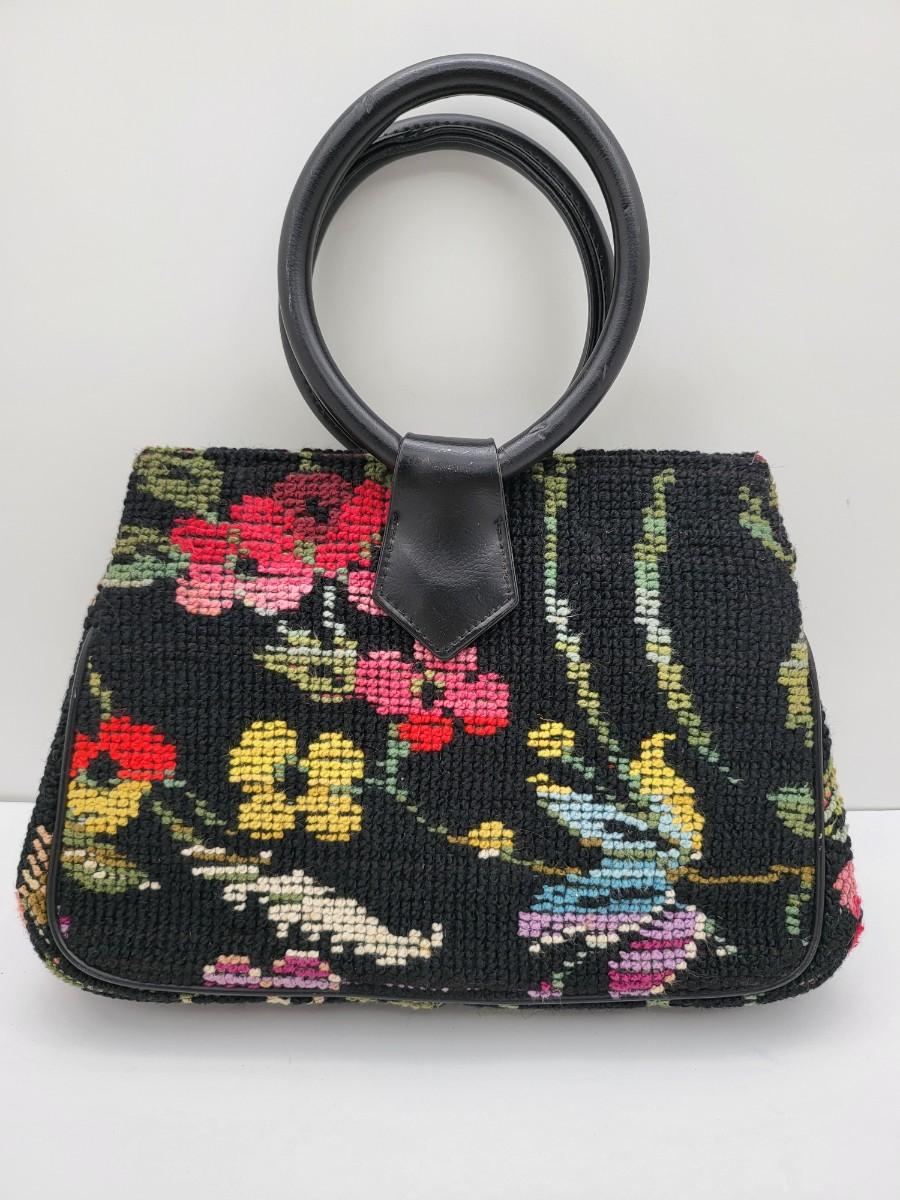 Round, 4" double hand strap. Colorful floral tapestry with black background. Measures 10" long x 7" tall x 2.5" deep. Center kiss clasp compartment and two open compartments on either side.