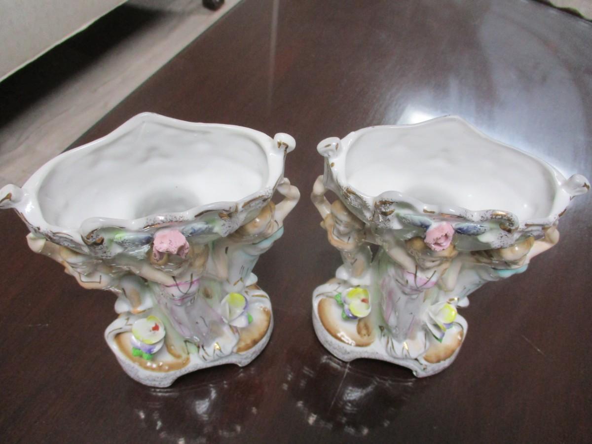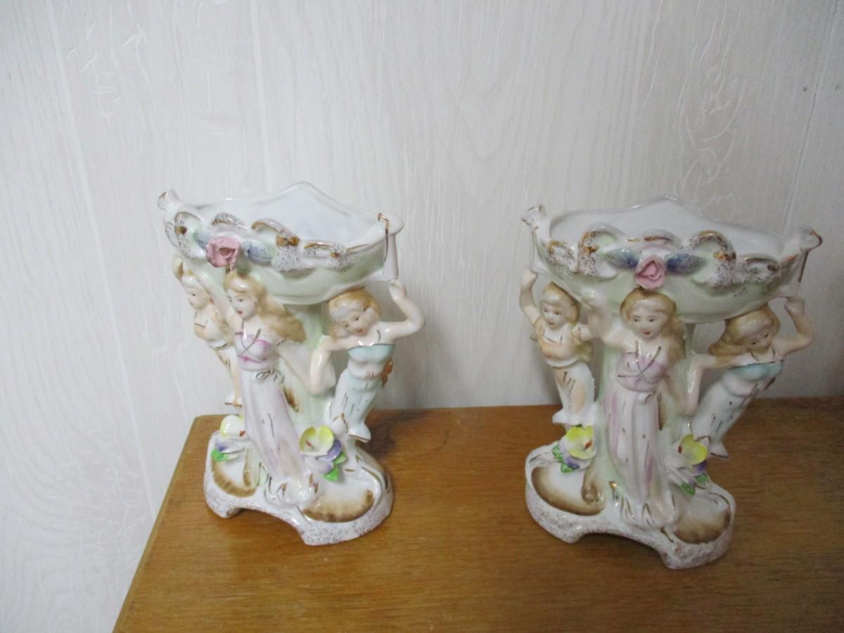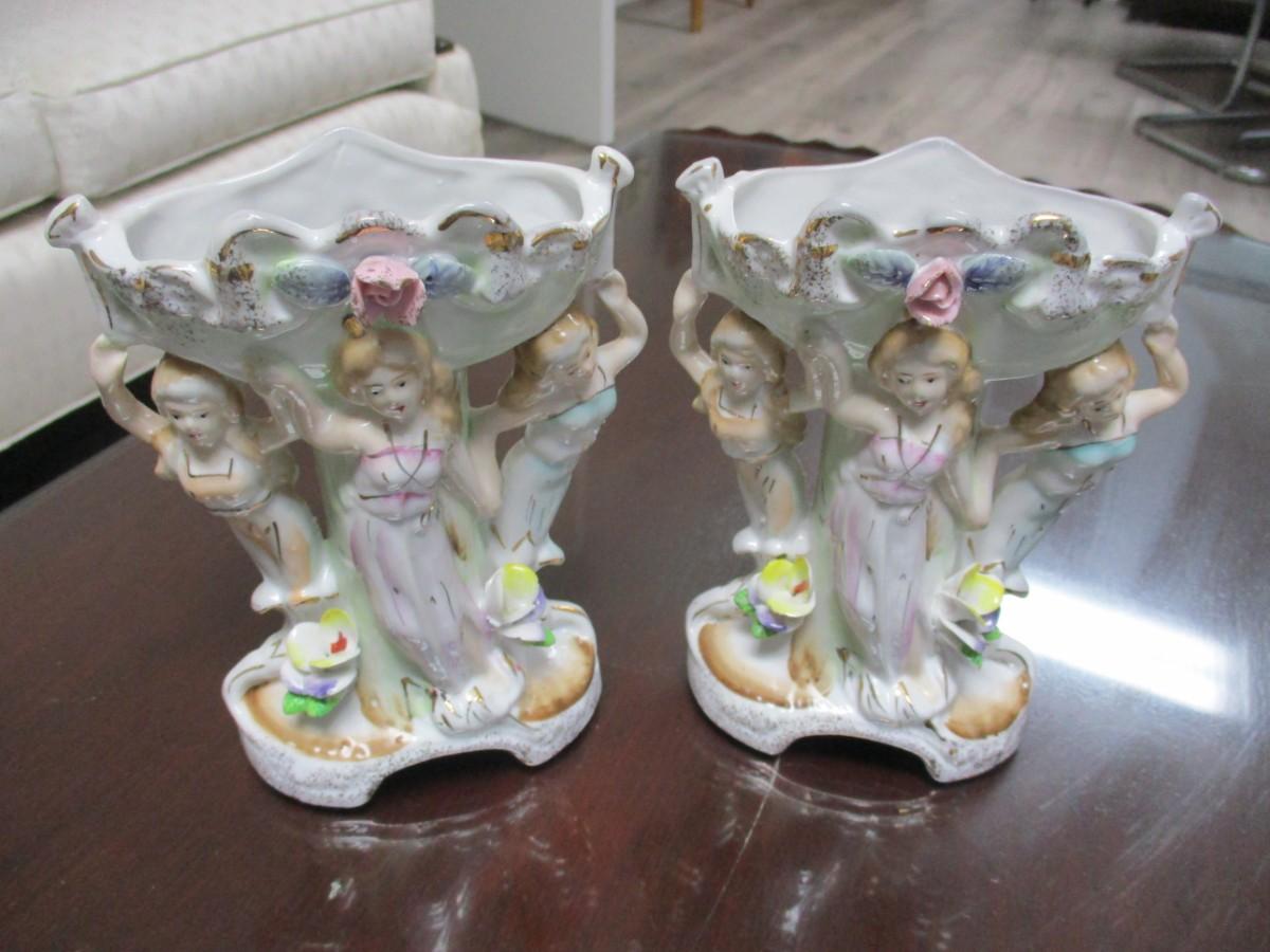 Pair of Vintage Floral Three Ladies Ceramic Vases - H