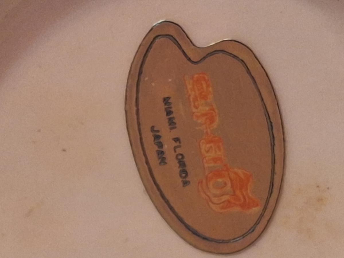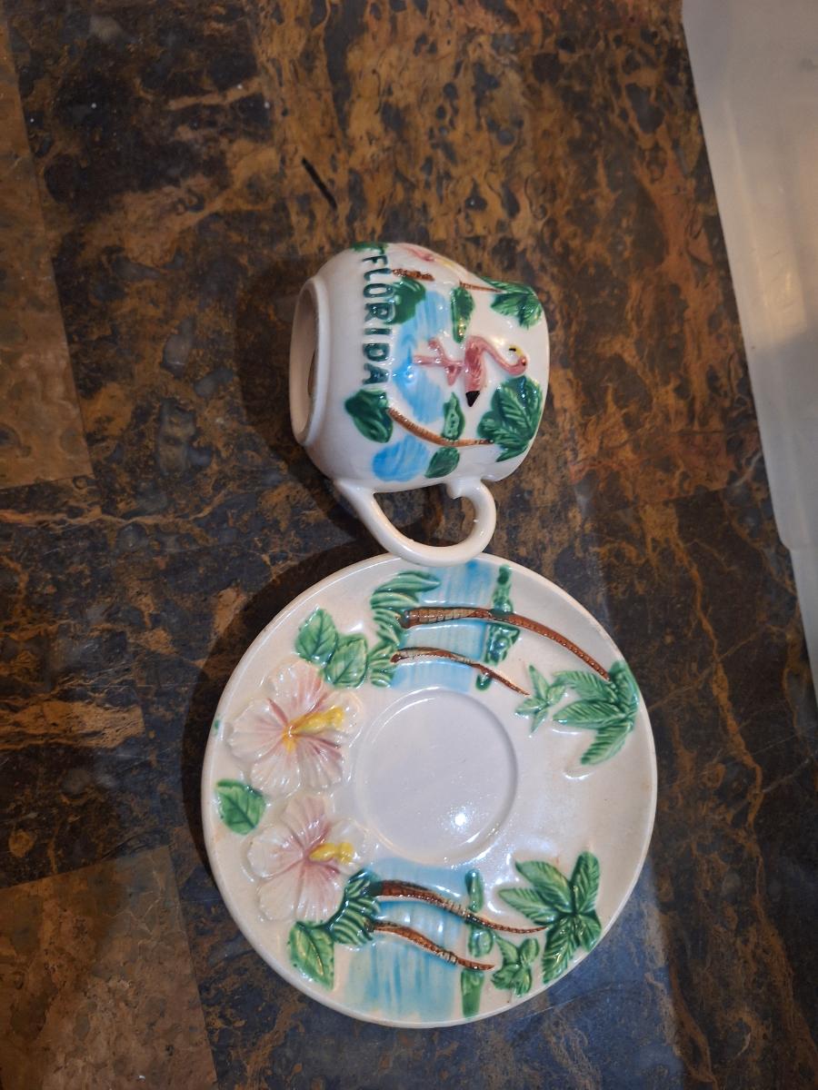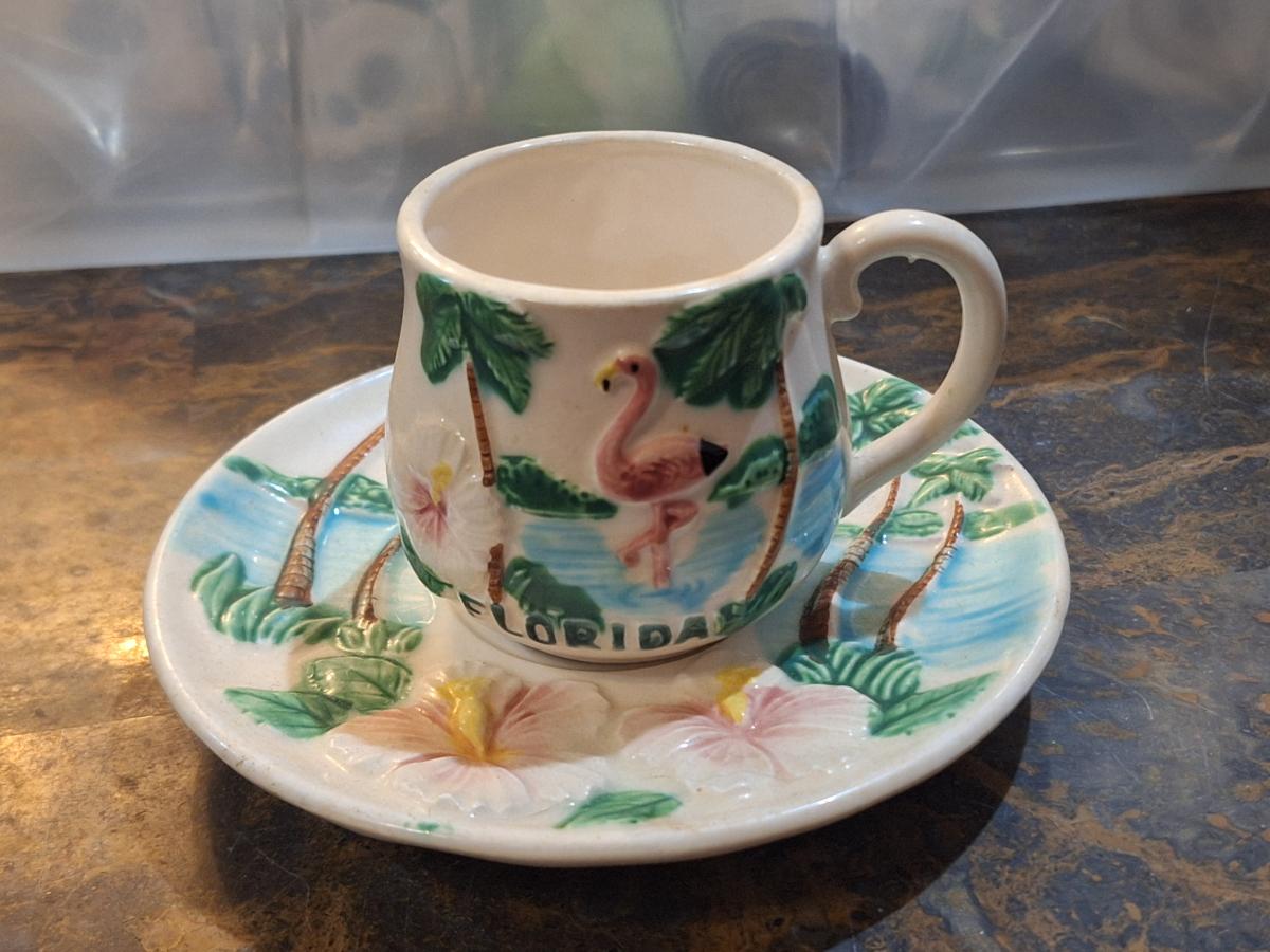 vintage Florida souvenir ceramic demitasse cup and saucer set featuring a pink flamingo and palm trees.