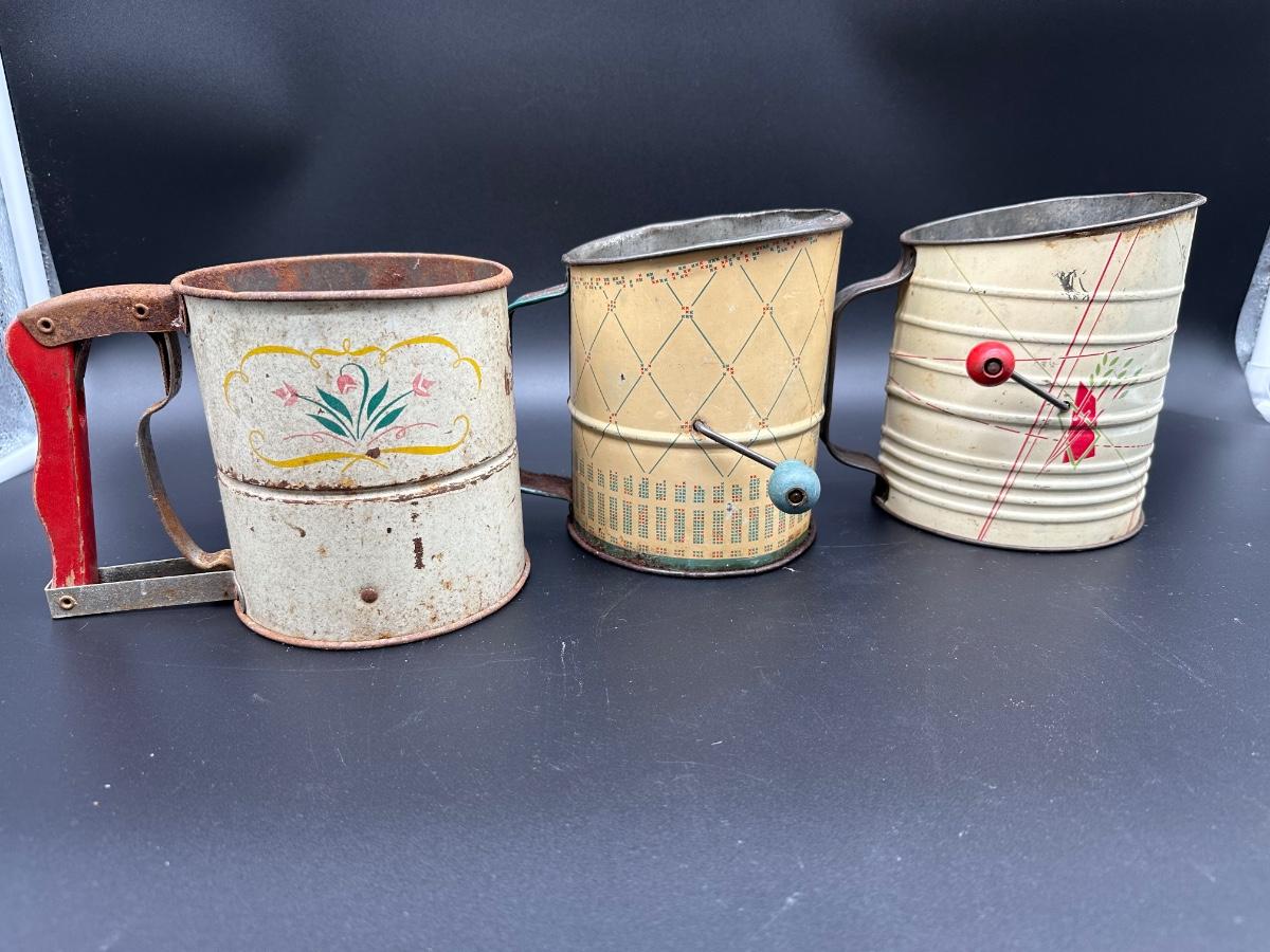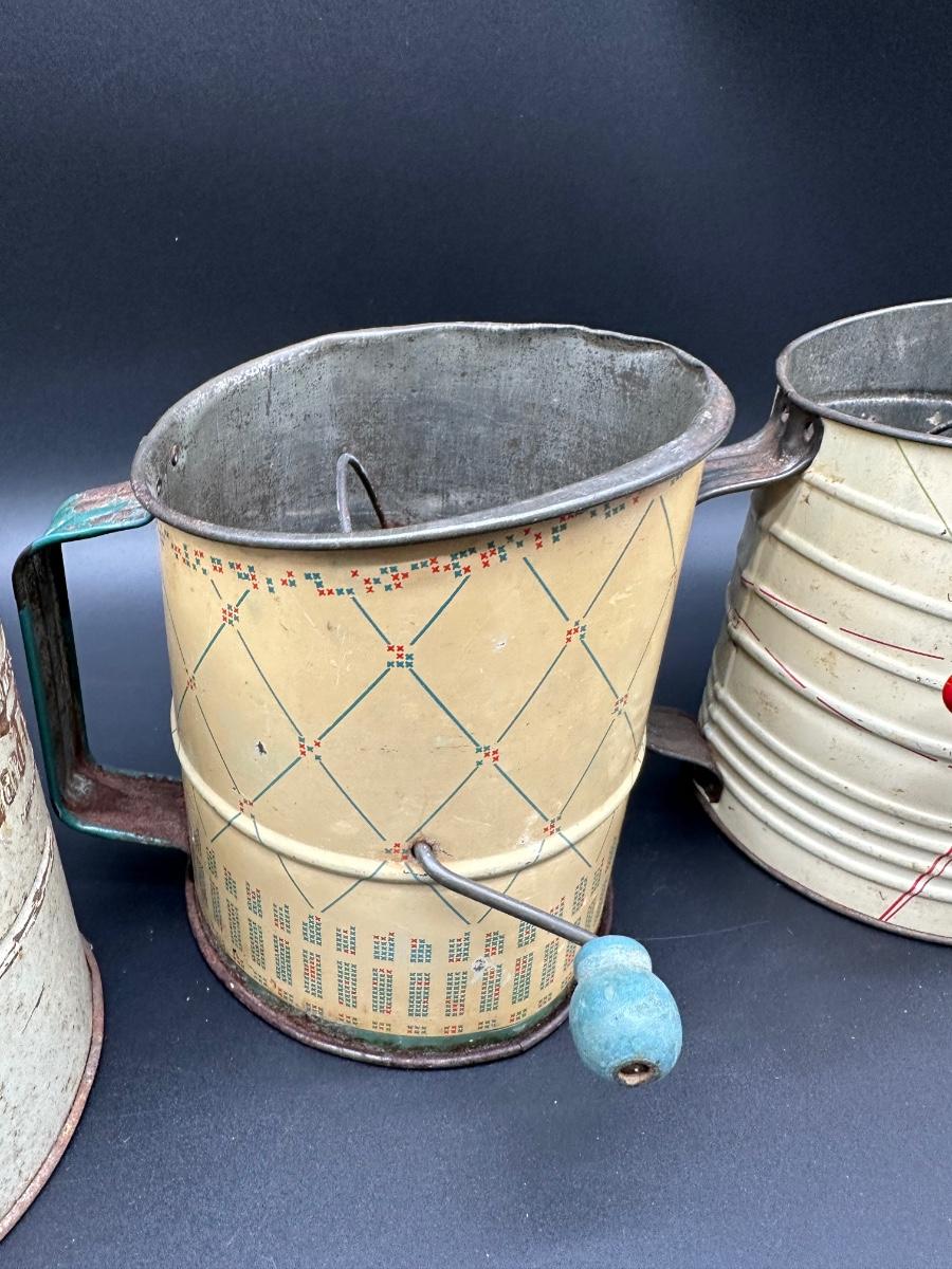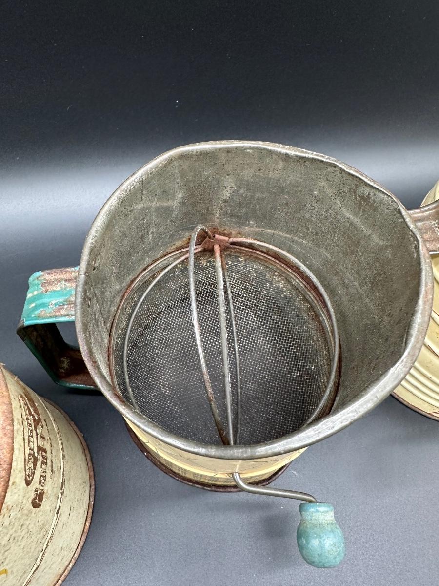Vintage Flour Sifters Lot – Hand Crank Tin & Enamelware Kitchen Sifters (3)