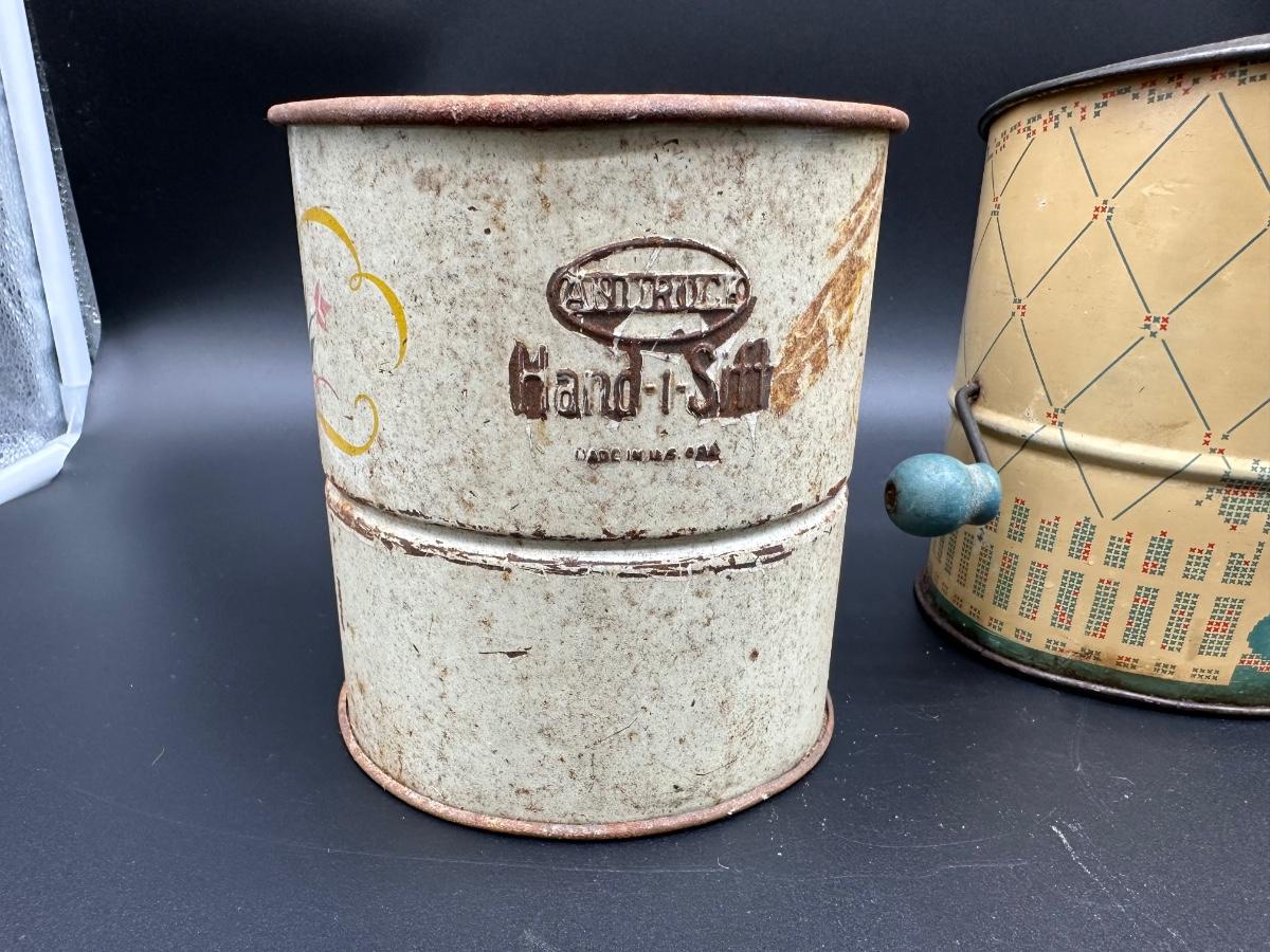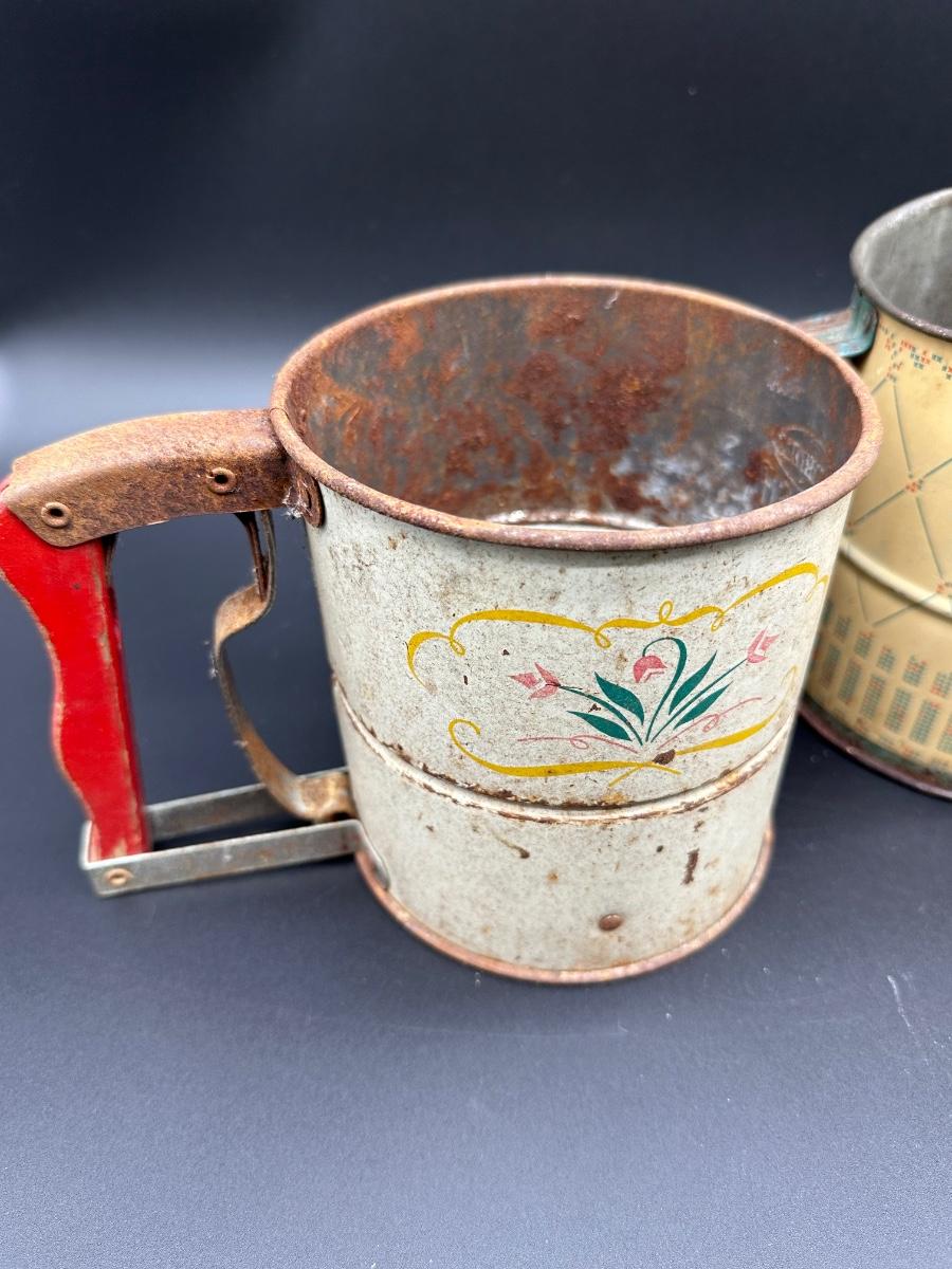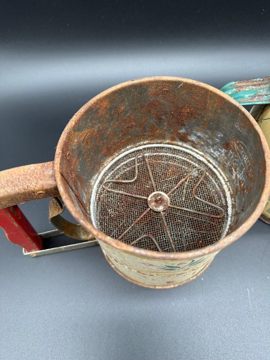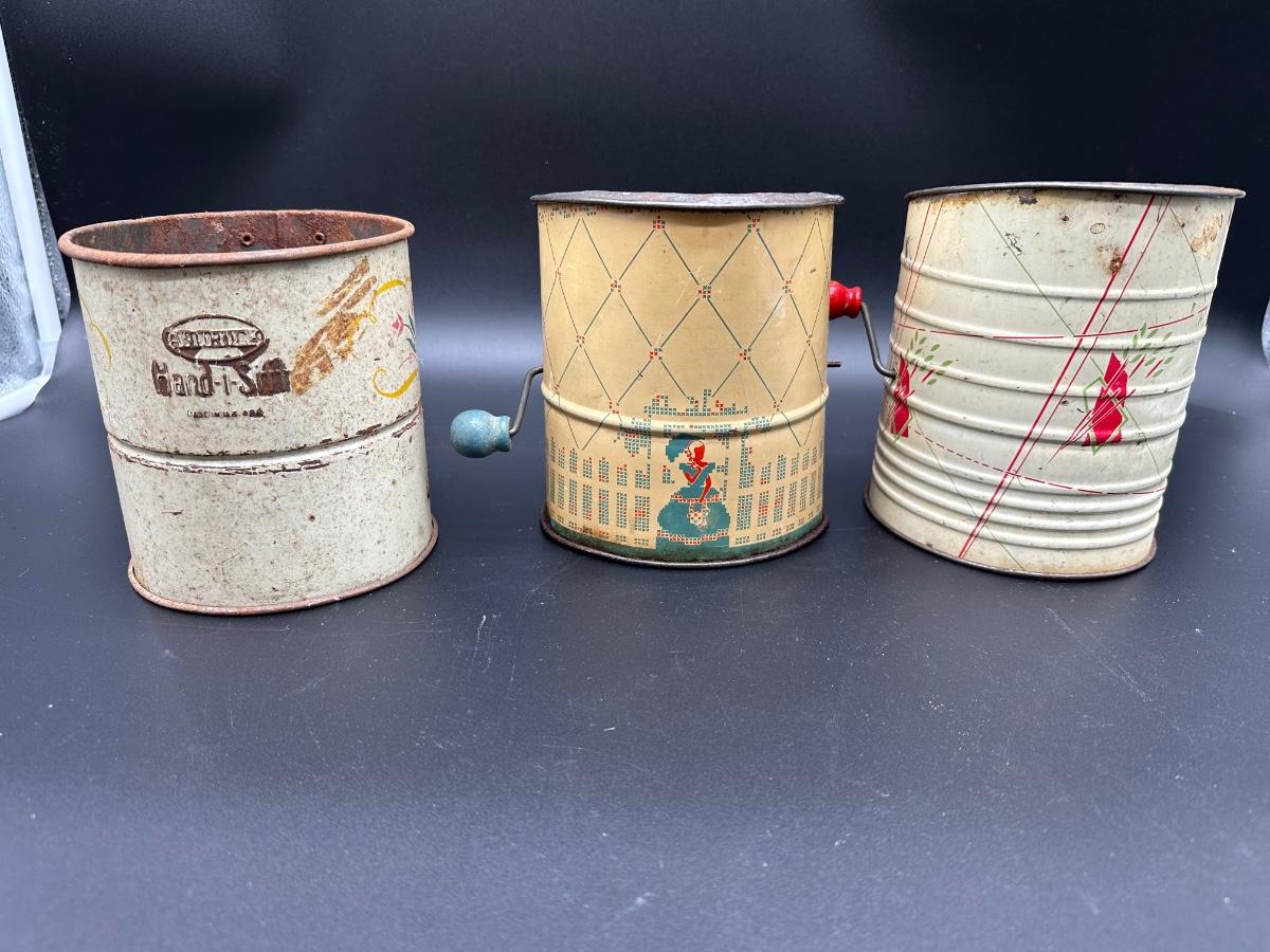 Vintage Flour Sifters Lot – Hand Crank Tin & Enamelware Kitchen Sifters (3)