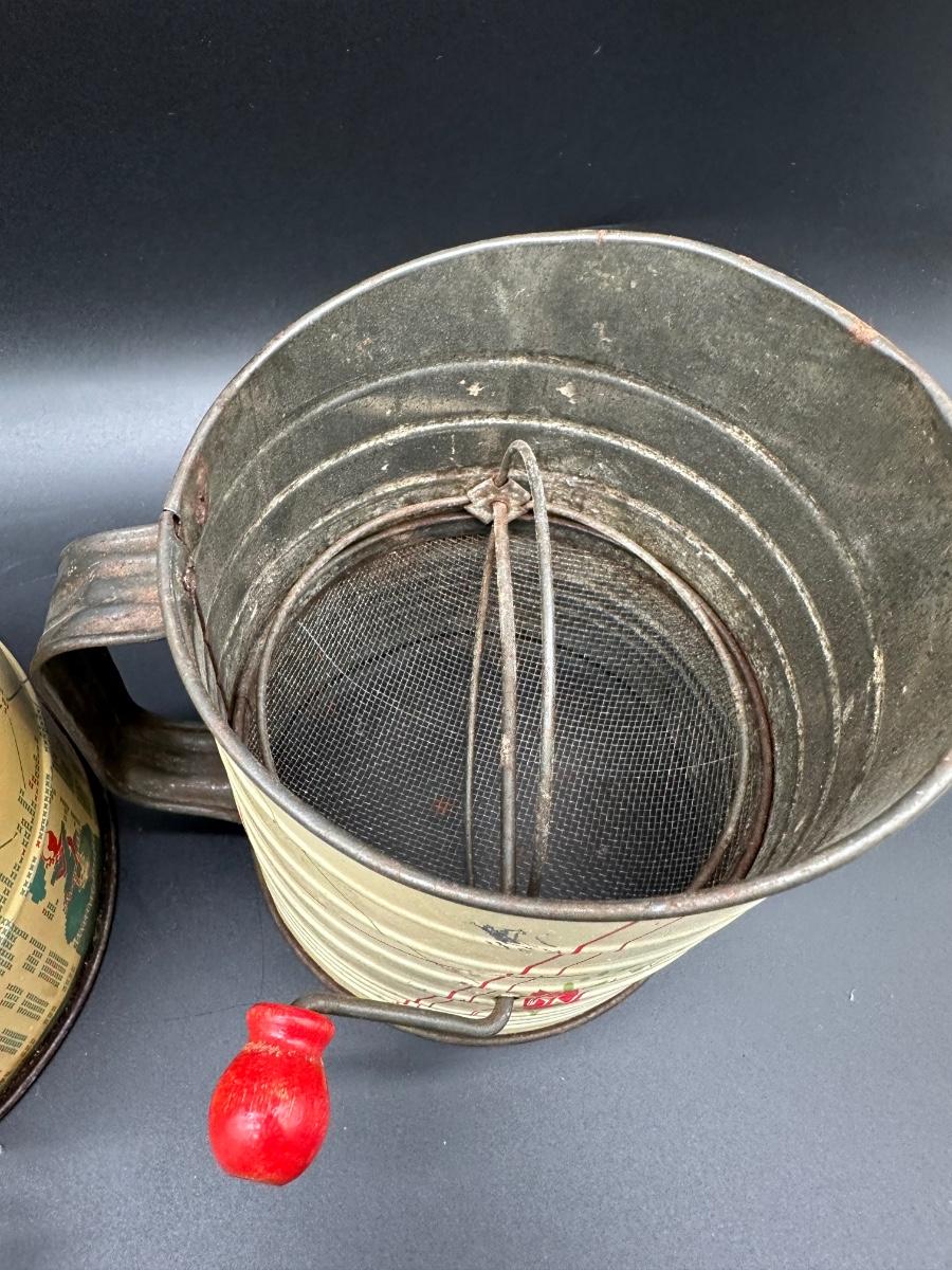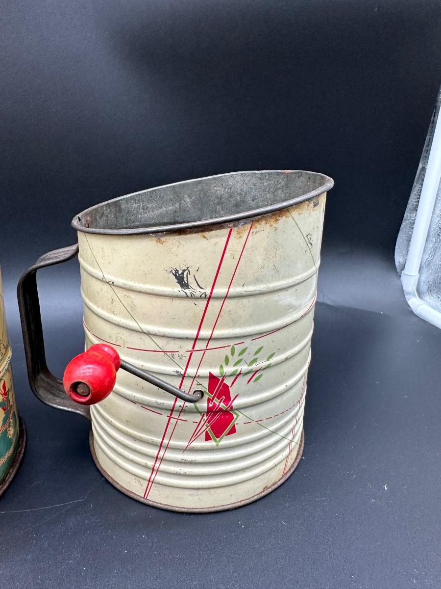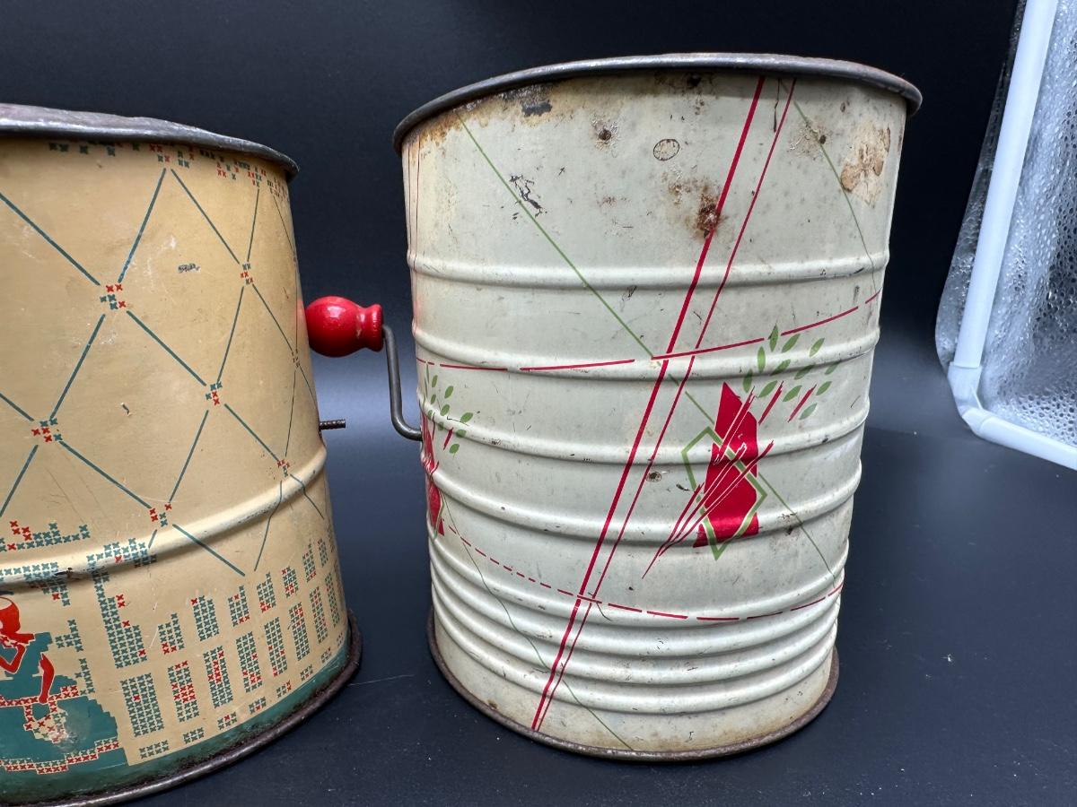 • Two additional vintage tin sifters with original painted graphics and wooden crank knobs