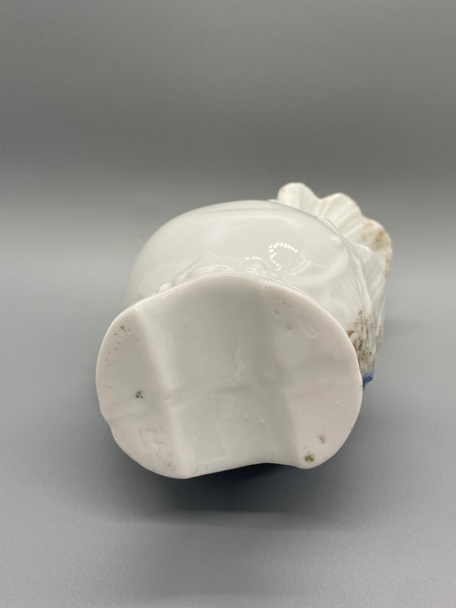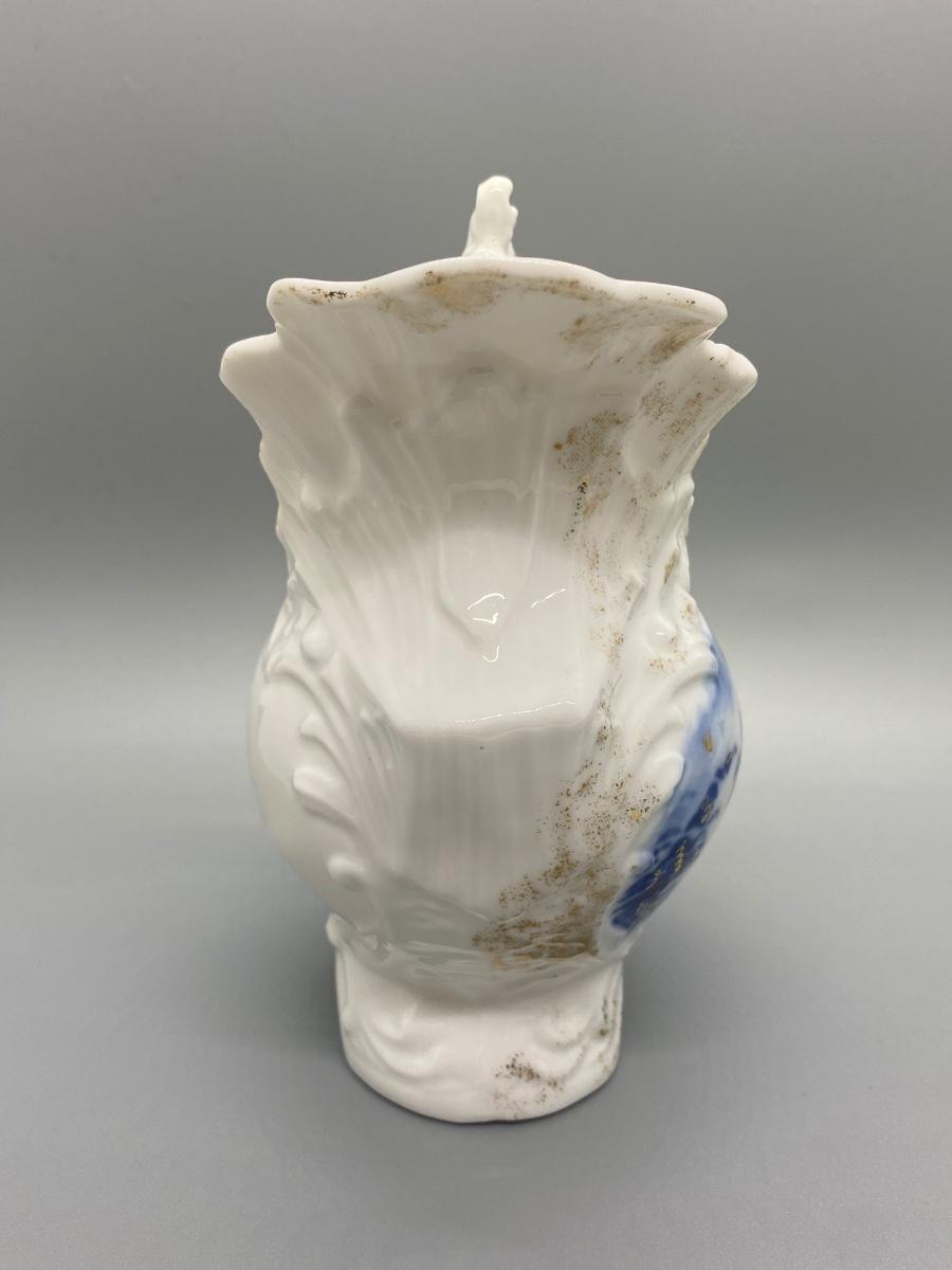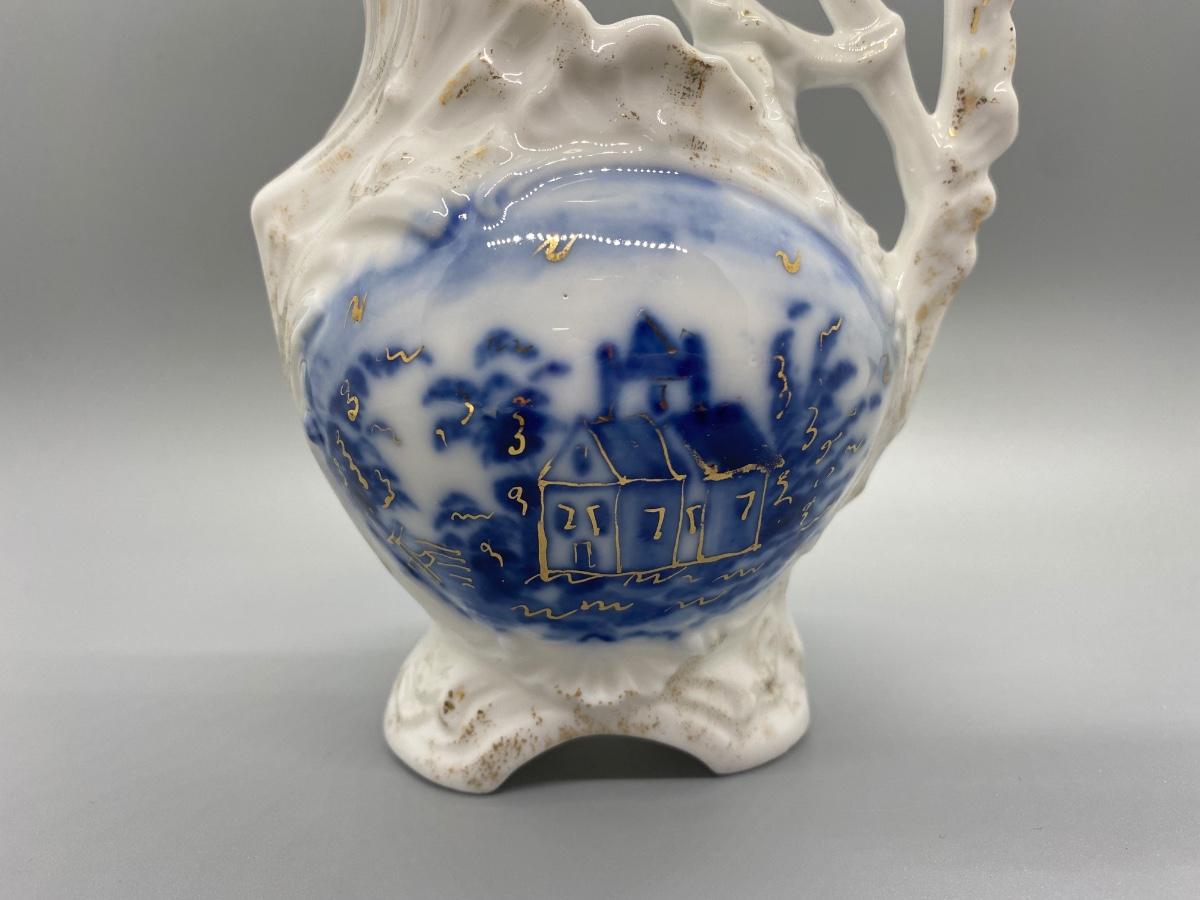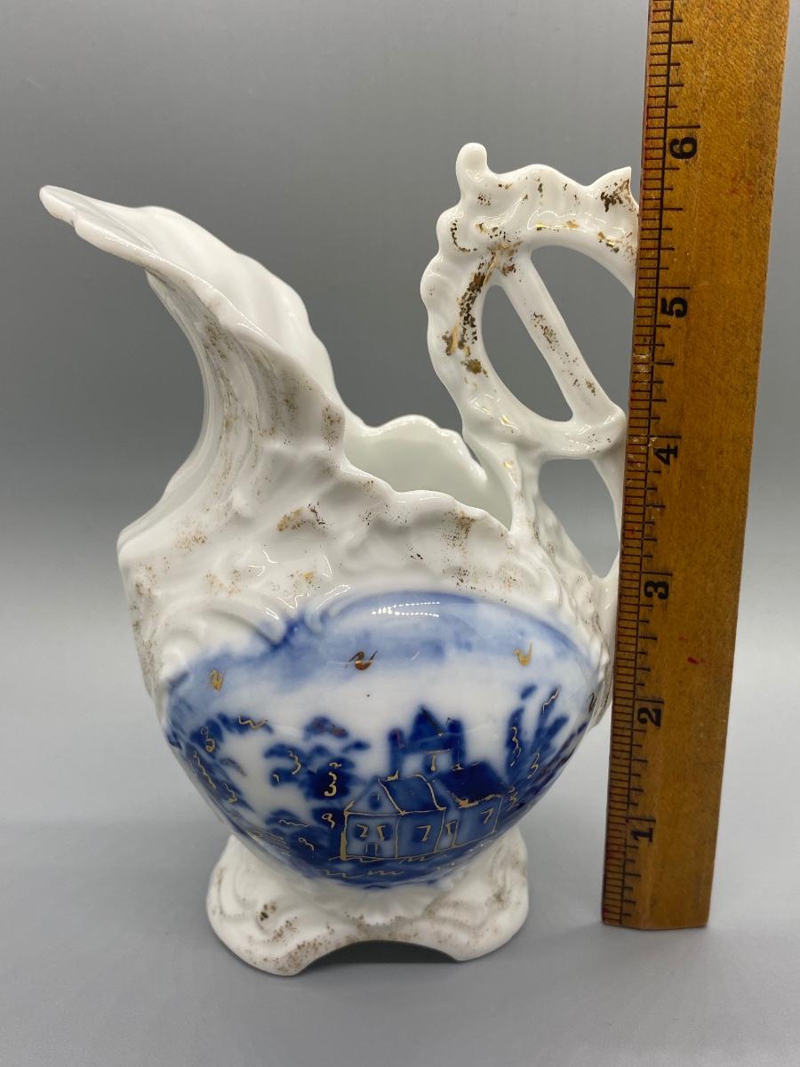 Vintage flow blue on white creamer pitcher. Worn gold accents. No chips, good condition. No maker mark noticed. About 6" tall.