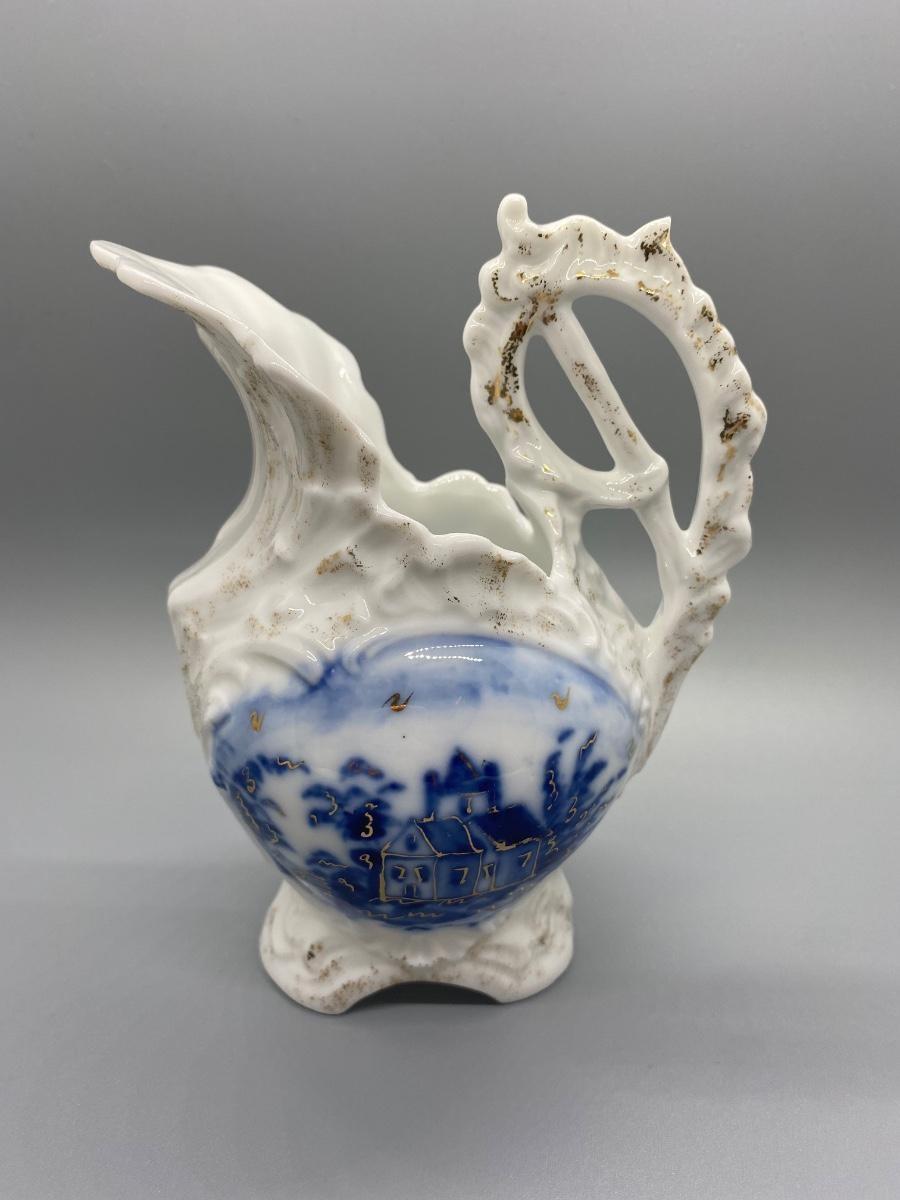 Vintage flow blue on white creamer pitcher. Worn gold accents. No chips, good condition. No maker mark noticed. About 6" tall.