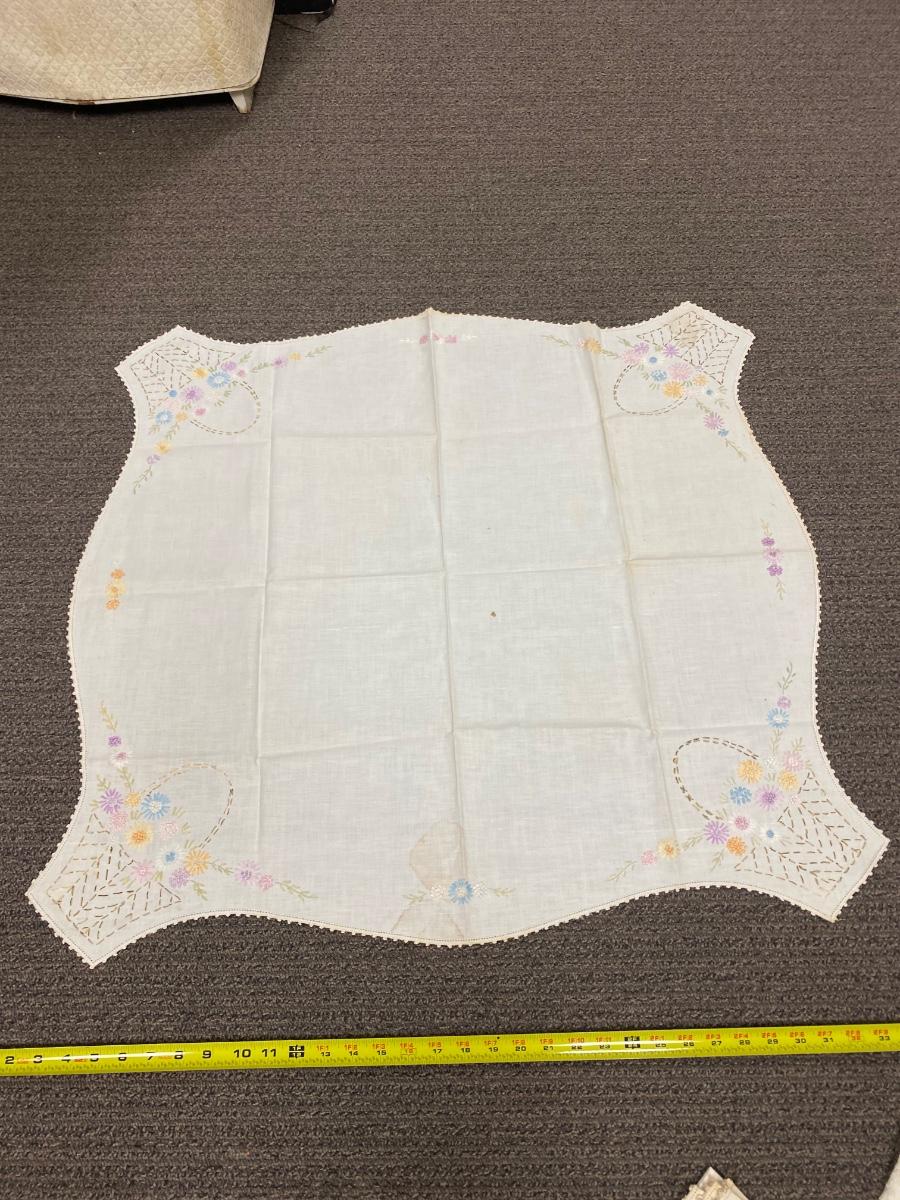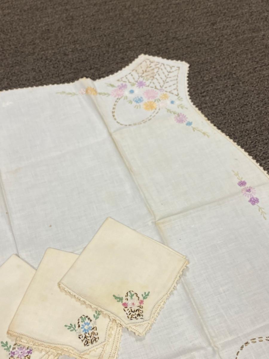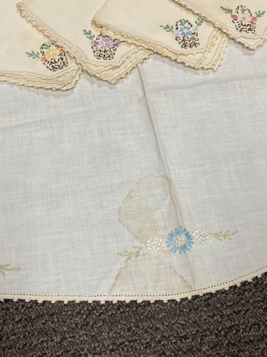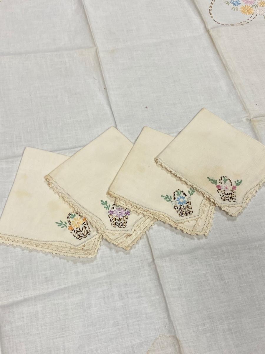 Vintage Flower Basket Embroidered Tablecloth and 4 Matching Napkins. Card table size tablecloth. There is light discolor, more on the napkins then the tablecloth.