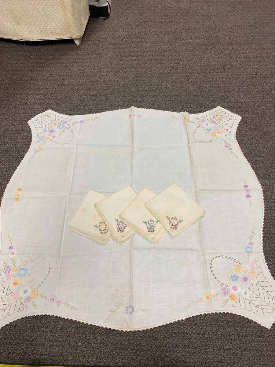 Vintage Flower Basket Embroidered Tablecloth and 4 Matching Napkins