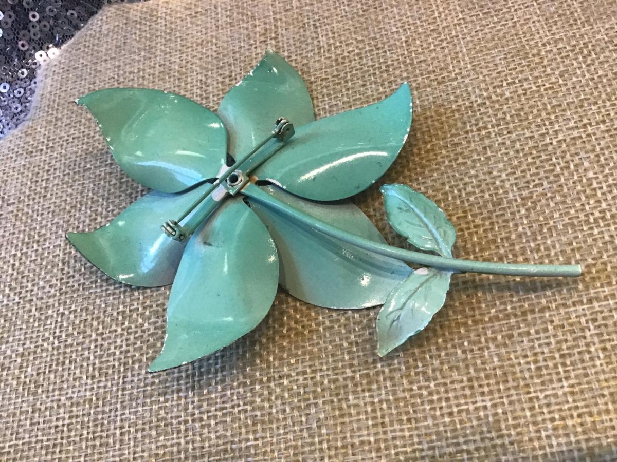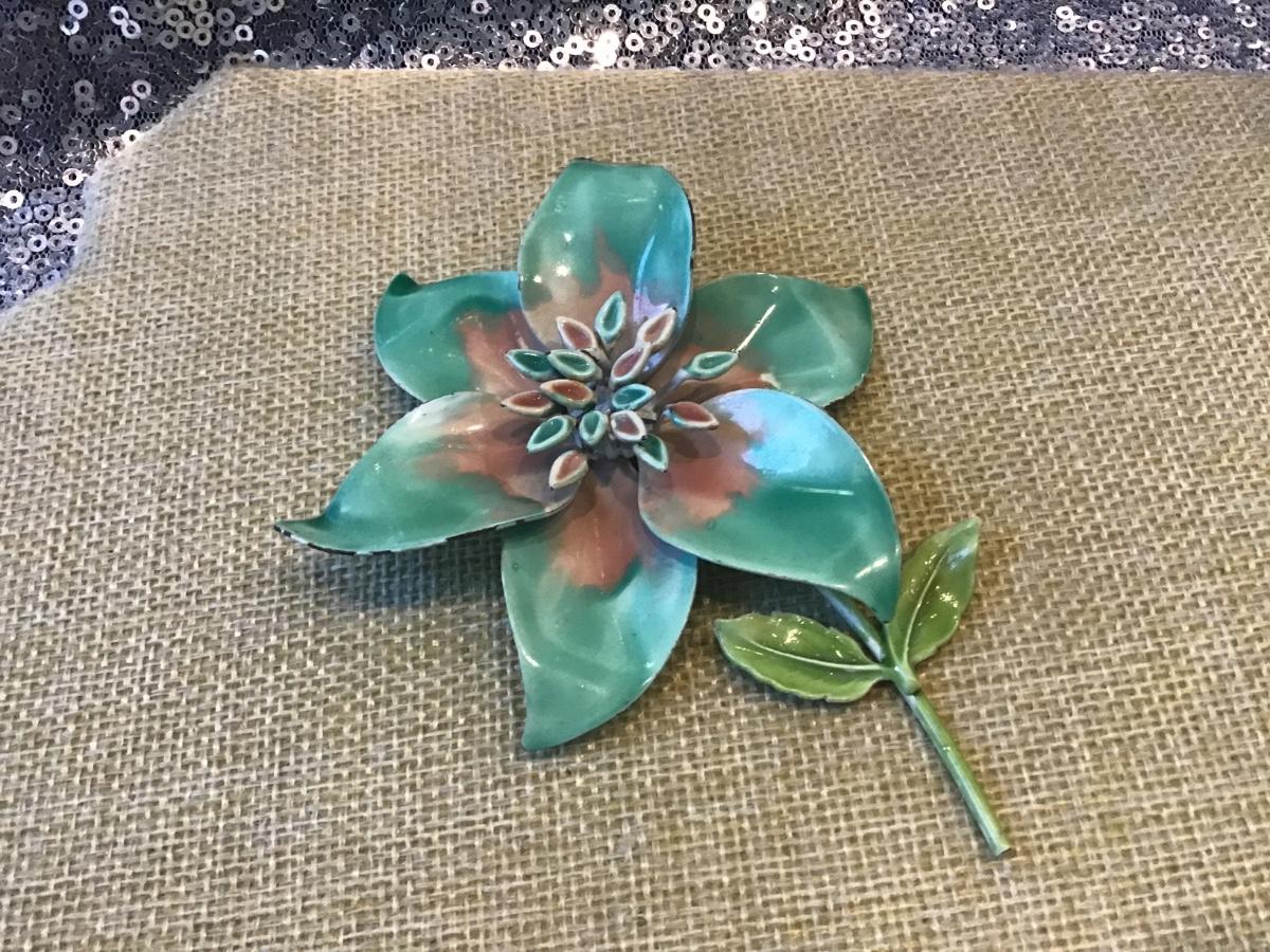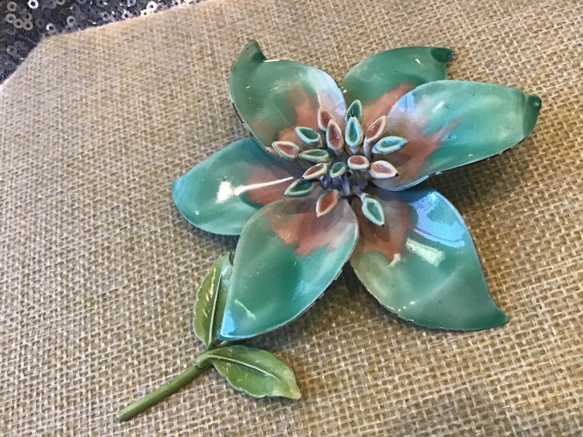 Vintage Flower Brooch Pin - Blue Green Tan Enamel -