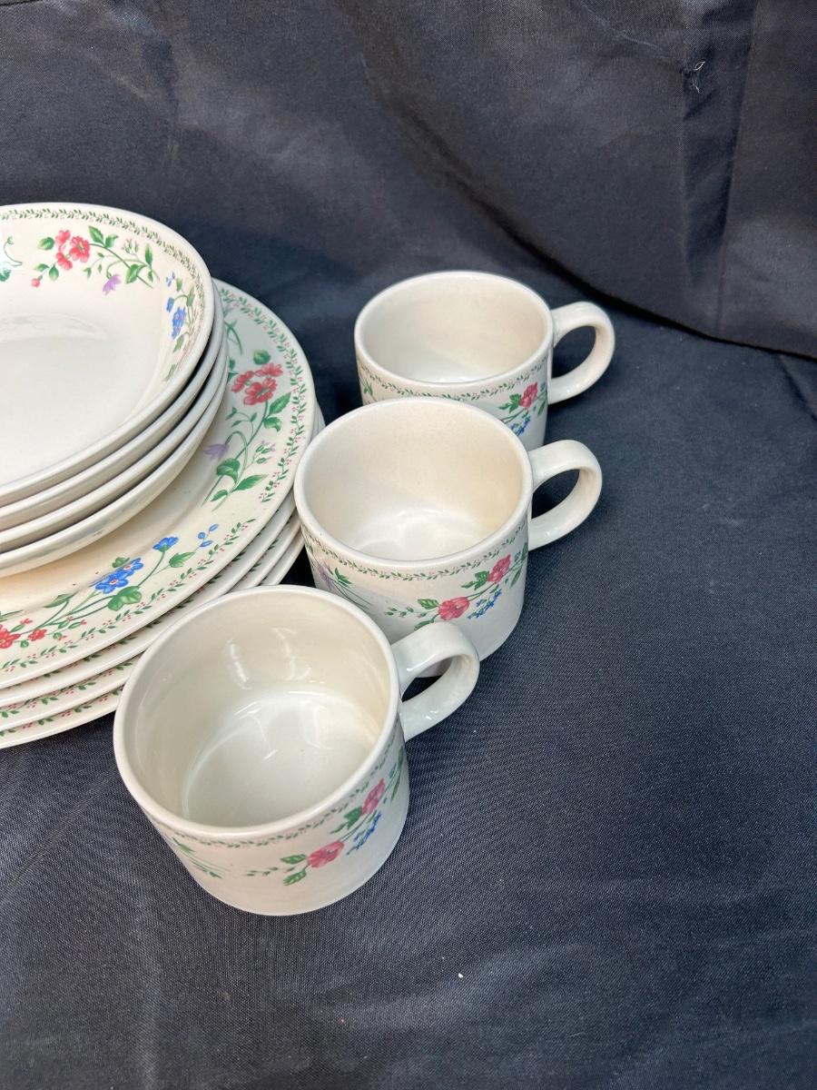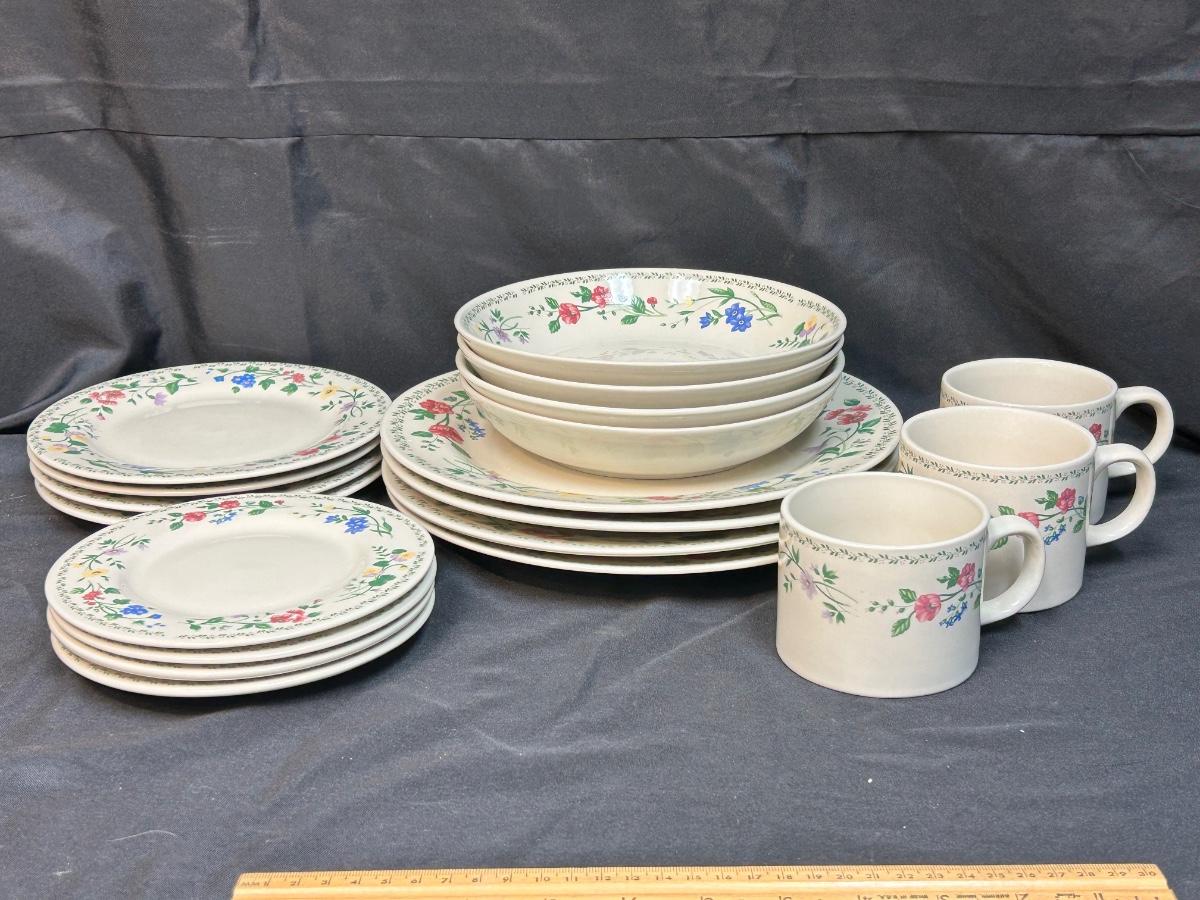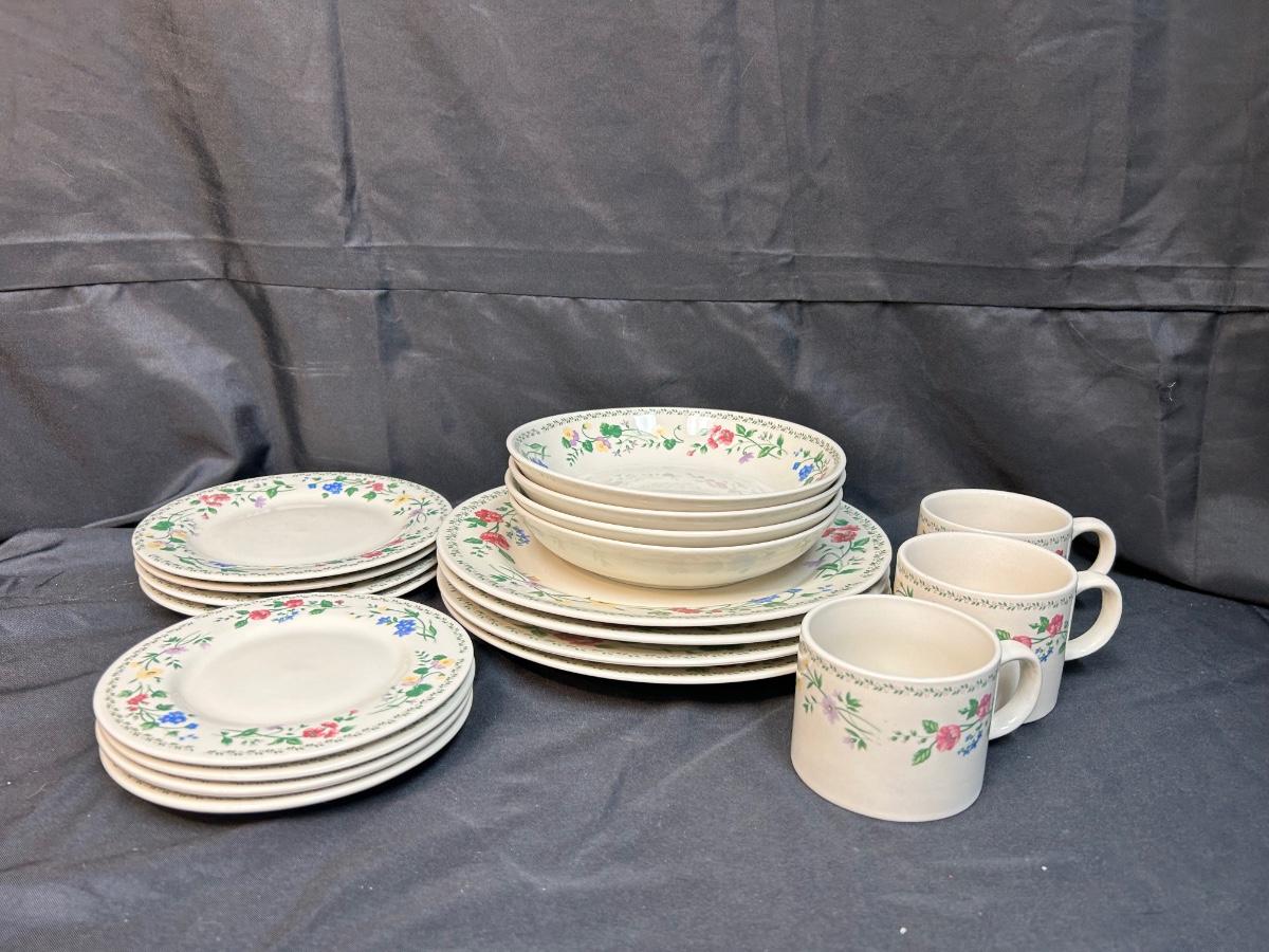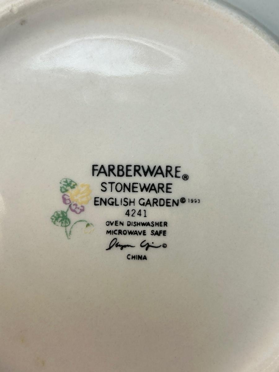 Vintage Flower Pattern Farberware Stoneware Service for Four English Garden 4241 Missing One Cup. Includes 4 pieces each dinner plate, bread plate, saucer, soup bowl and three cups. In good used condition. May have a flea bite chip or two but did not notice any major chips or damage.
