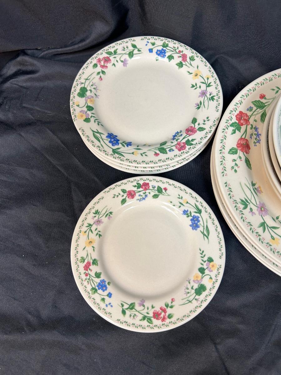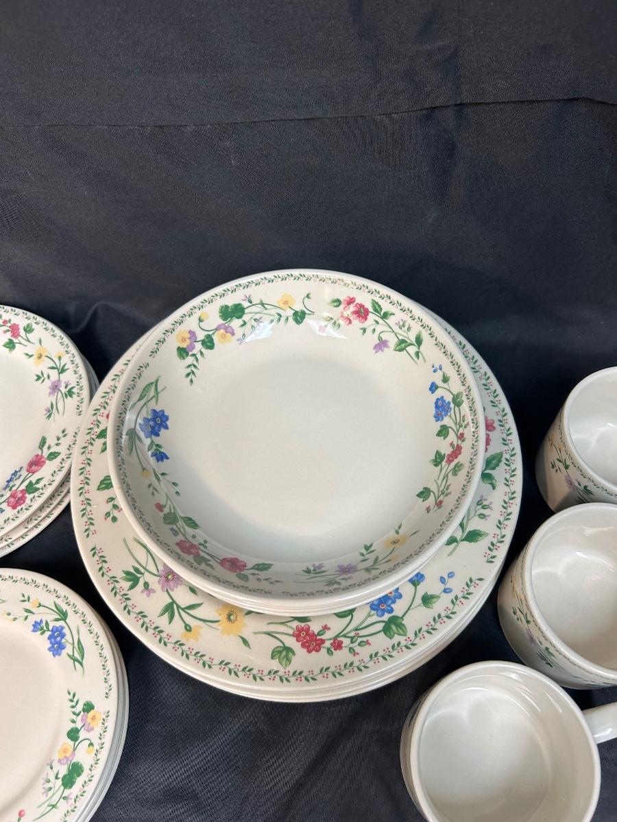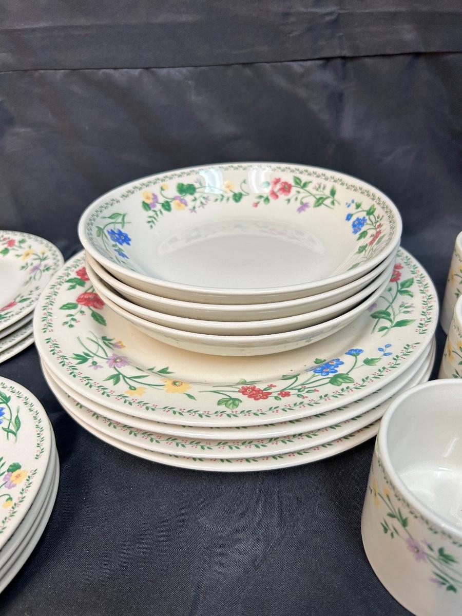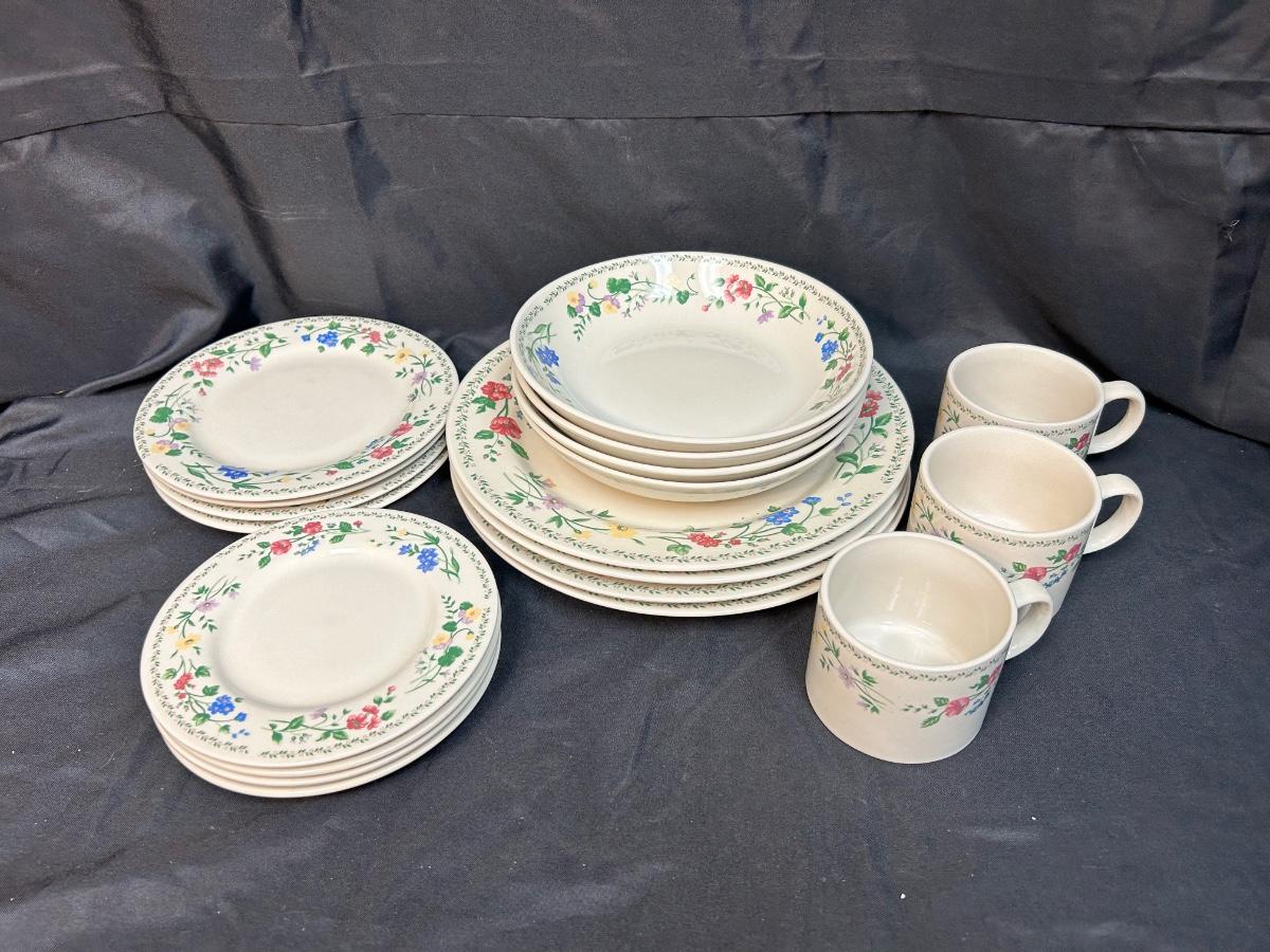 Vintage Flower Pattern Farberware Stoneware Service for Four English Garden 4241 Missing One Cup. Includes 4 pieces each dinner plate, bread plate, saucer, soup bowl and three cups. In good used condition. May have a flea bite chip or two but did not notice any major chips or damage.