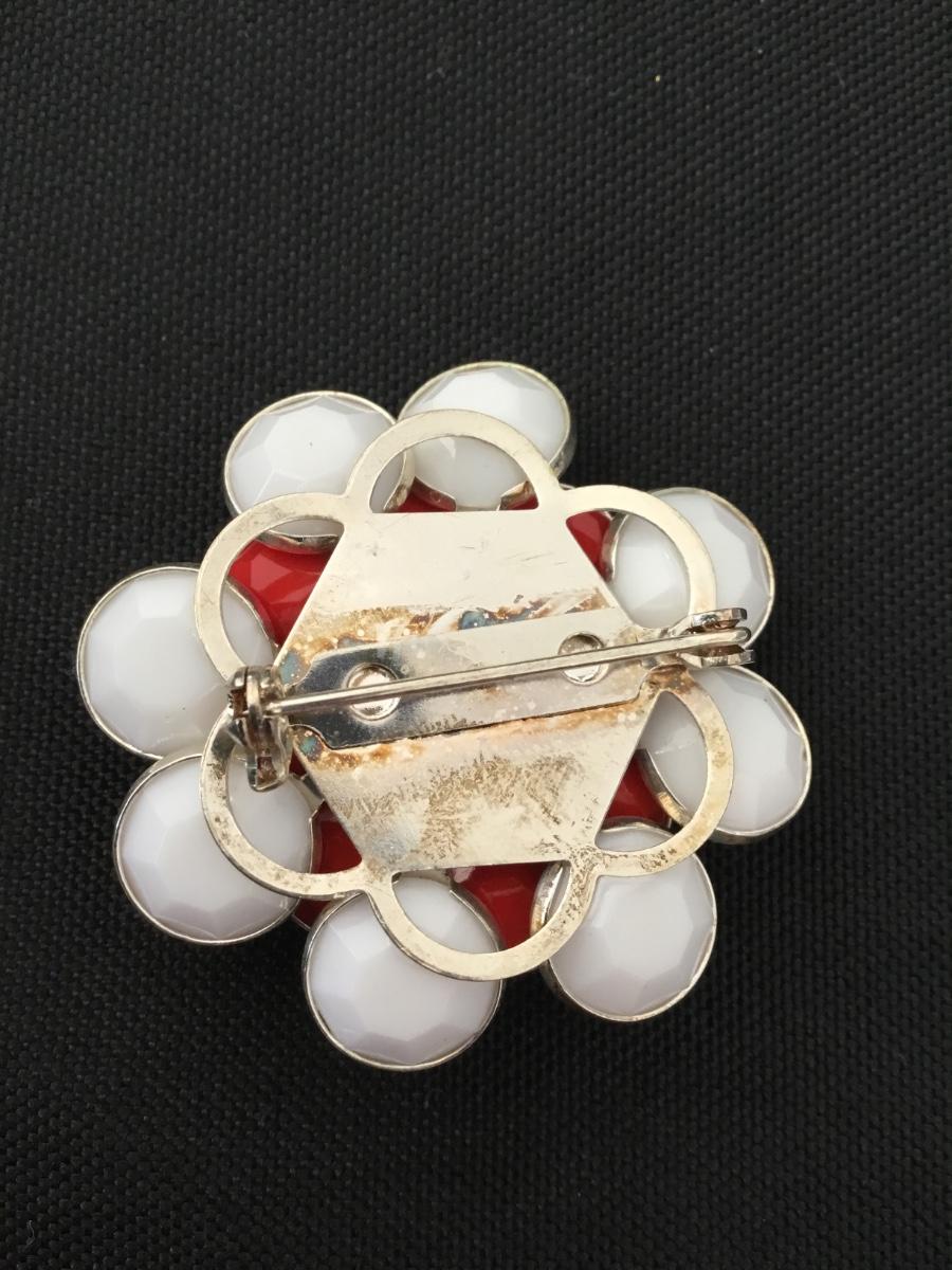 Vintage Flower rose red white blue milk glass & rhinestone silver toned brooch