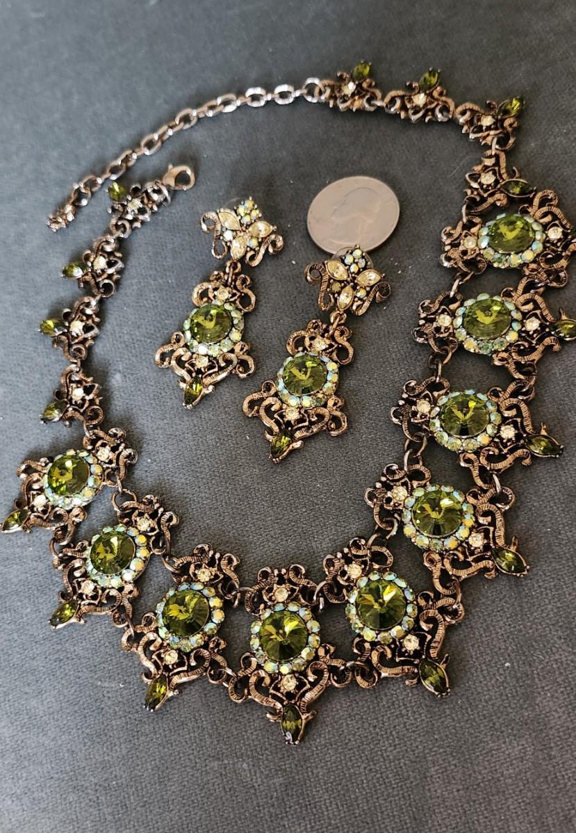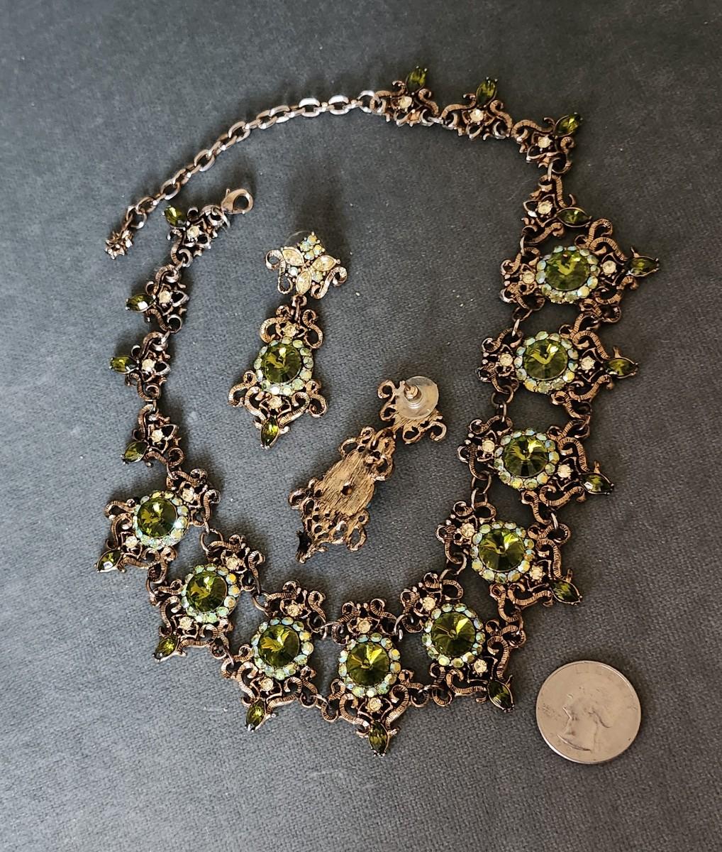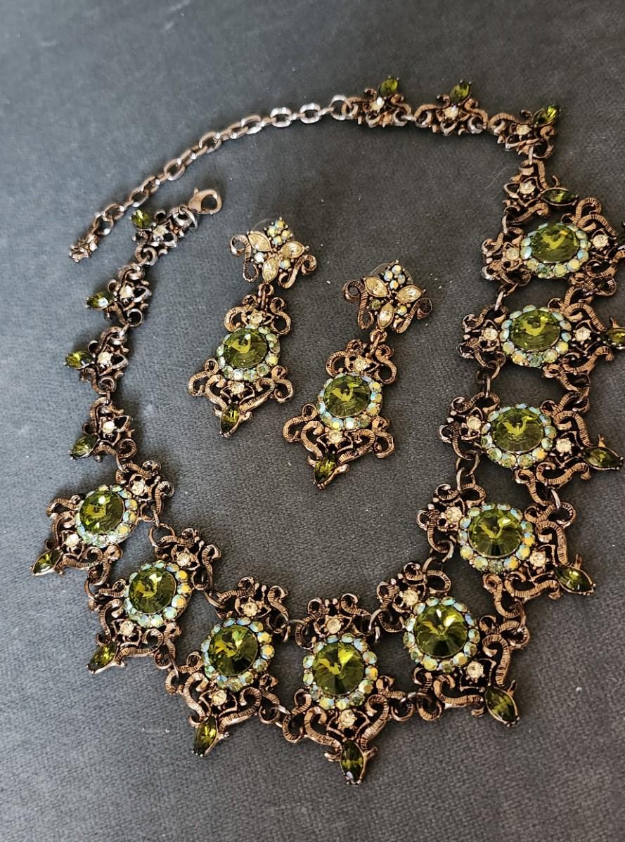 This is a visually stunning set of jewelry. Olive green rhinestones are set in an antique