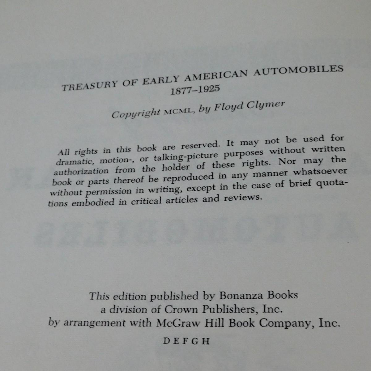 The Treasury of Early American Automobiles book is from 1950. It is includes autos from 1877 to 1925. It is written by Floyd Clymer. It does not have its dust jacket. It is about 11" x 8 3/4" x 3/4".