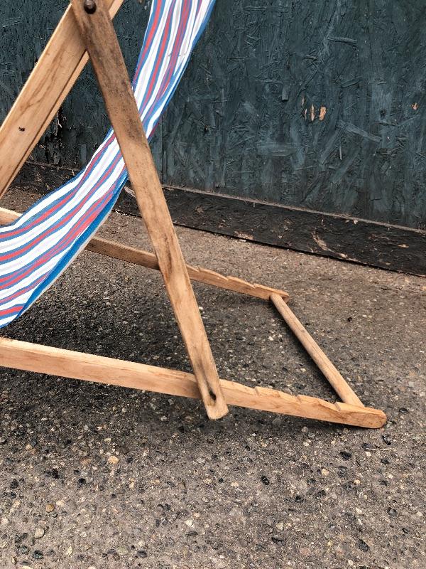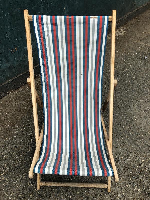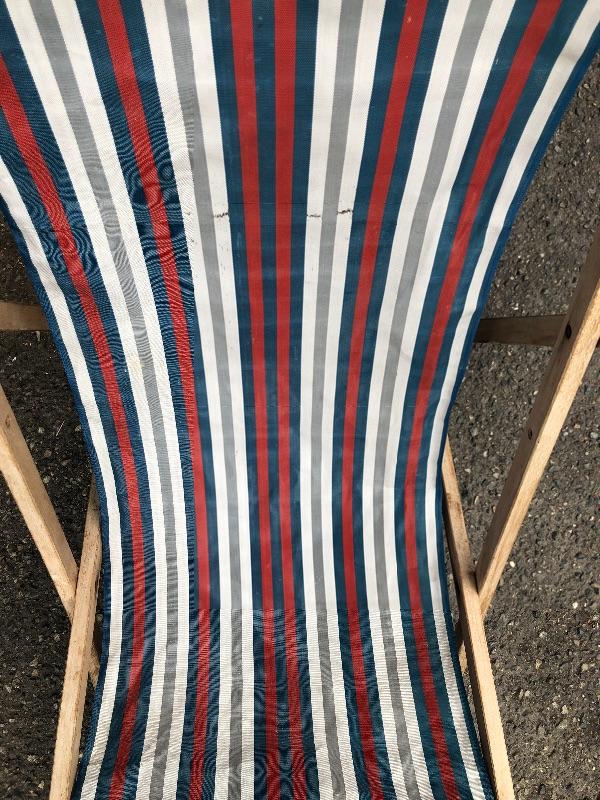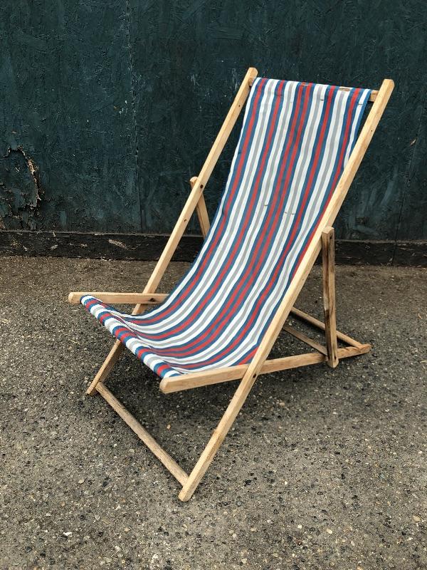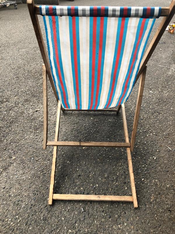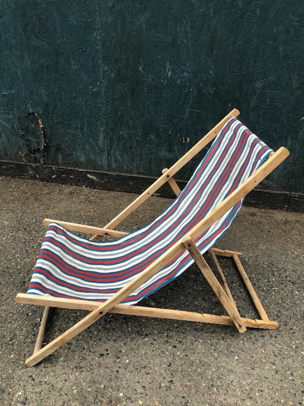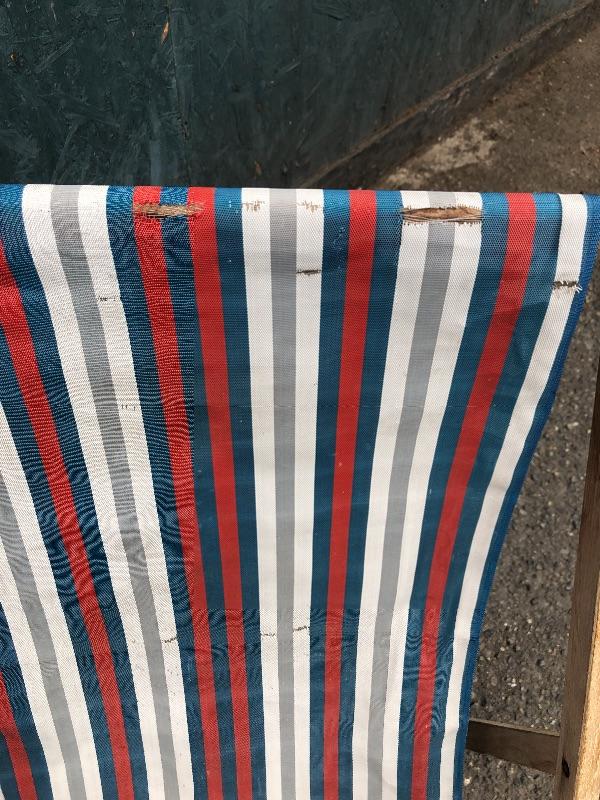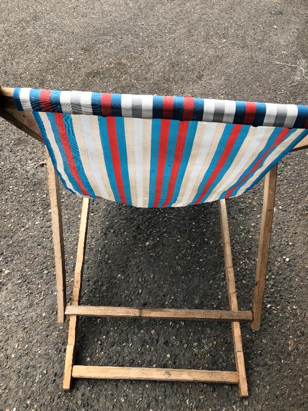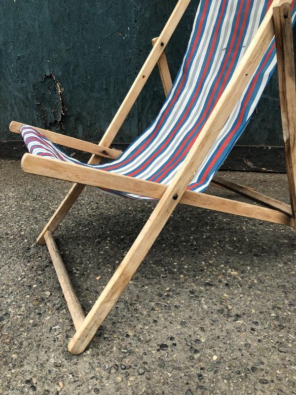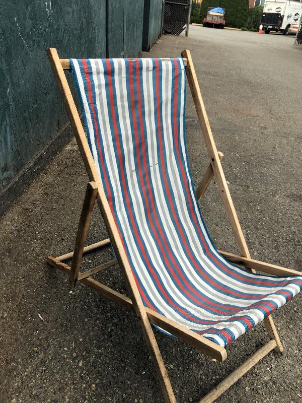 This adorable vintage chair has adjustable height and can fold down completely flat. The wood frame is in great shape, and the fabric seat show some signs of wear. Dimensions are 20"L x 36"W x 37”H