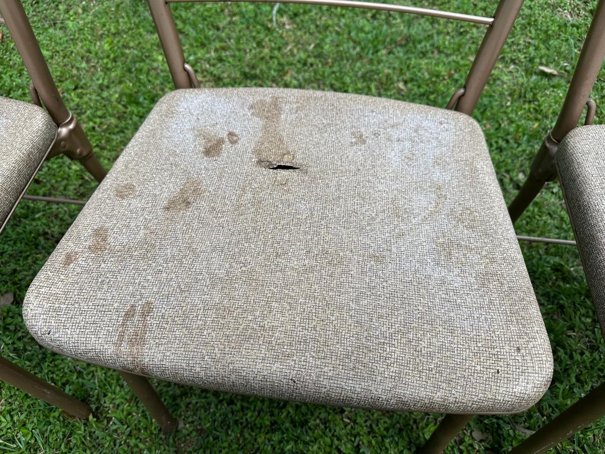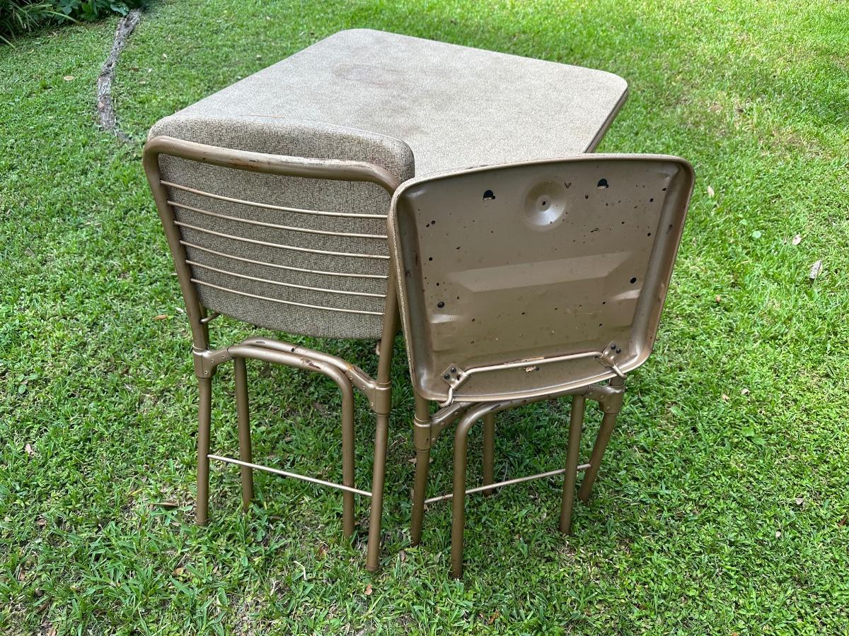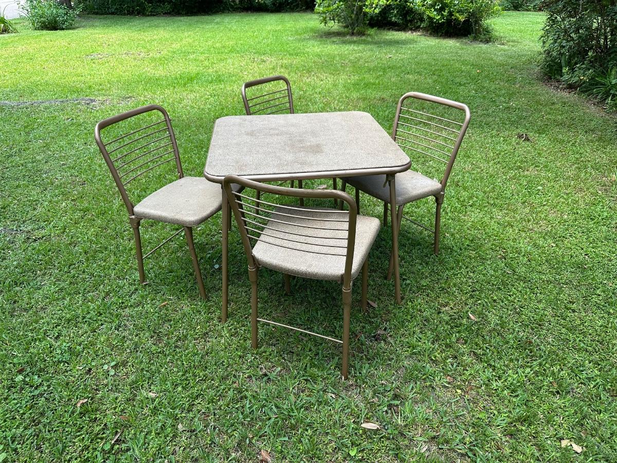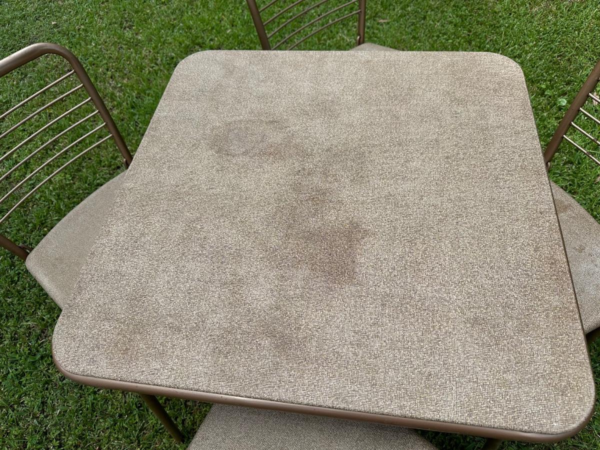There is wear to the surface and table top, see photos. Chairs and table fold away to be stored.