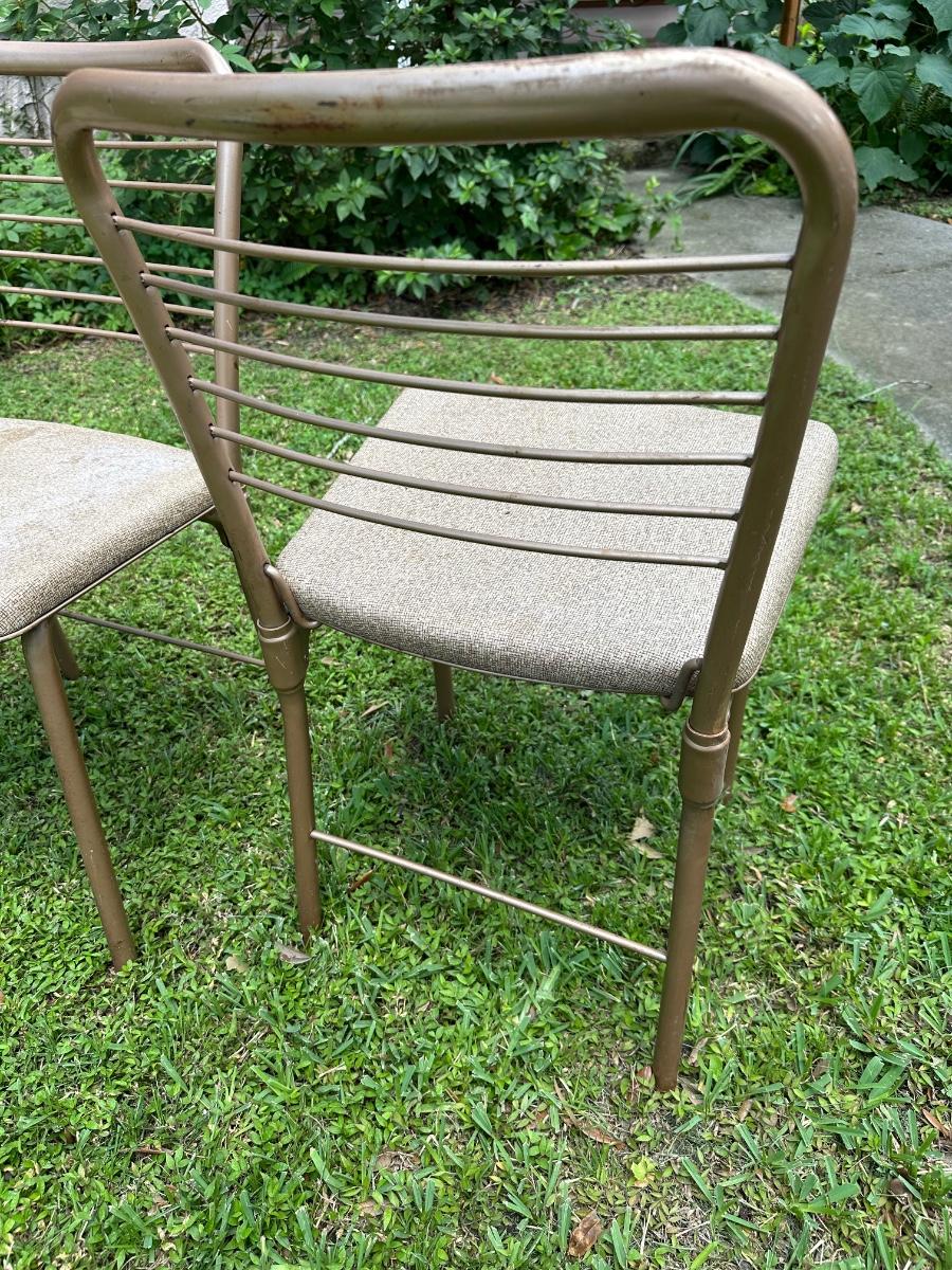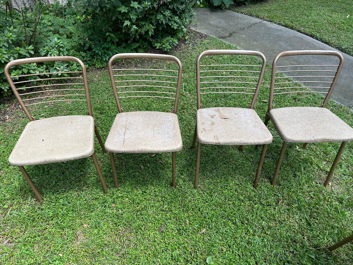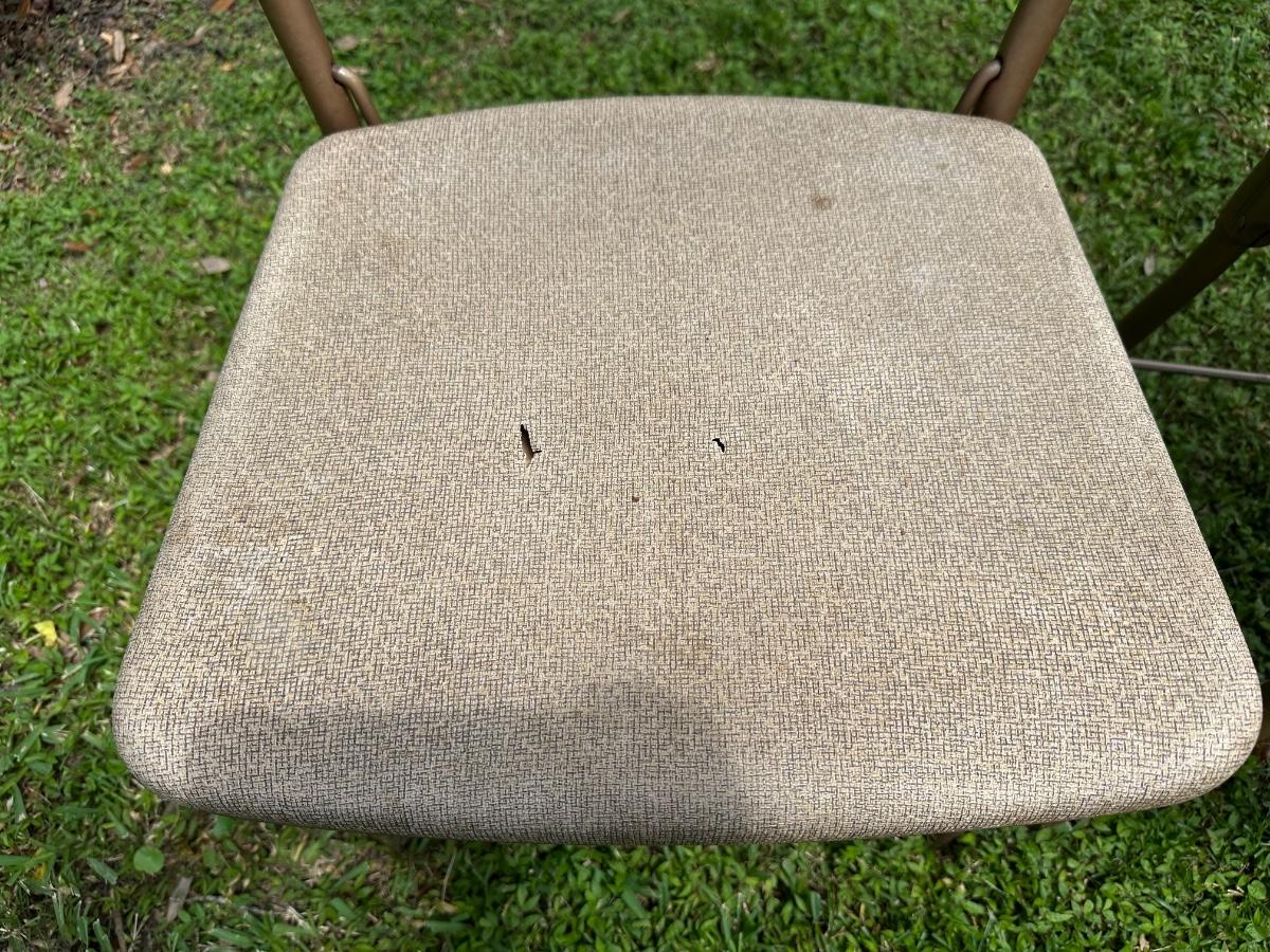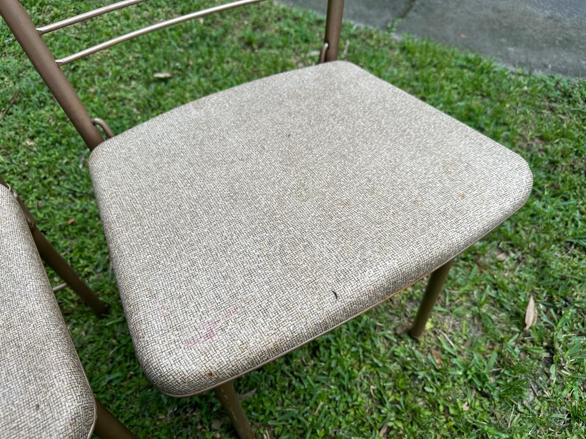 There is wear to the surface and table top, see photos. Chairs and table fold away to be stored.
