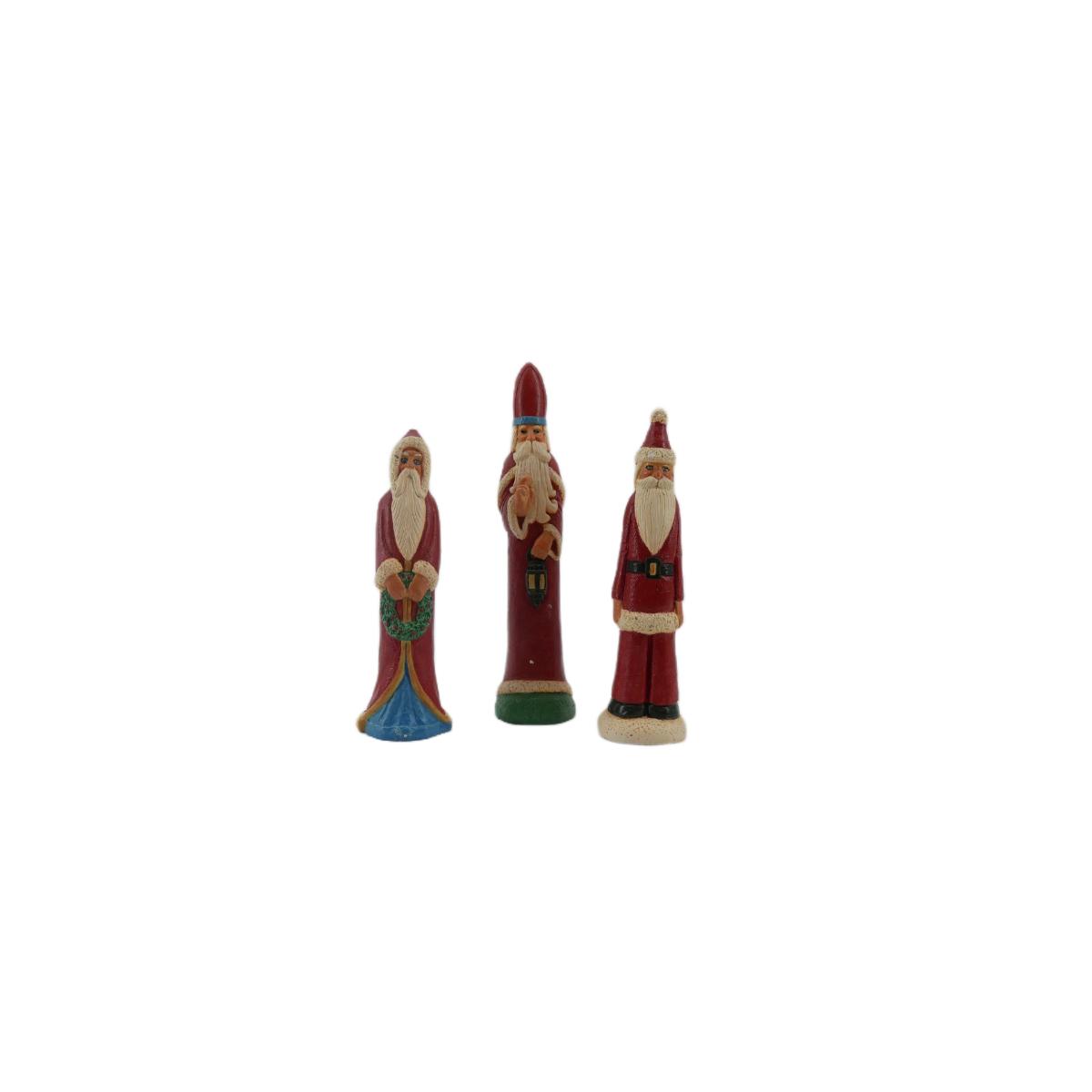 Three vintage 1990s folk art Christmas Santa Claus figurines. Both in good condition, paint wear and chipping is present. Largest measures L 2" x 7.75". One holding lantern and signed "JT 95" on bottom, one is holding wreath and is unsigned, and one is standing still and unsigned. Lot weighs 11 oz. (D82)