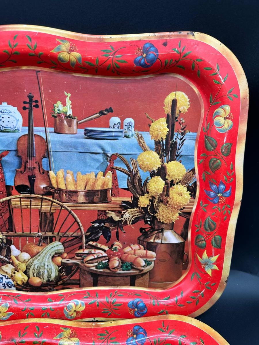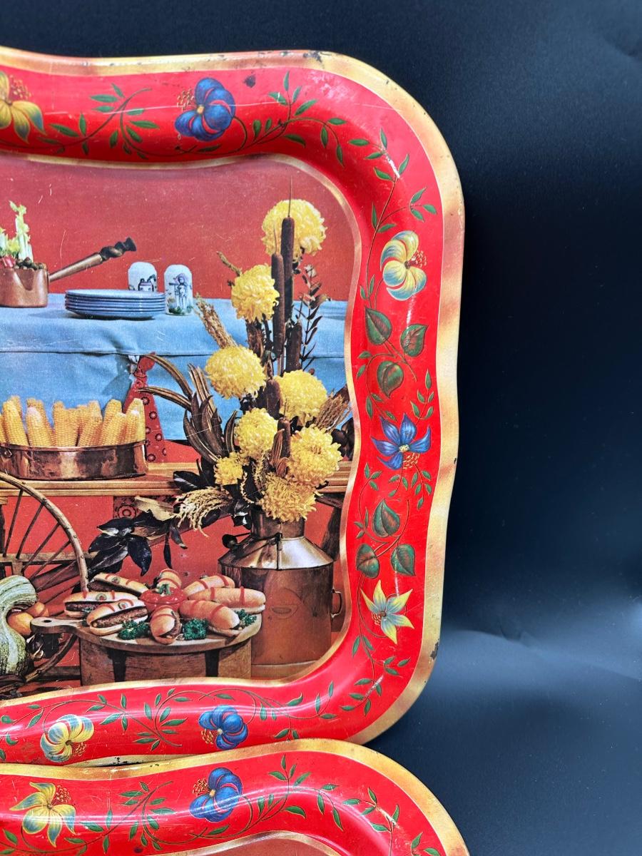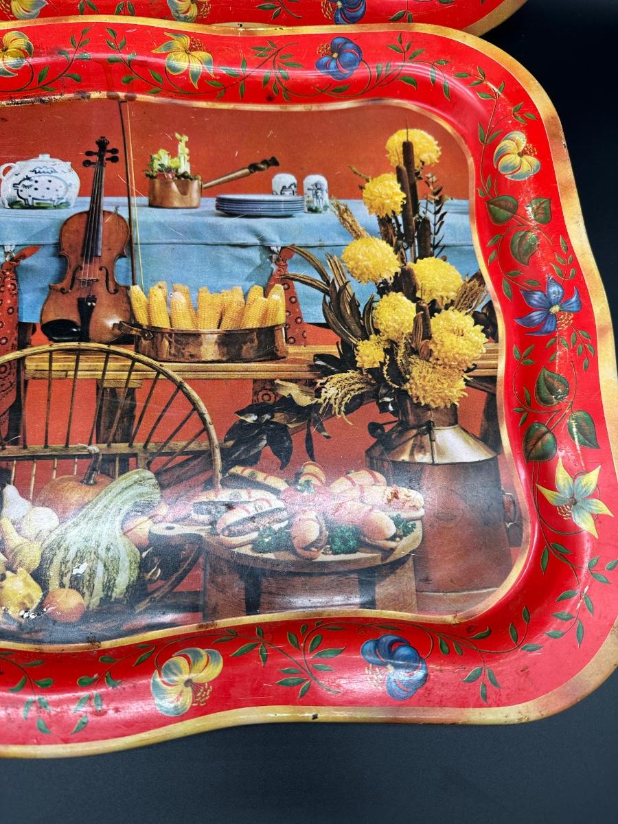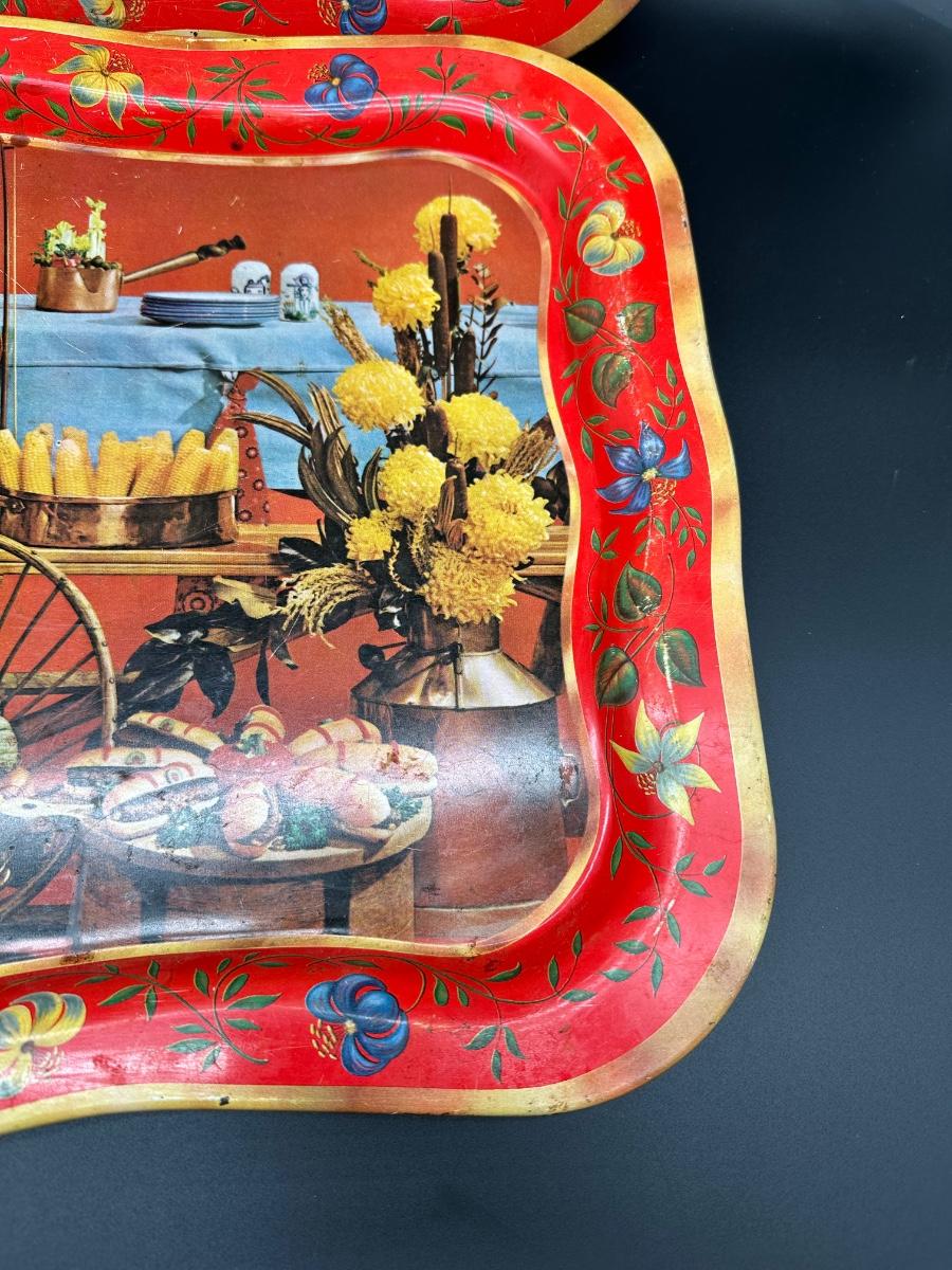Set of two vintage metal serving trays featuring a colorful folk-art style still life scene with flowers, bread, produce, and rustic kitchen décor.