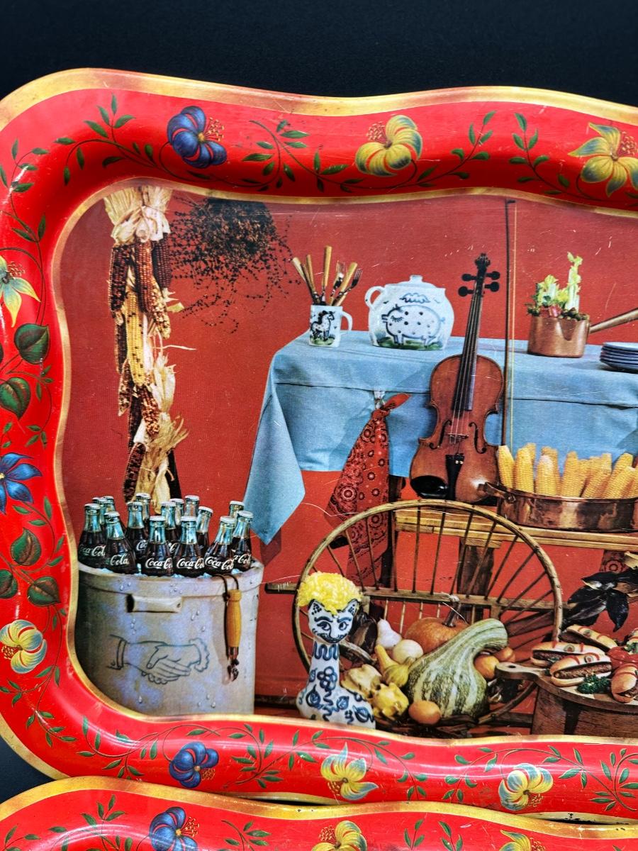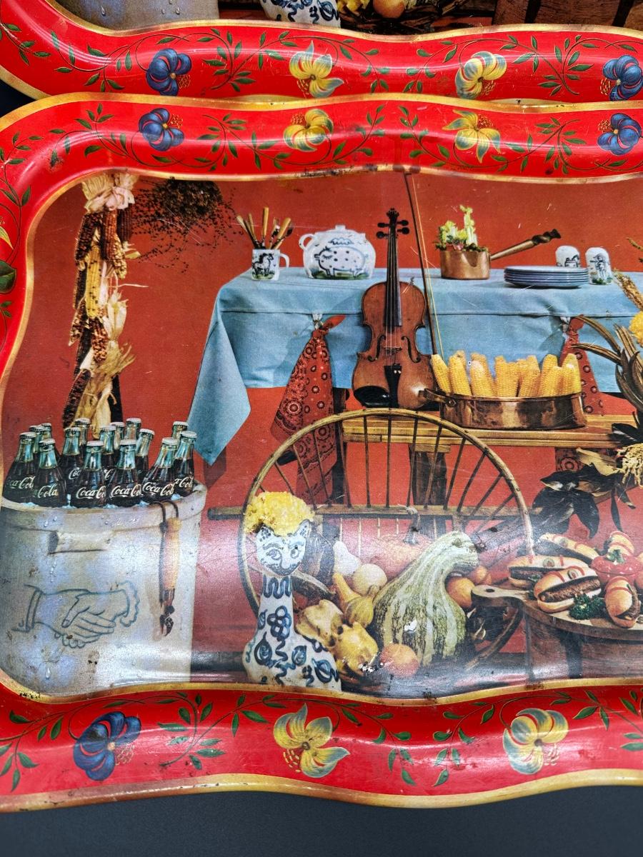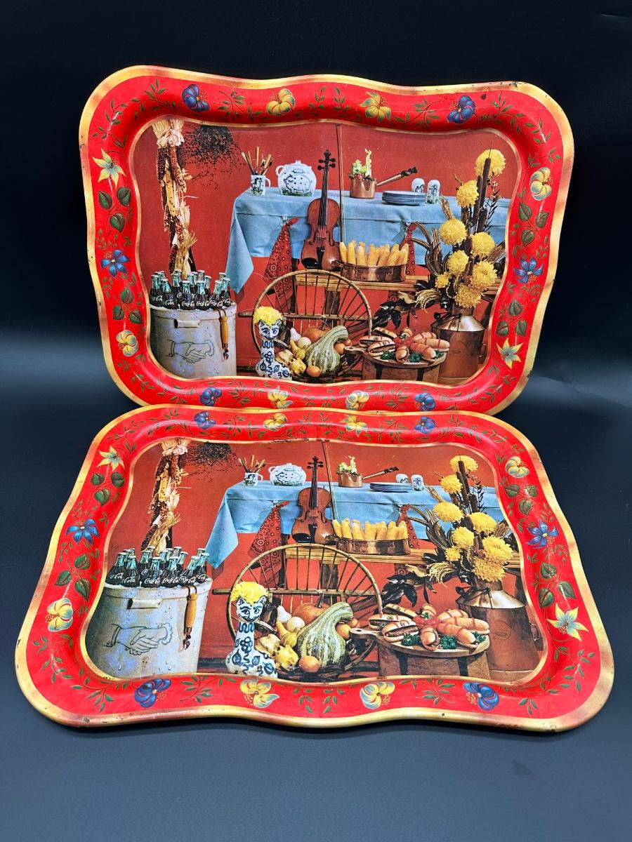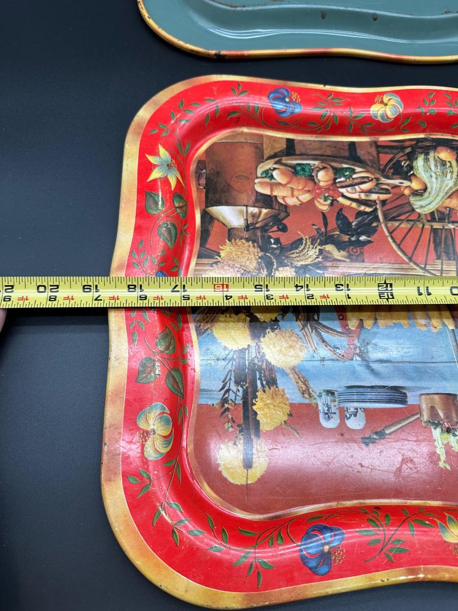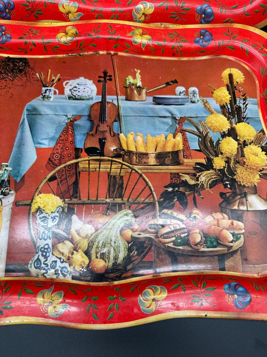 Set of two vintage metal serving trays featuring a colorful folk-art style still life scene with flowers, bread, produce, and rustic kitchen décor.