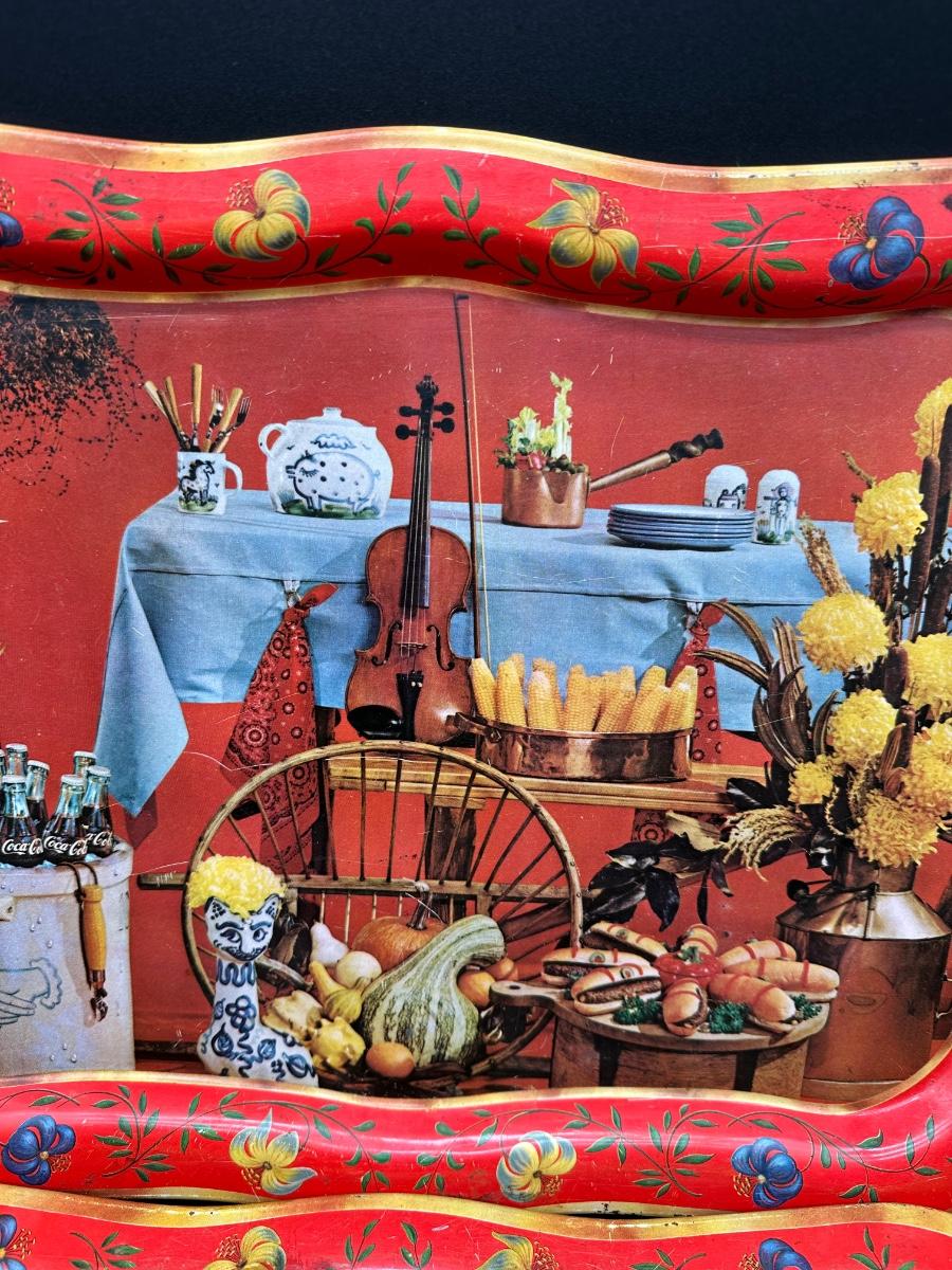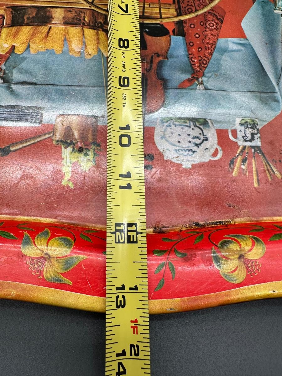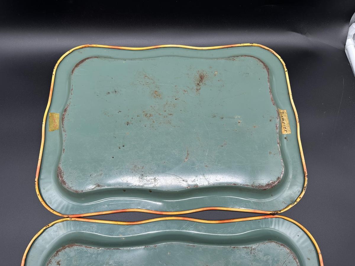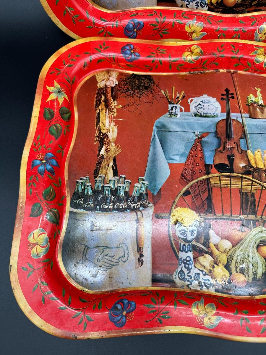 Set of two vintage metal serving trays featuring a colorful folk-art style still life scene with flowers, bread, produce, and rustic kitchen décor.