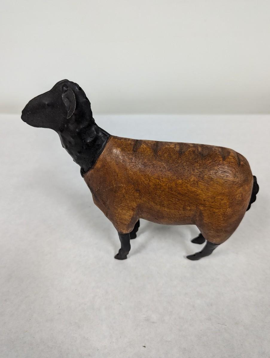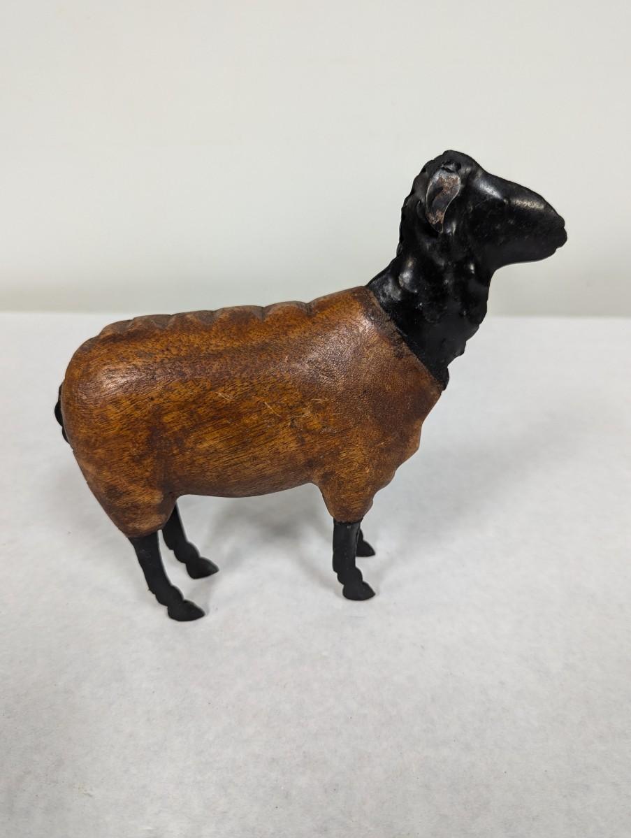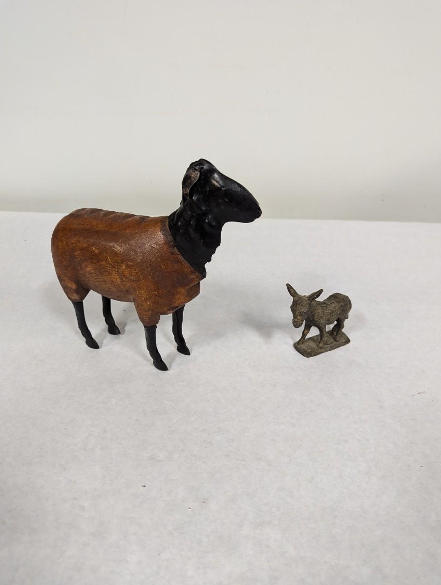 Vintage Folk Art Wood Carved Sheep With Metal & Brass Donkey