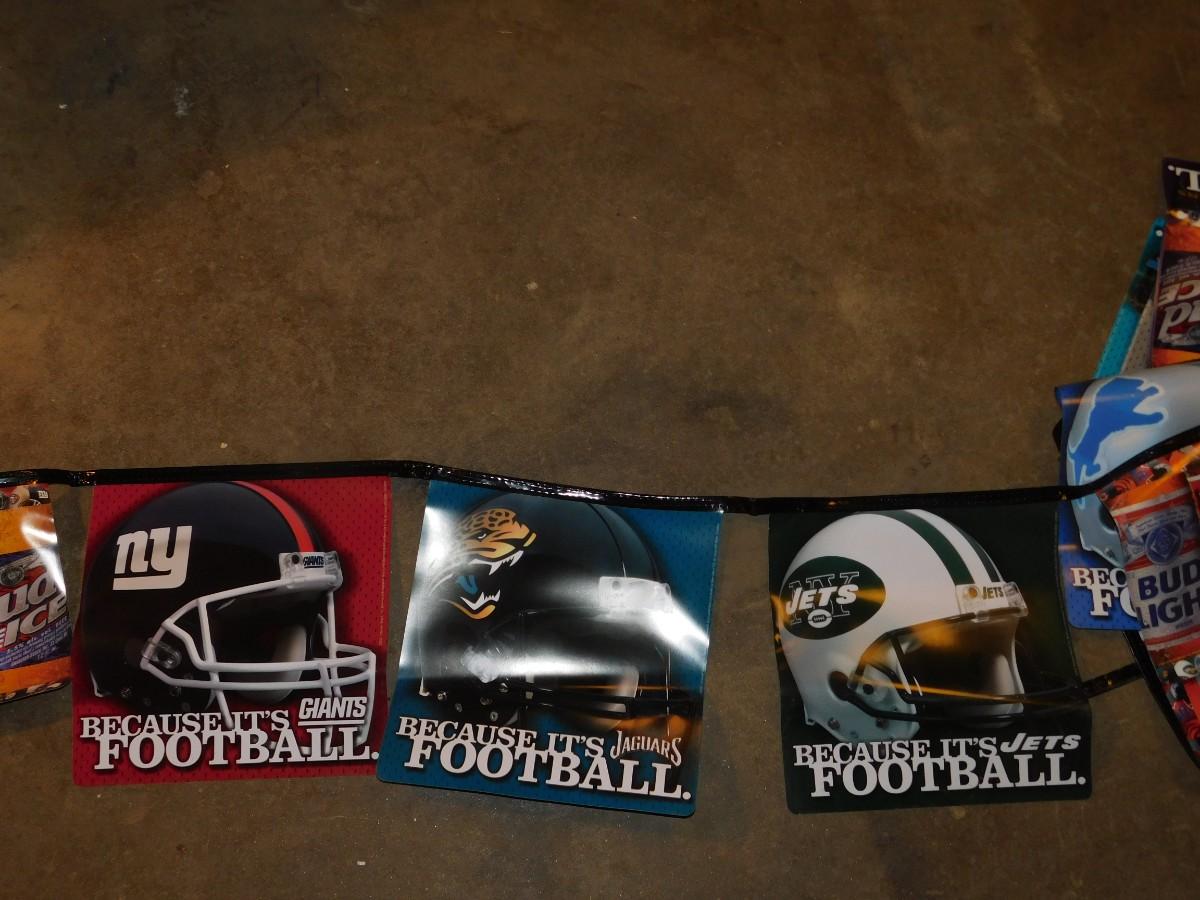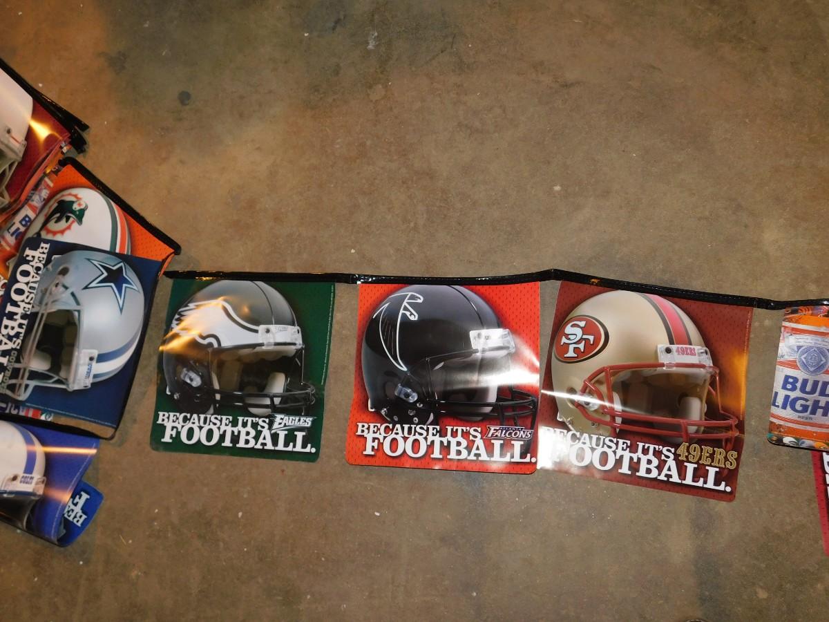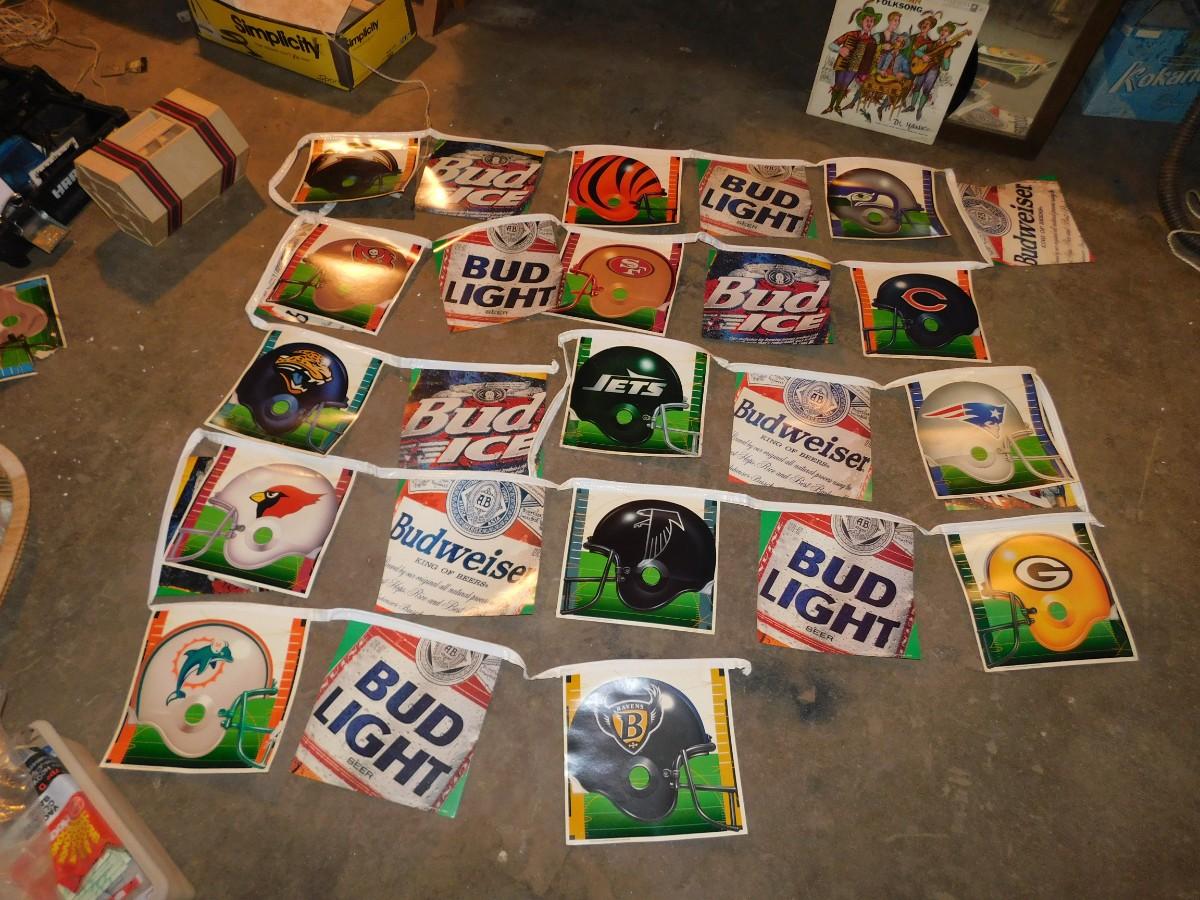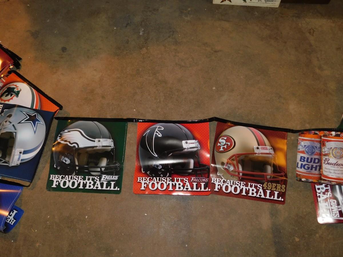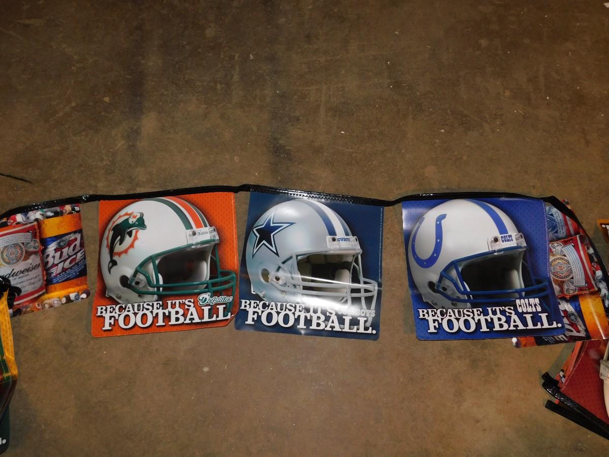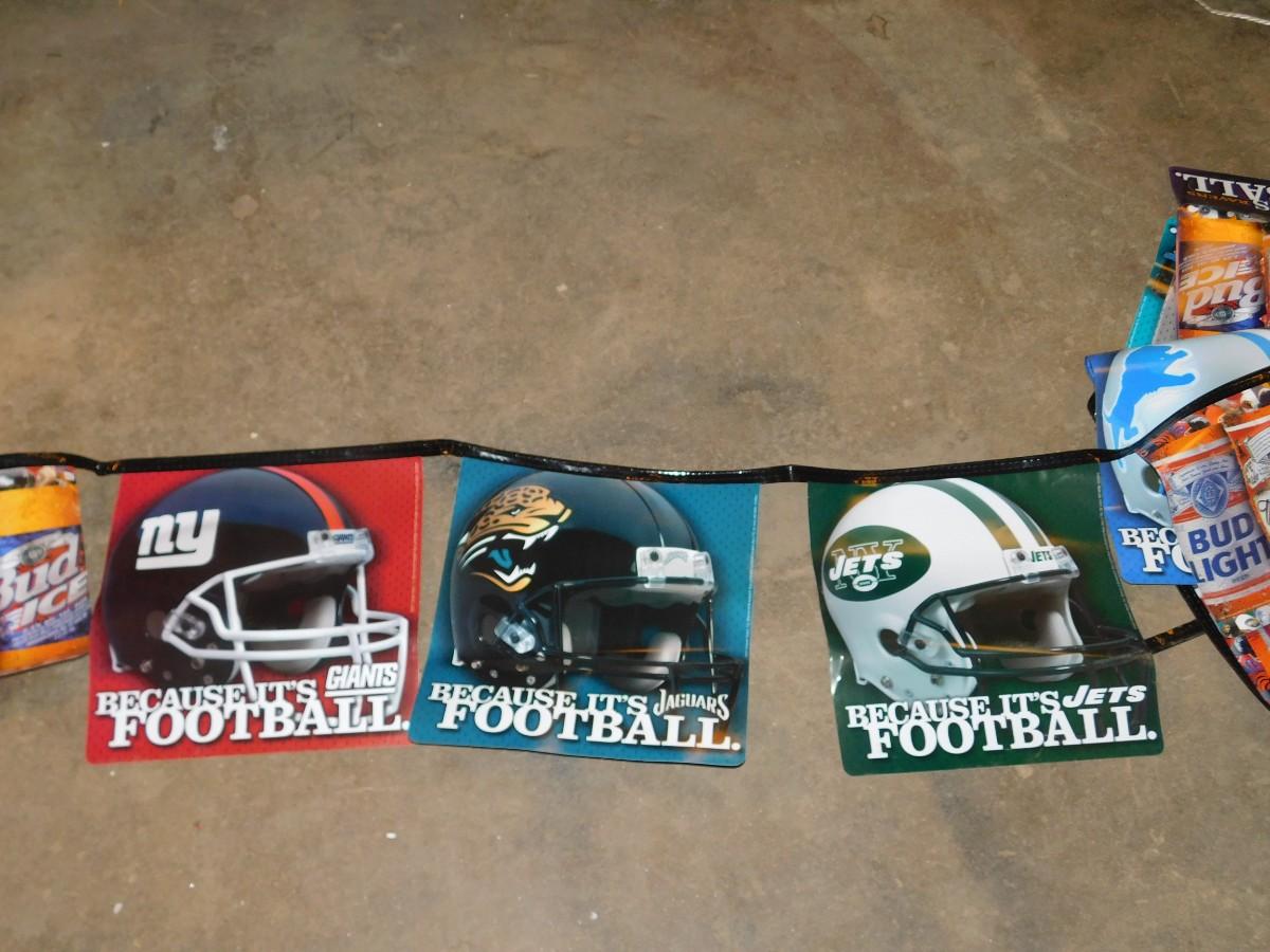 WHITE STREAMER IS MISSING COWBOYS AND JAGUARS. THE HELMETS MEASURE ABOUT 11-1/2" WIDE. THE BUD BANNER IN 112" X 36" AND THE CORONA BANNER IS 68" X 34"