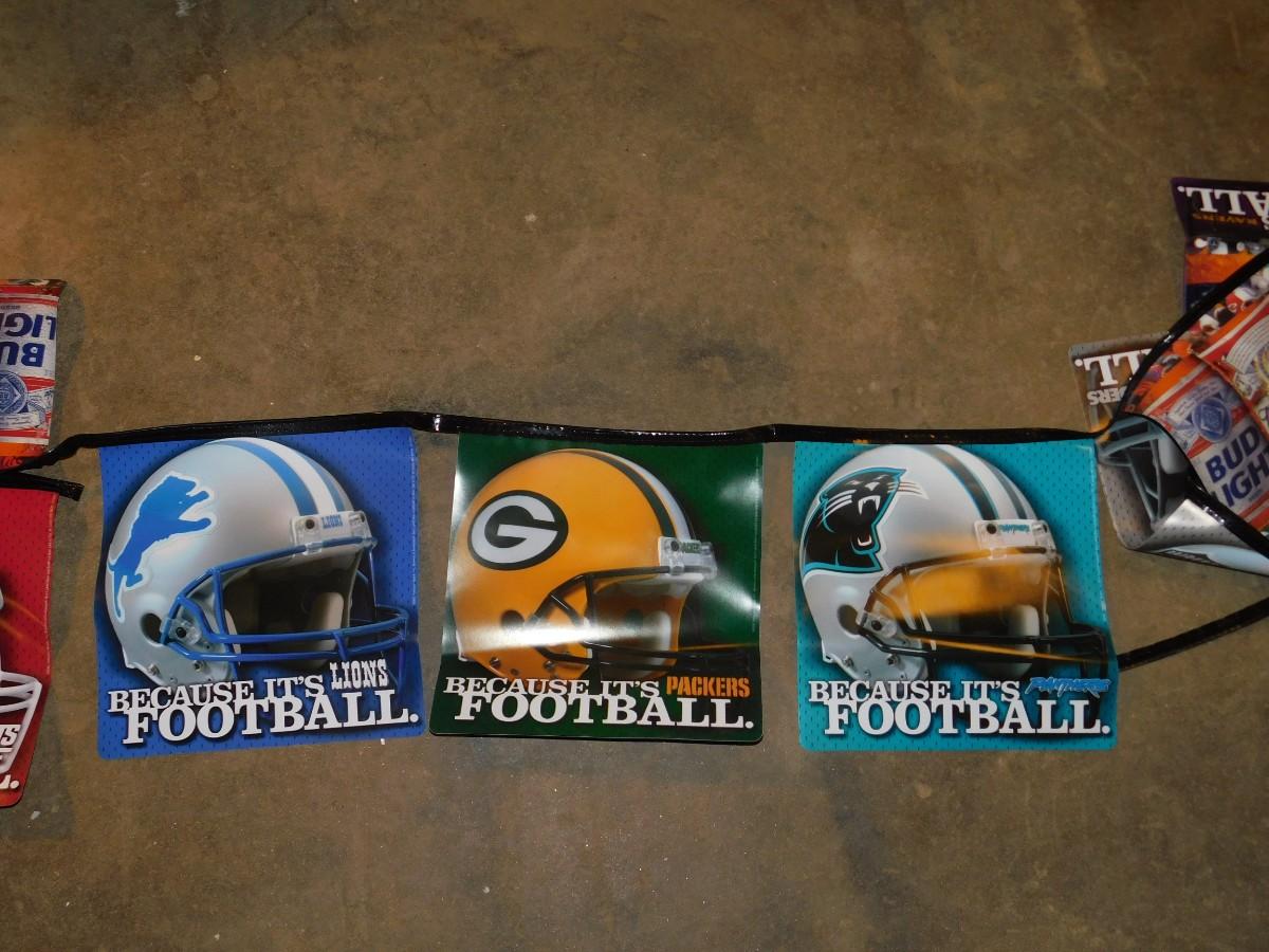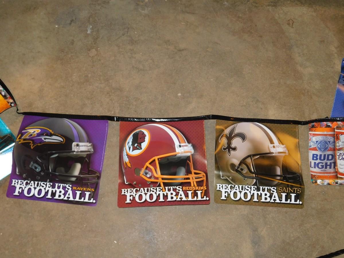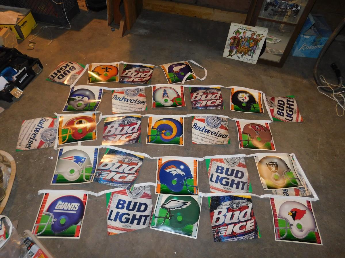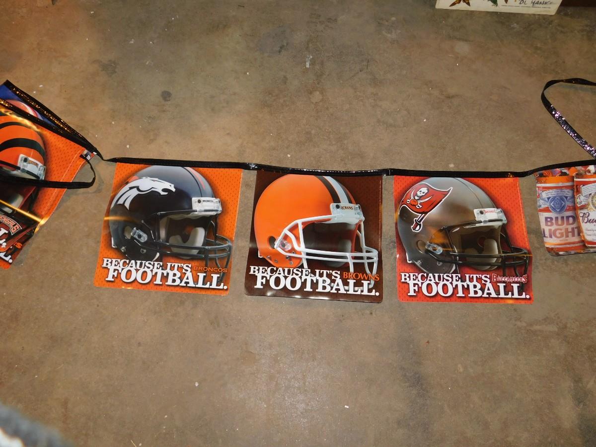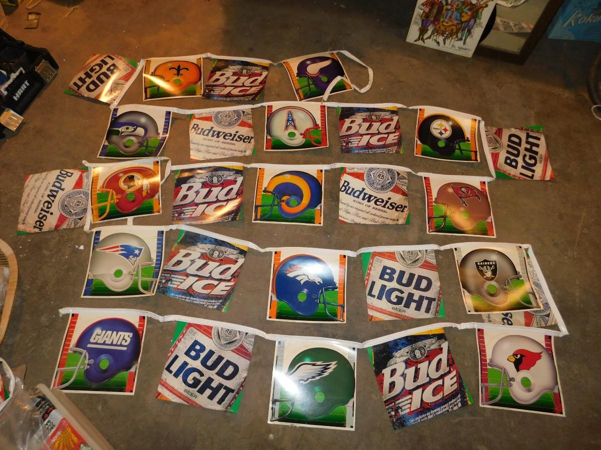 WHITE STREAMER IS MISSING COWBOYS AND JAGUARS. THE HELMETS MEASURE ABOUT 11-1/2" WIDE. THE BUD BANNER IN 112" X 36" AND THE CORONA BANNER IS 68" X 34"