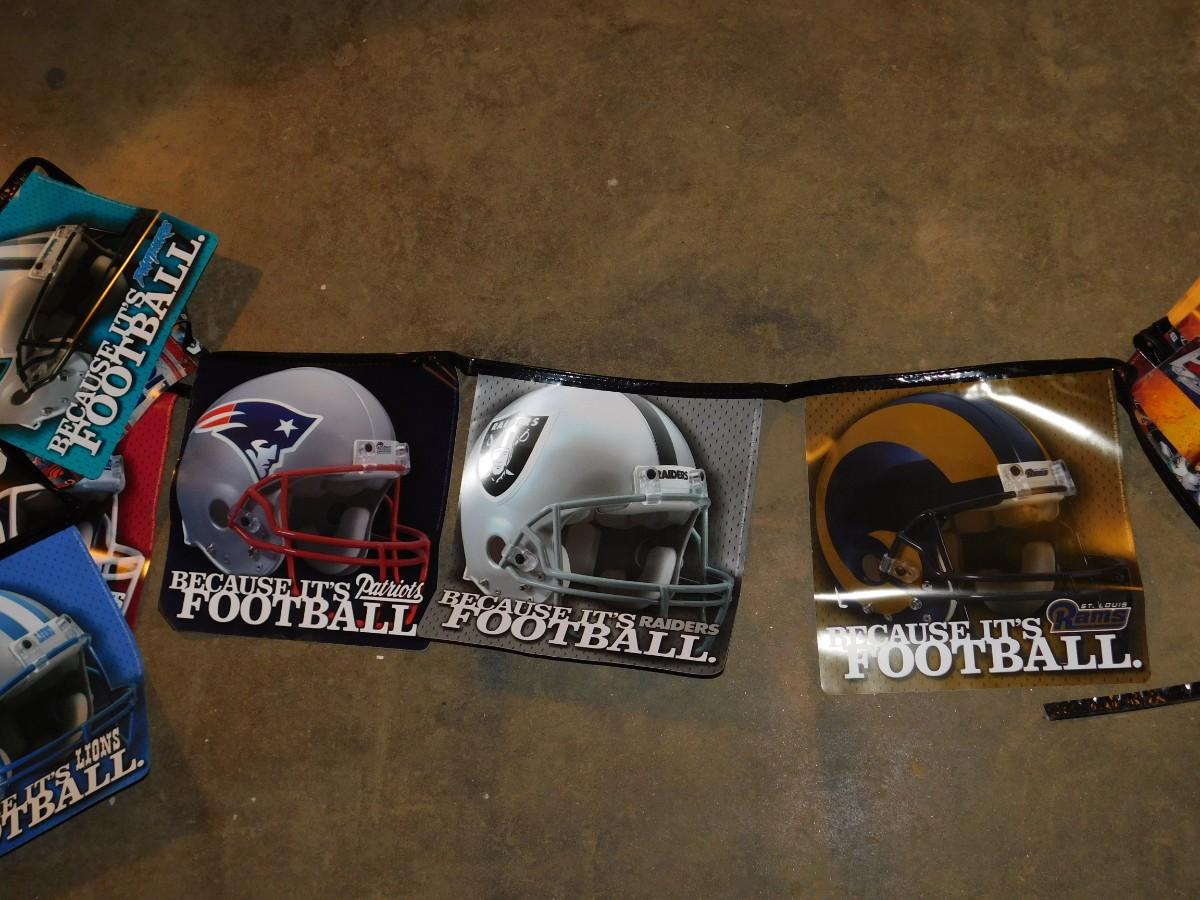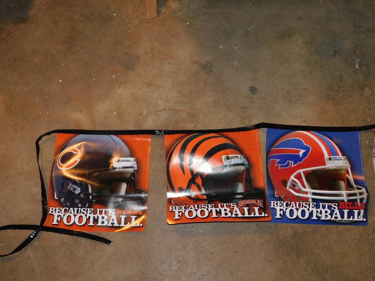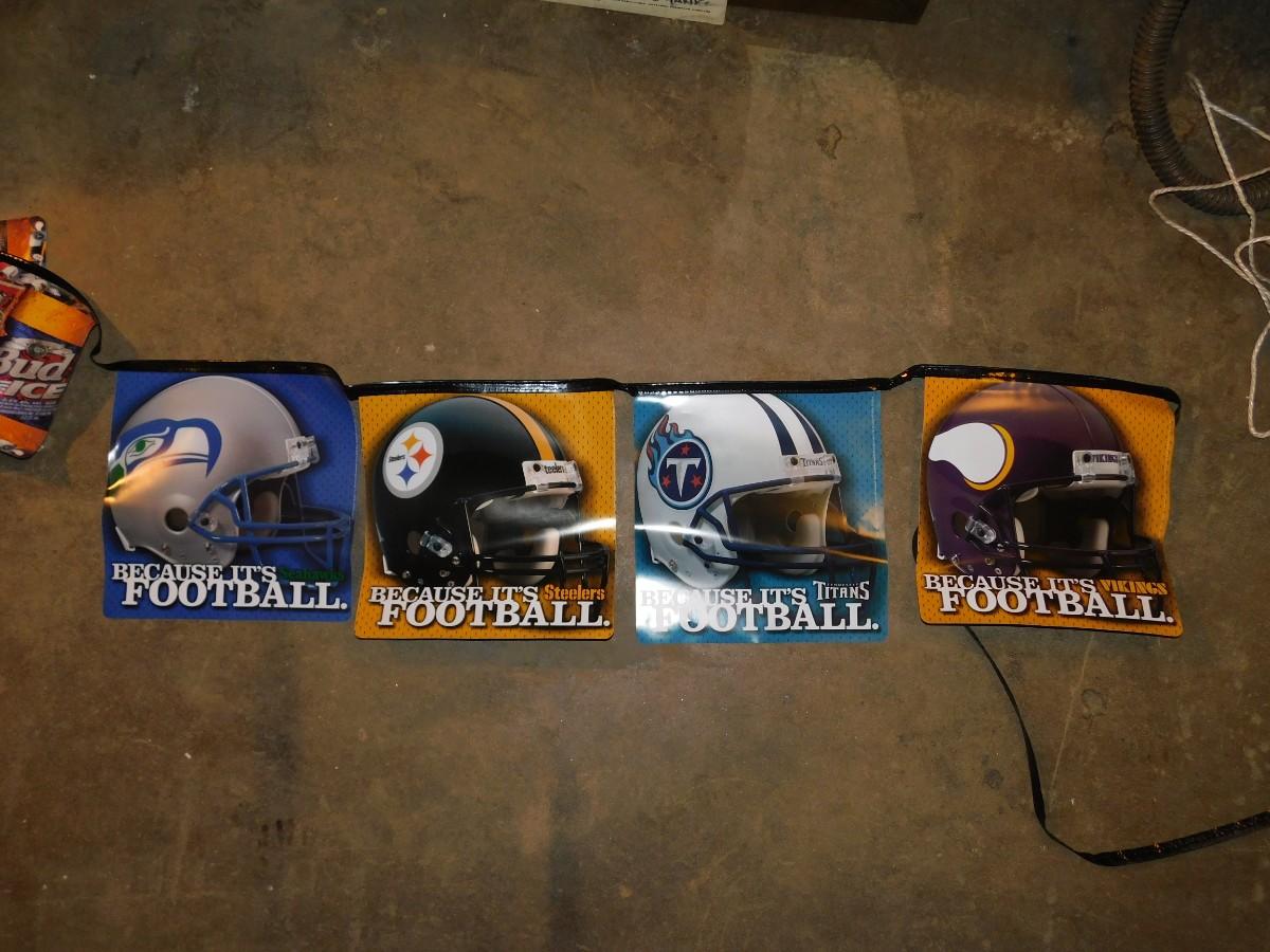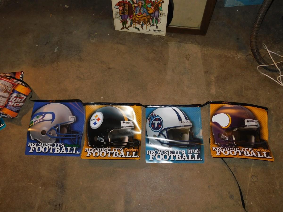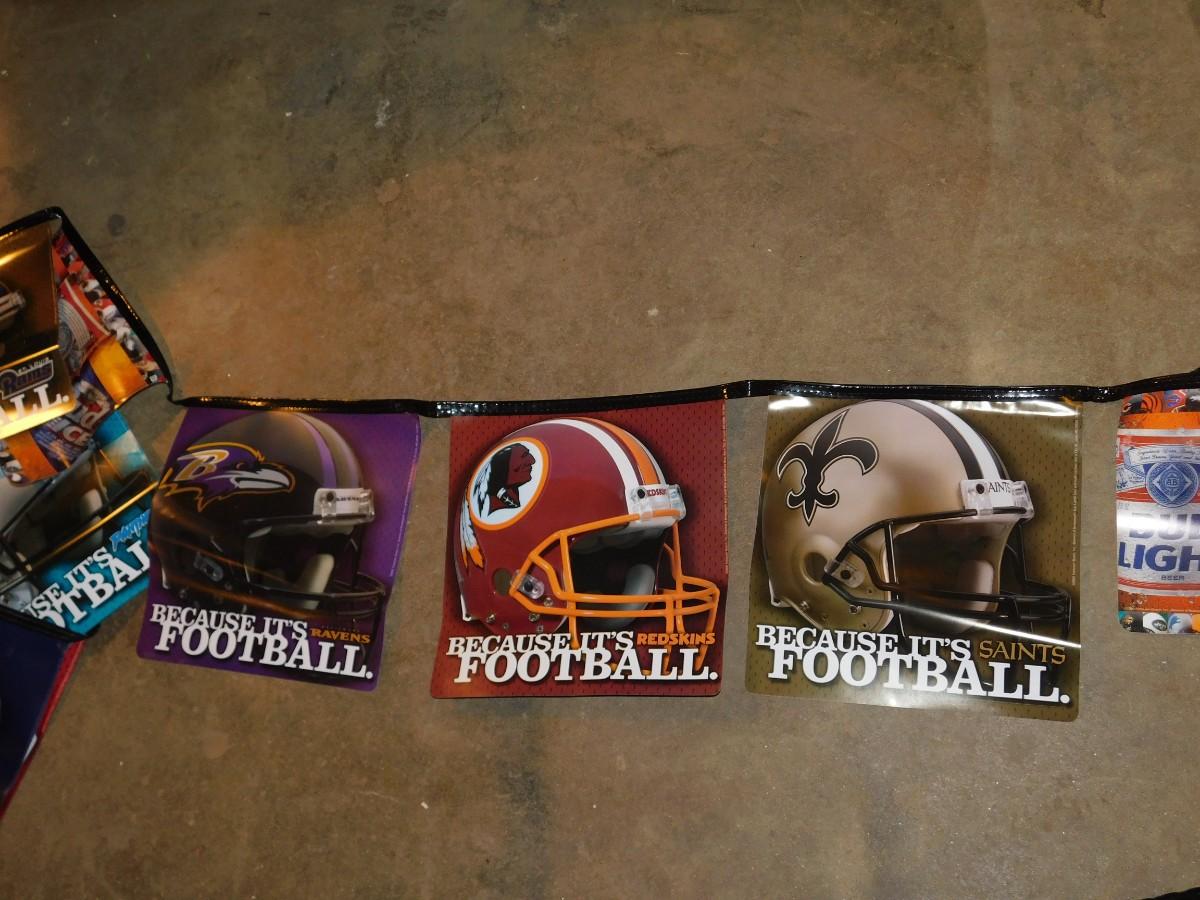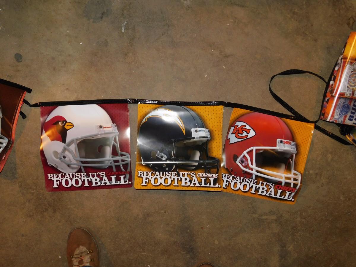 WHITE STREAMER IS MISSING COWBOYS AND JAGUARS. THE HELMETS MEASURE ABOUT 11-1/2" WIDE. THE BUD BANNER IN 112" X 36" AND THE CORONA BANNER IS 68" X 34"