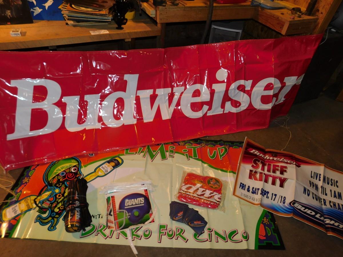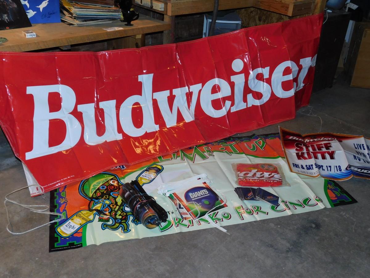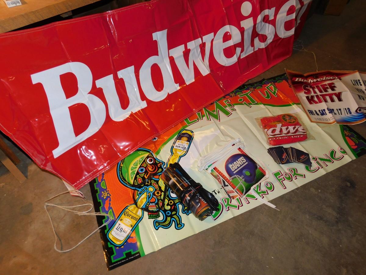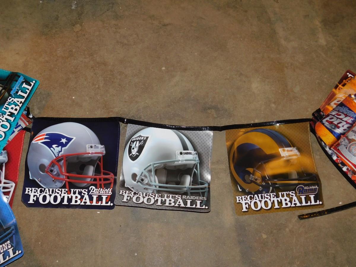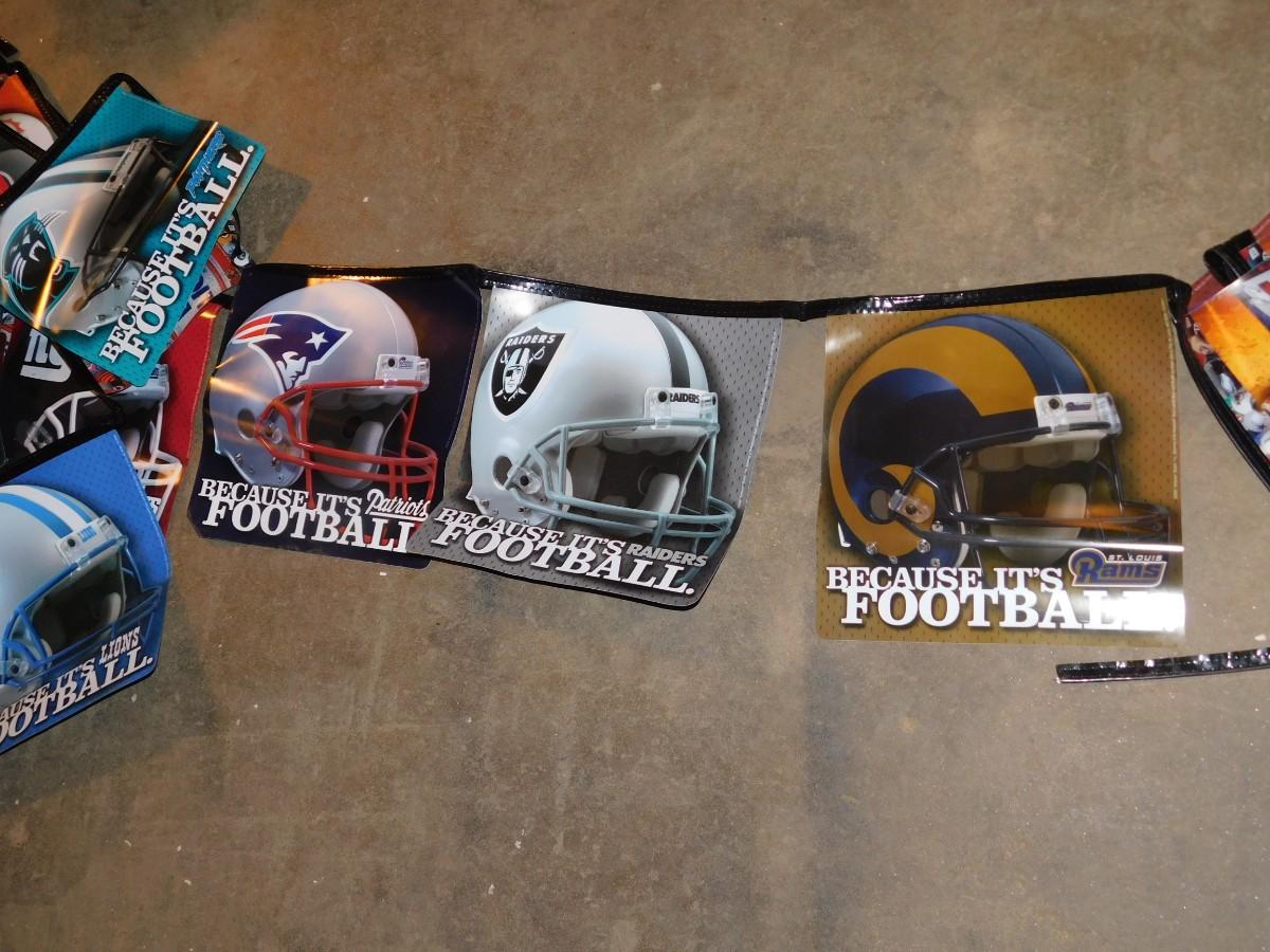 WHITE STREAMER IS MISSING COWBOYS AND JAGUARS. THE HELMETS MEASURE ABOUT 11-1/2" WIDE. THE BUD BANNER IN 112" X 36" AND THE CORONA BANNER IS 68" X 34"