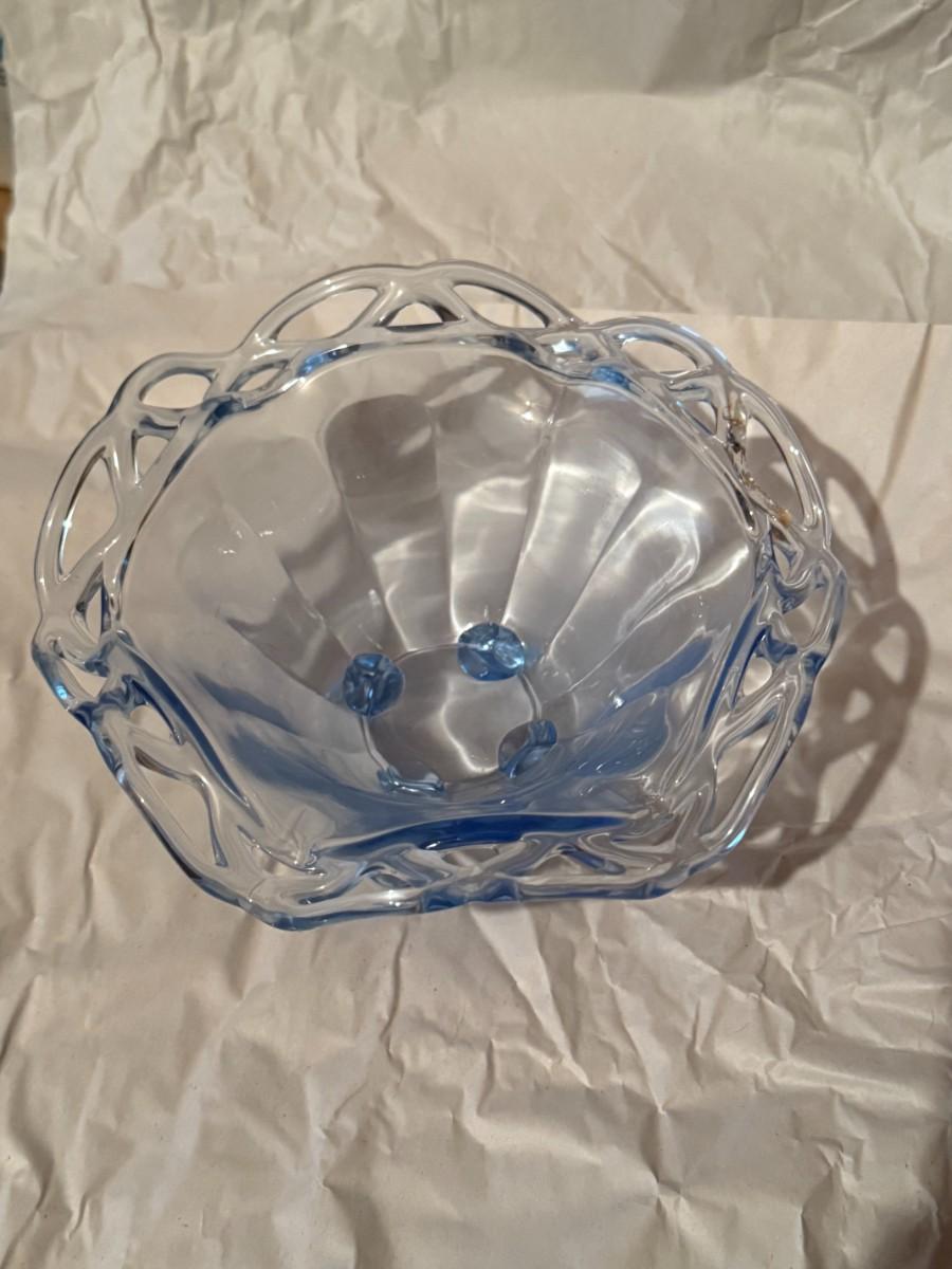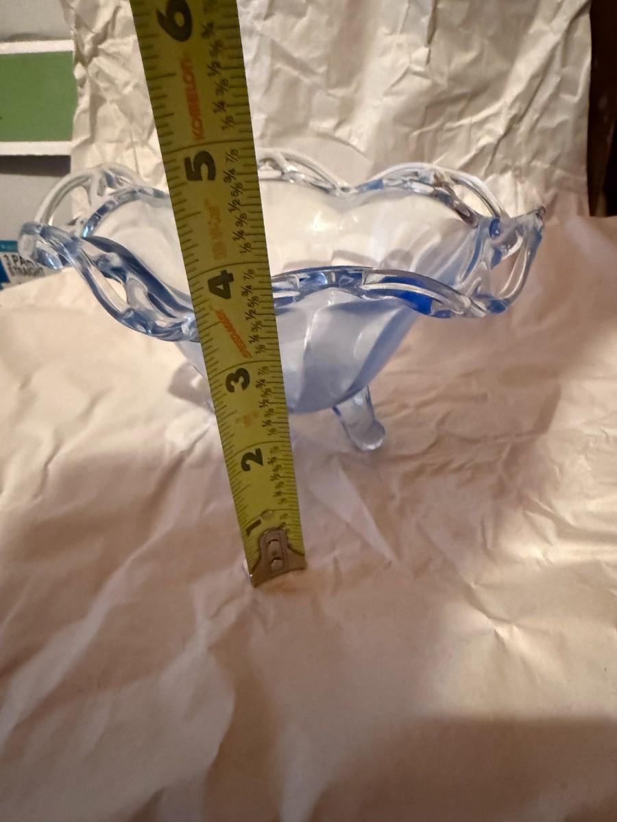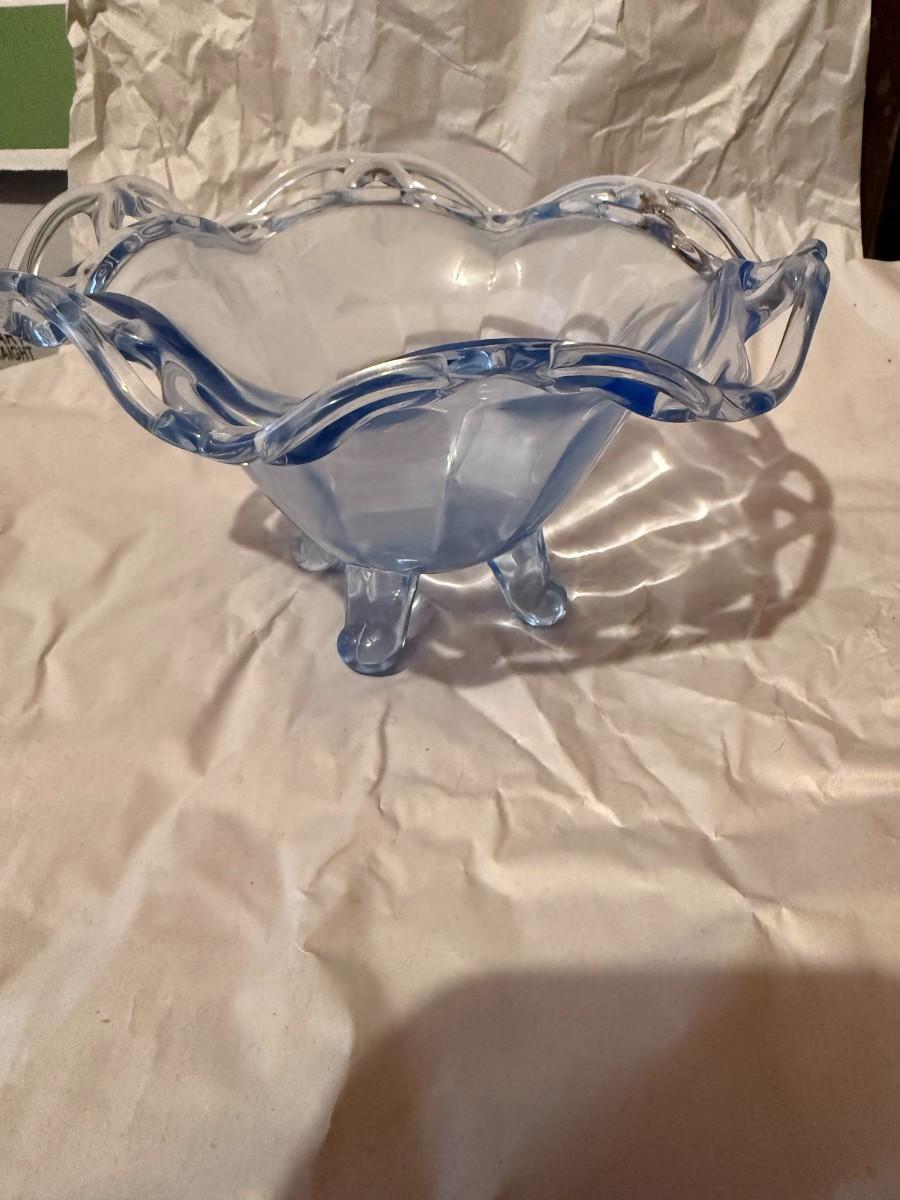 Vintage Footed Blue Glass Bowl: An elegant footed blue glass bowl that is both functional and a striking decorative piece, perfect for serving or display.