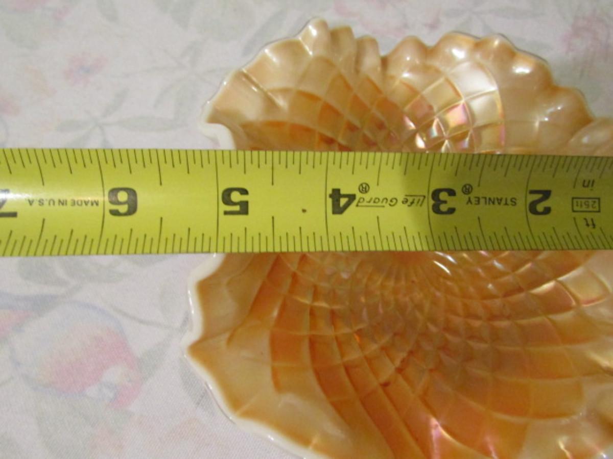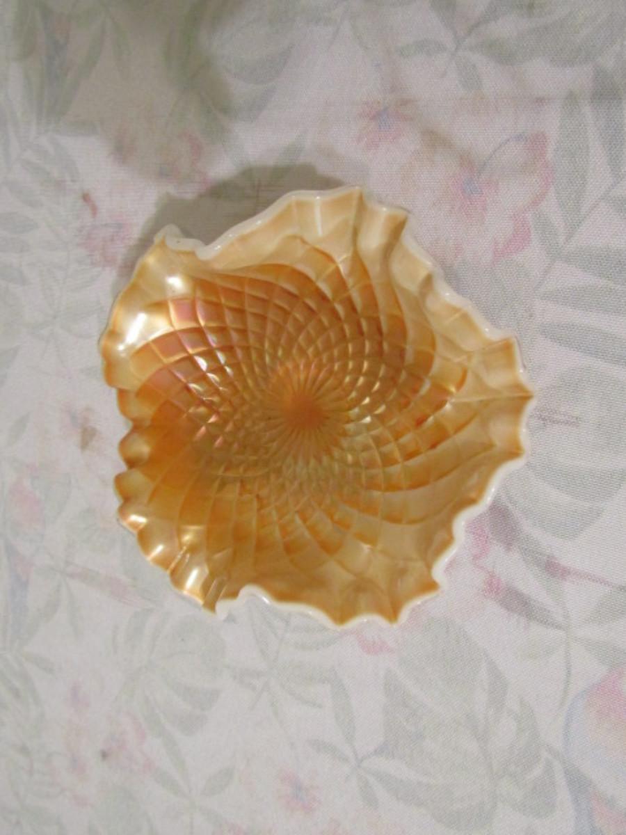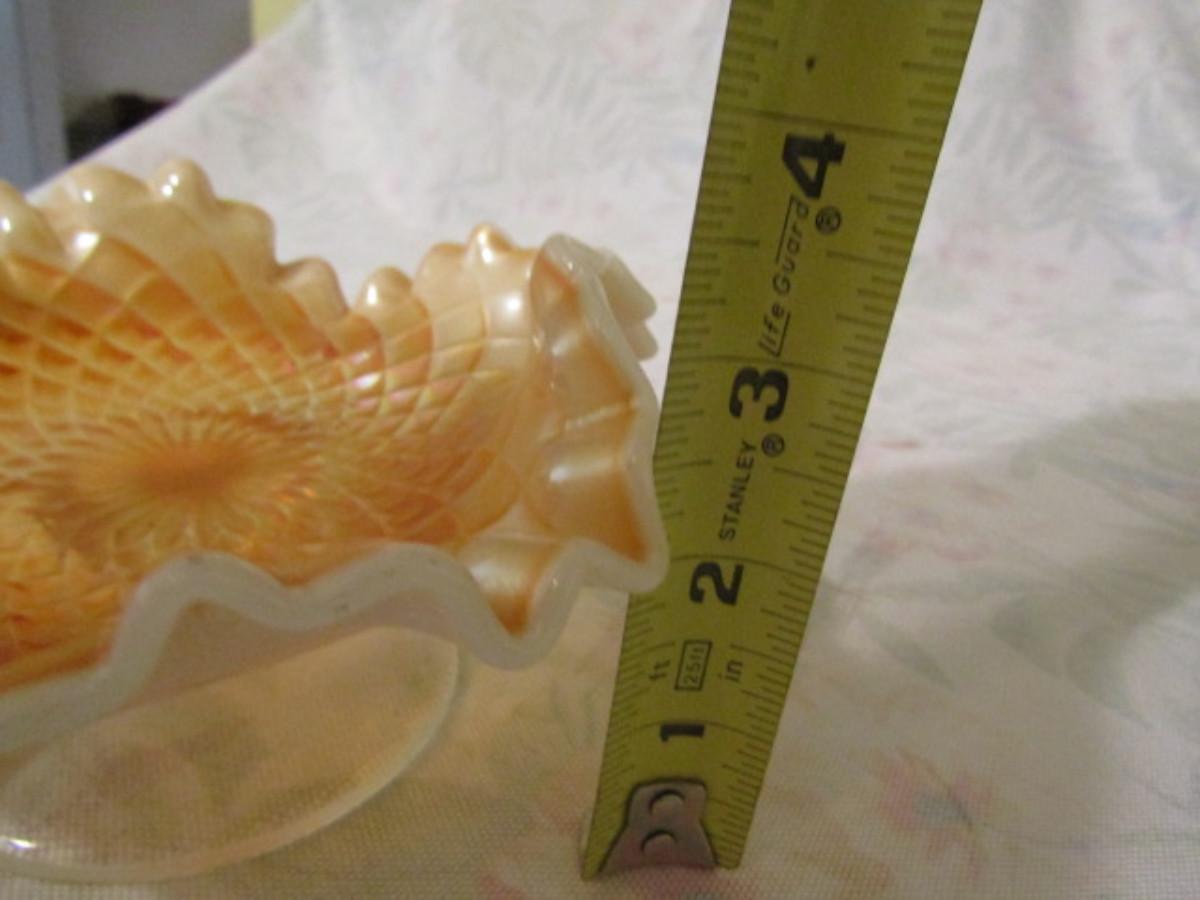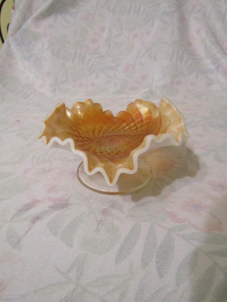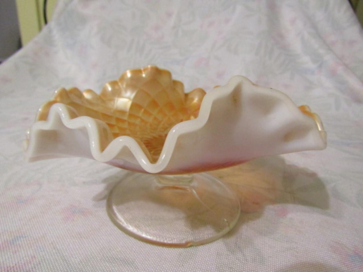 Vintage Footed Marigold on White Ruffled Edge Dish- Iridescent Carnival Glass